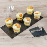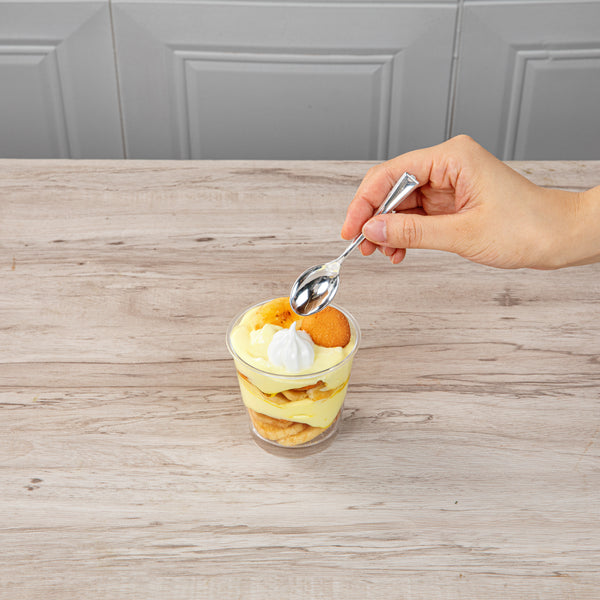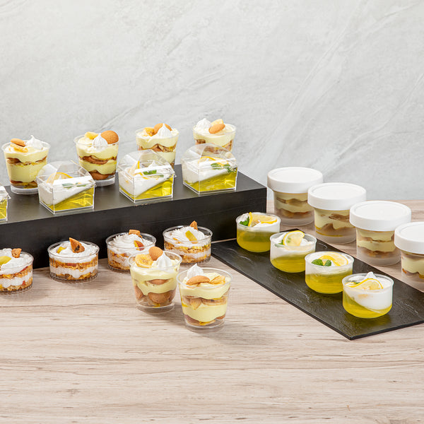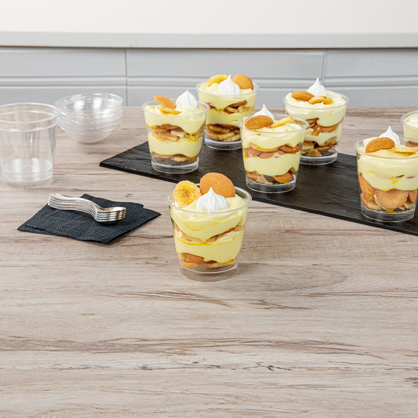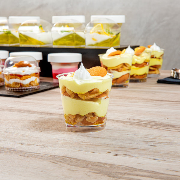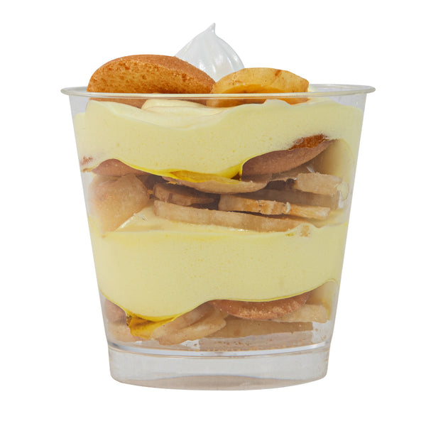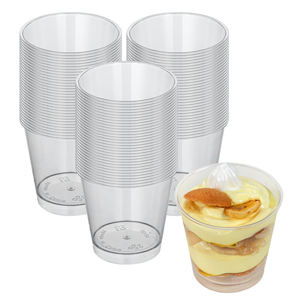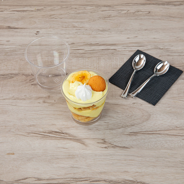 Present your desserts in style with our Mini Serve 6-ounce Round Clear Plastic Dessert Cups. These clear dessert cups are made from durable PS plastic, ensuring they can withstand your delicious and delicate desserts. Ideal for cold treats, these plastic dessert containers can hold everything from ice cream to fruit salad. These clear dessert cups enhance the presentation of your desserts, making them look as good as they taste. The stackable design of these plastic dessert glasses saves you valuable storage space. Being disposable, these clear dessert containers streamline clean-up time. To avert any unwanted spills, these recyclable plastic dessert cups can be paired with available lids (RWP1415C). With a capacity of 6 ounces, these clear recyclable plastic dessert cups are perfect for serving individual portions and measuring 3 inches in diameter by 2.75 inches in height; they're compact enough for easy transportation and storage. Sold in a 100 count box. Lids are available and sold separately.