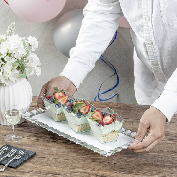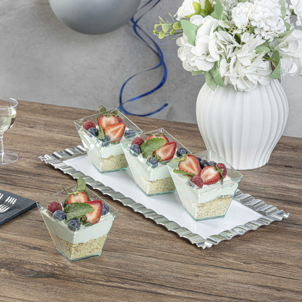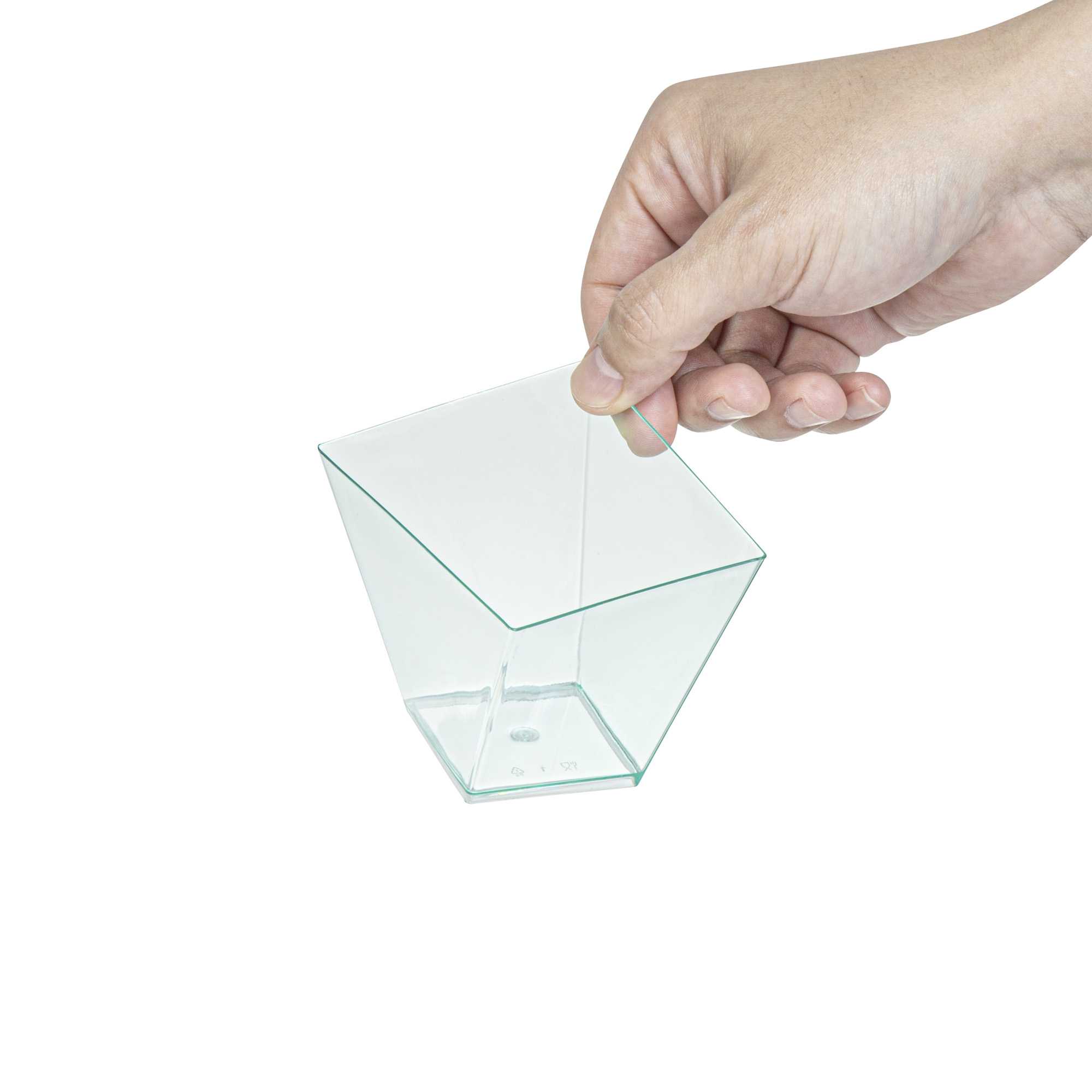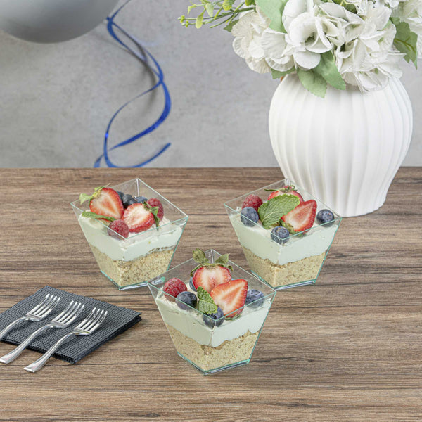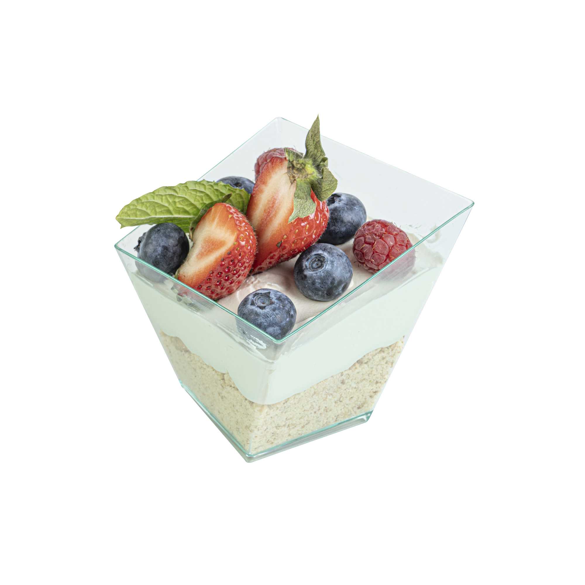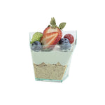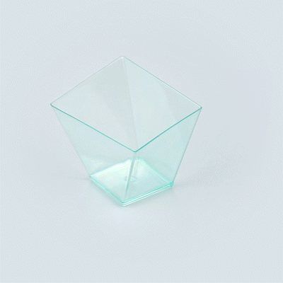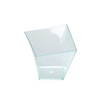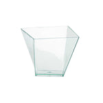 Deliver small servings of appetizers, salads, entrees, and desserts elegantly with our Mini Serve 6-ounce Square Seagreen Plastic Large Girata Dishes. These dessert cups are shaped into a geometric-inspired design, with sharp corners and clean lines that immediately enhance your dish's presentation. Made from sturdy plastic, these disposable cups resist chipping and breaking during service. The premium structure of these snack containers ensures your business contributes less to the carbon footprint. The convenience of these disposable snack cups also simplifies post-event cleaning. The sophisticated seagreen finish of these snack cups boosts the appeal of your food presentation. These disposable plastic bowls measure 3.25 inches long by 2.75 inches wide by 3 inches high, holding up to 6 ounces of food. Sold in a 100 count box.