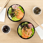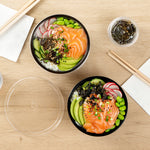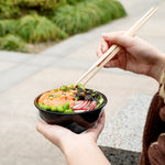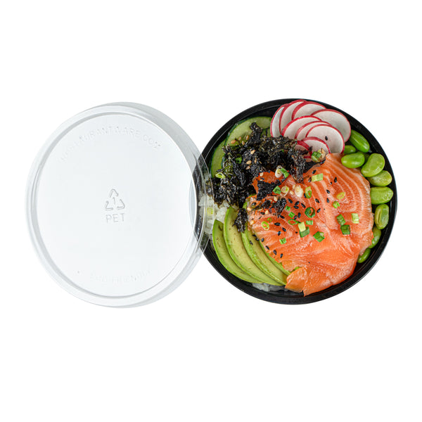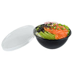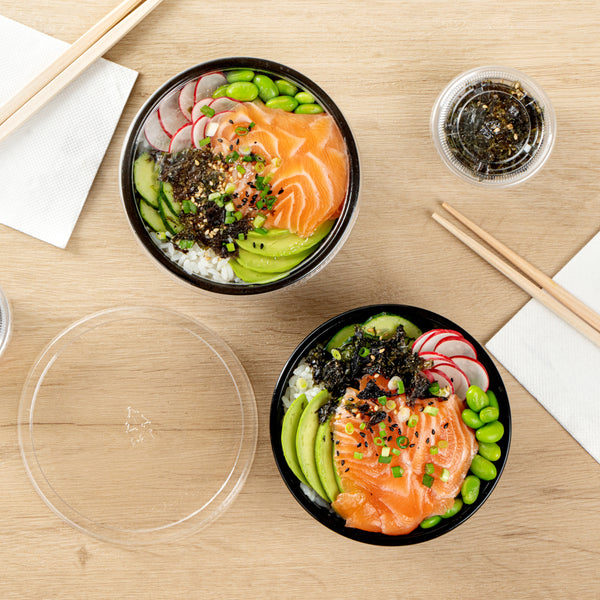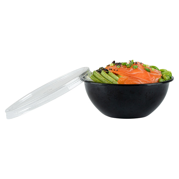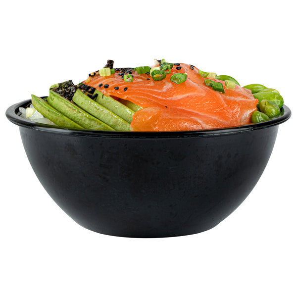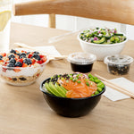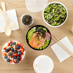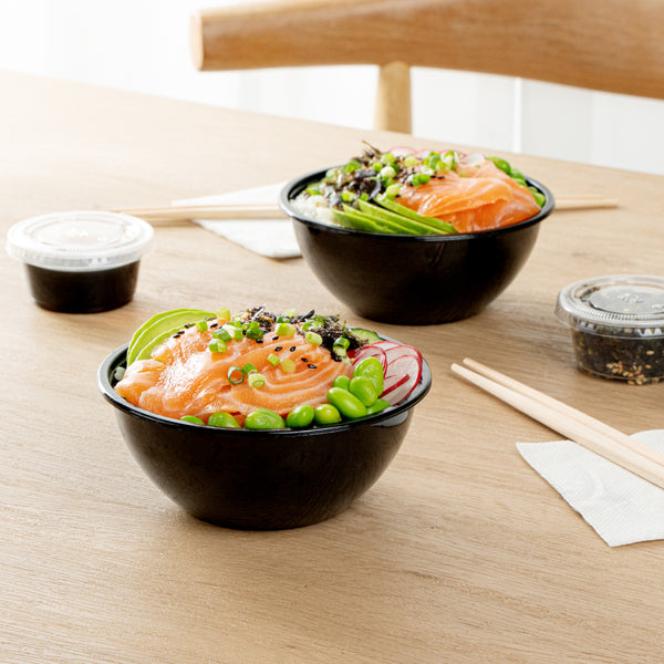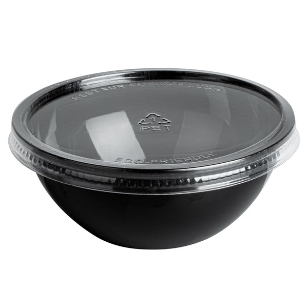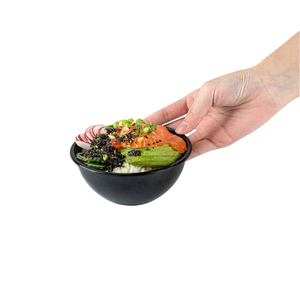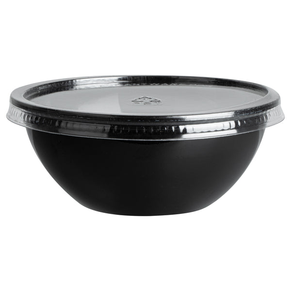 Serve up salads using our Mini Serve 7-ounce Round Plastic Salad Bowls. Made from premium plastic, these salad bowls are durable and perfect for serving wet, dry, and cold foods. These round bowls have a capacity of 7 ounces and provide an ample basin for holding all kinds of delectable dishes. Featuring a rolled rim design, these snack bowls prevent the risk of potential spills and messes. These dessert bowls have an elegant black finish that exudes a sense of refined elegance and elevates the overall dining experience. Great for space-saving storage in your foodservice establishment, these black bowls are conveniently stackable. To comfortably take meals on the go, pair these disposable bowls with our Mini Serve coordinating clear lids (SKU: RWP0204C). These take out bowls measure 5 inches in diameter by 1.75 inches in height and can hold up to 7 ounces. Shipped in a 200 count box. Lids are available and sold separately.