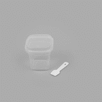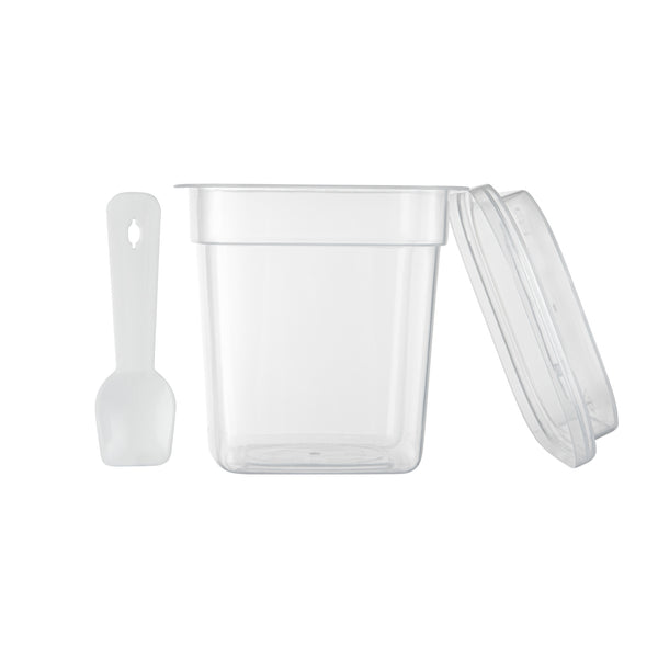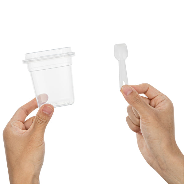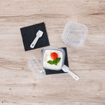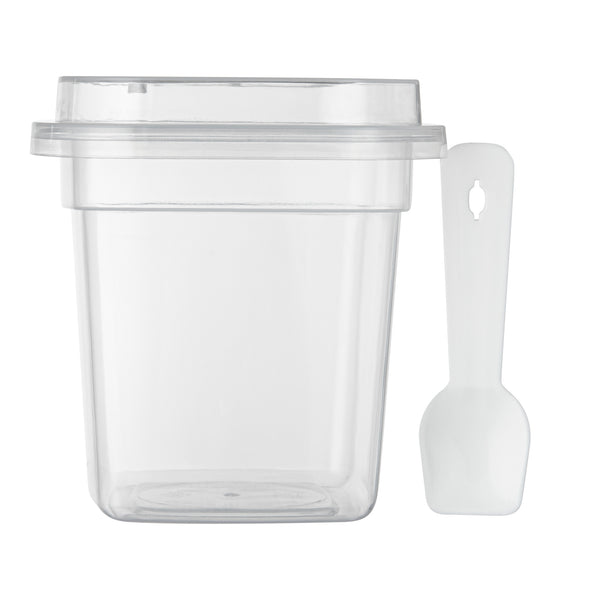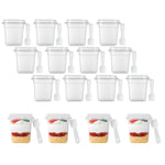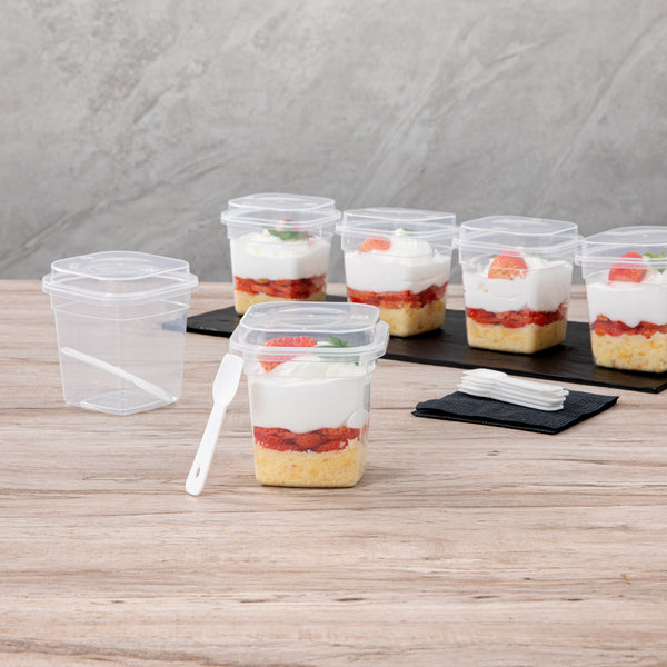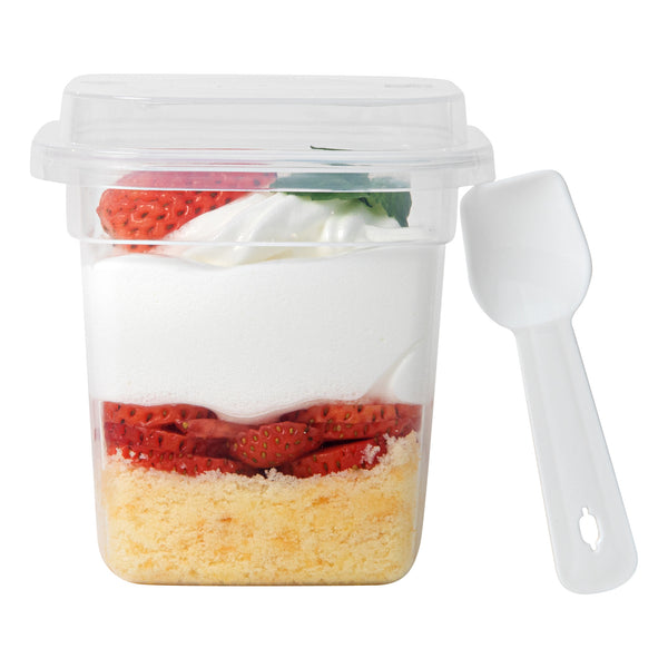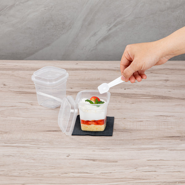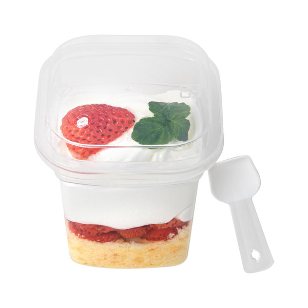 7 OZ SQUARE CLEAR PLASTIC DESSERT CUP - WITH LID AND SPOON