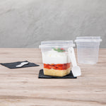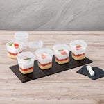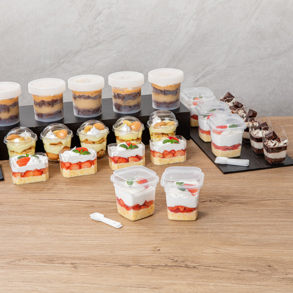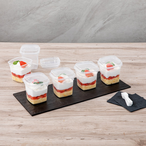 Serve your delectable desserts elegantly with our Mini Serve 7-ounce Square Clear Plastic Dessert Cups. These recyclable plastic dessert cups are crafted from BPA-free PP plastic, ensuring a sturdy and reliable way to present your culinary creations. With the included lids and spoons, these dessert cups make serving a breeze while reducing the need for extra utensils. These clear dessert cups with lids and spoons enhance the visual appeal of your desserts, allowing customers to feast their eyes before digging in. Suitable for hot and cold foods, these microwavable plastic dessert glasses can handle it all, making them an ideal choice for a wide range of sweet treats. Boasting a generous capacity of 7 ounces, these clear dessert cups can comfortably hold a variety of portion sizes. Measuring 3 inches in length by 3 inches in width by 3.5 inches in height, these disposable dessert cups are compact yet offer ample space for your delectable desserts. Sold in a 25 count box.