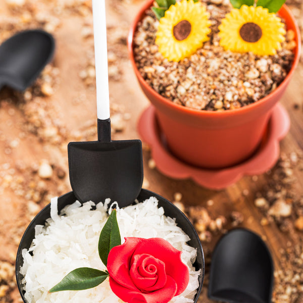 Bring a fun twist to your sweet treats and decadent desserts with our Mini Serve Black and White Plastic Flower Pot Shovel Spoon. Designed to mimic the look of a shovel, these high-quality recyclable plastic shovel spoons are perfect for digging into big bowls of frozen yogurt, gelato, or ice cream. The rounded shovels of these spoons expertly navigate through gooey hot fudge and sticky caramel toppings, while the sturdy plastic handles stand up to hefty spoonfuls of your sweet treats. Designed to be easy to grip and fun to hold, these small plastic spoons are ideal for bakeries, frozen yogurt shops, ice cream parlors, and catering companies. Pair these shovel spoons with our Mini Serve compatible flower pot cups (SKU: RWP0443) to complete the look while presenting your desserts. Each of these unique black and white frozen yogurt spoons measures 5 inches long by 1.25 inches wide. Sold in a 100 count box. Flower pot cups are available and sold separately.