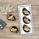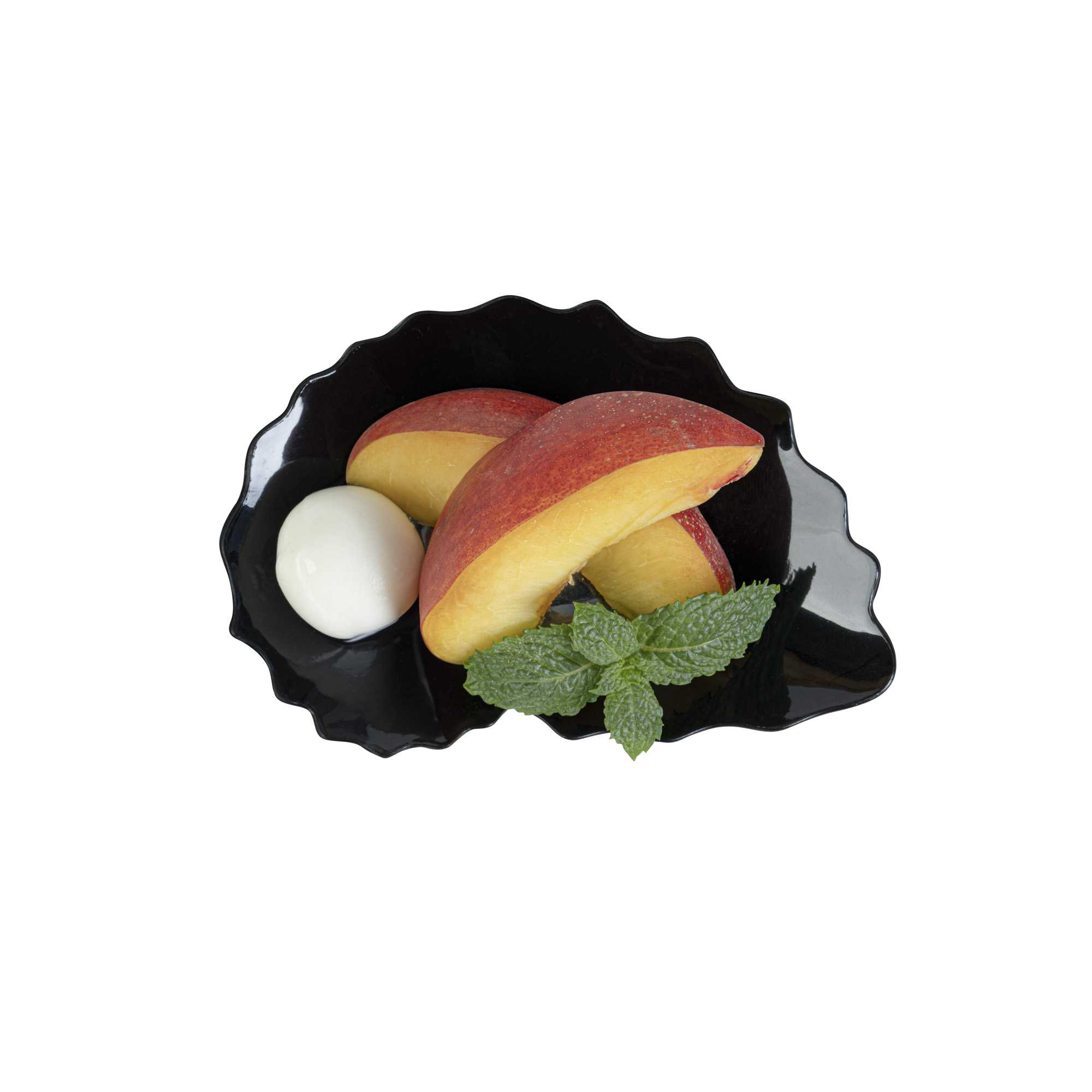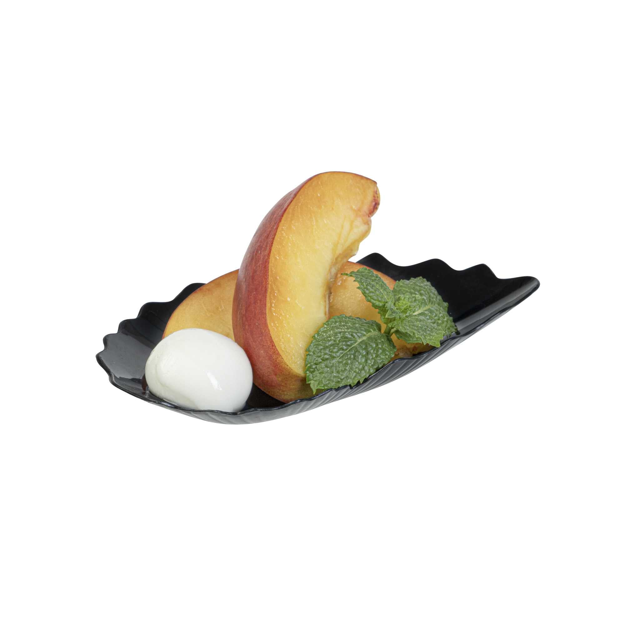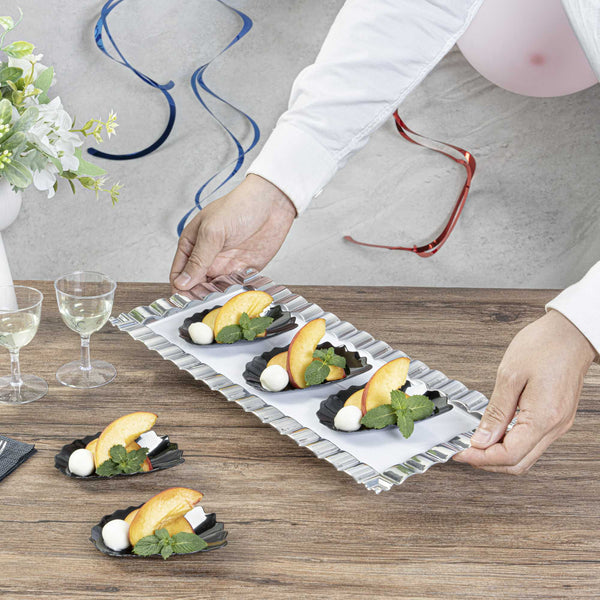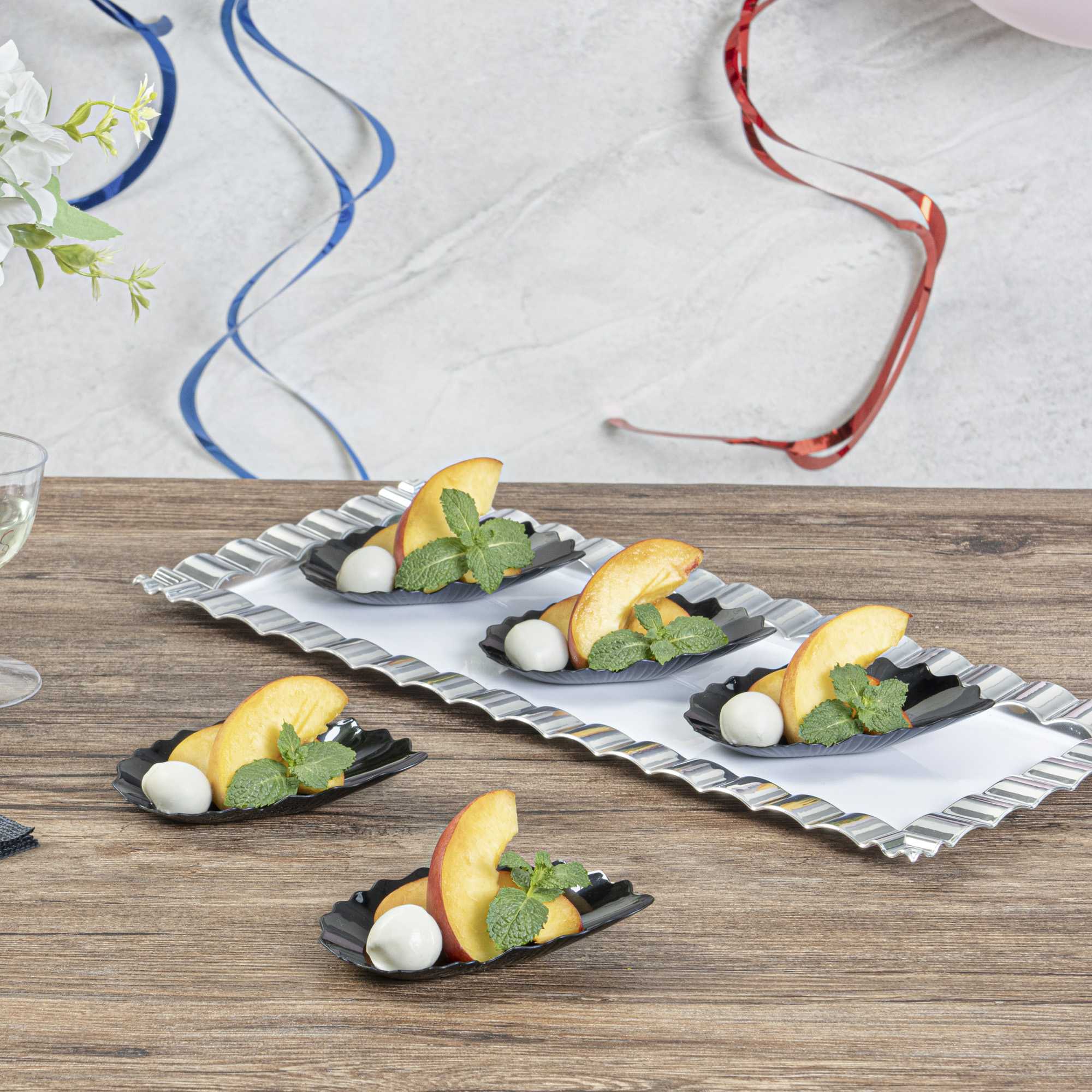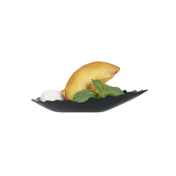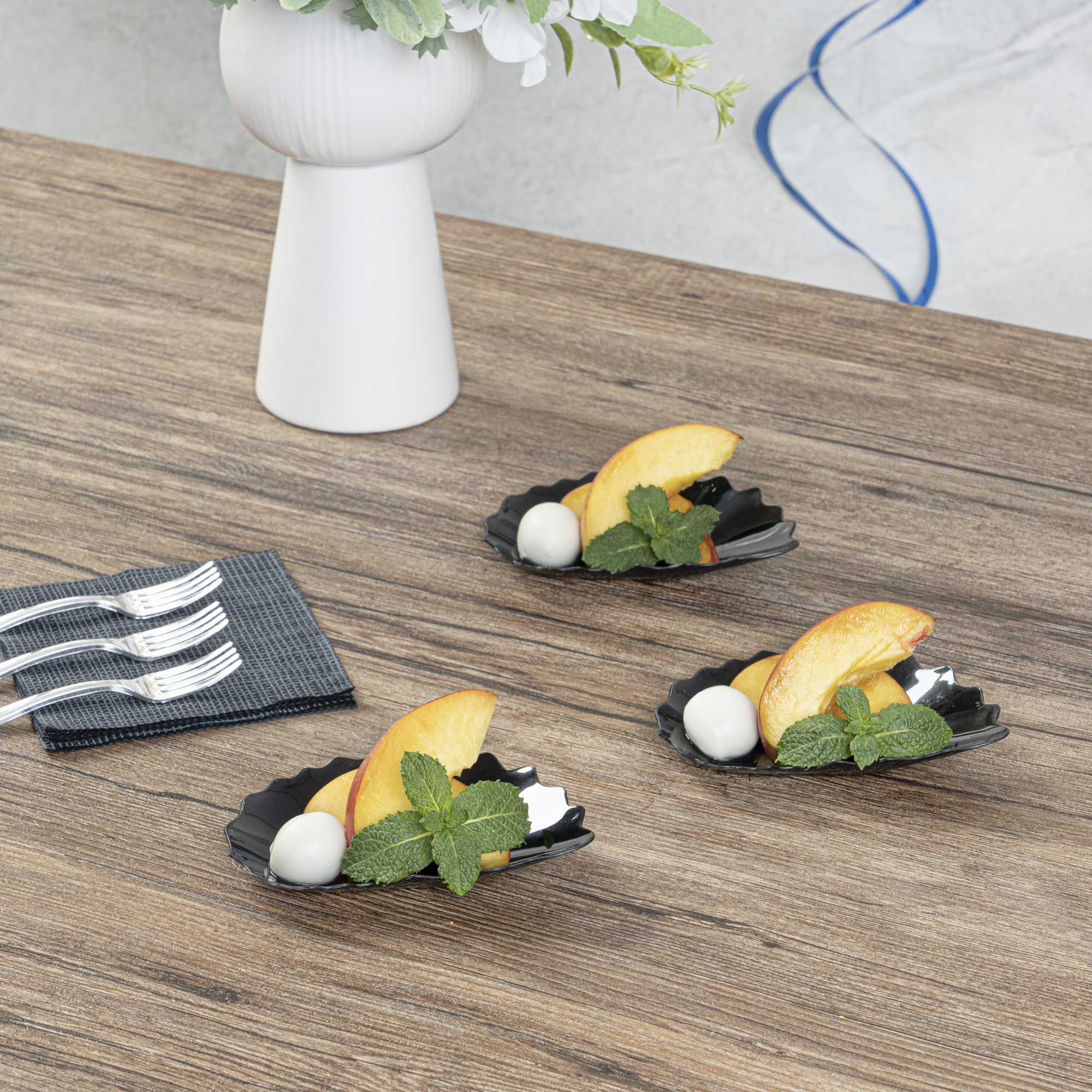 Our Mini Serve Black Plastic Mini Coquille Plates are the perfect backdrop for your delicious small bites. Featuring a scalloped seashell design, these elegant small disposable plates enhance the look of your miniature appetizers, desserts, and hors d'oeuvres. Constructed from premium plastic, these small appetizer plates are sturdy. Plus, these mini appetizer plates are disposable and provide quick and easy post-event cleanup. These mini-tasting plates have a black finish to stylishly serve antipasto bites at a catered event or to creatively display miniature raspberry cheesecakes at a corporate luncheon. With a 1-ounce capacity, these decorative mini plates measure 3.25 inches in length by 3.25 inches in width. Shipped in a 100 count box.