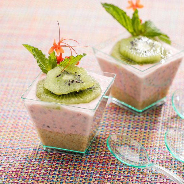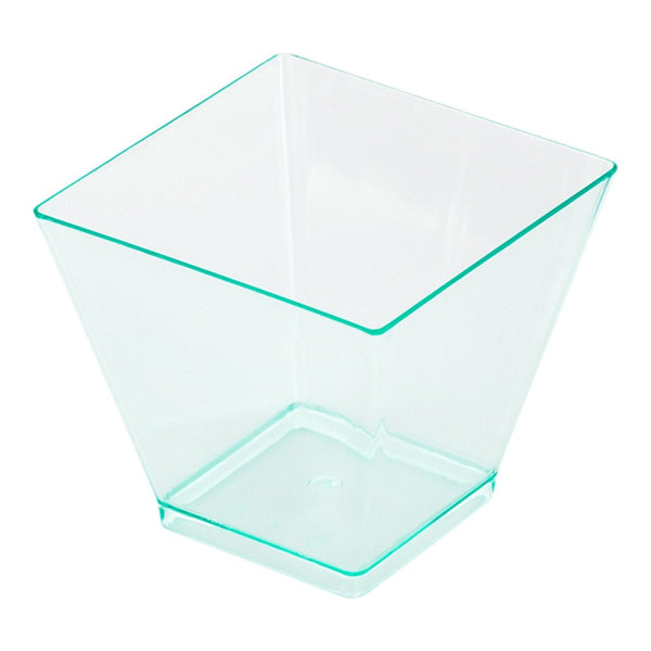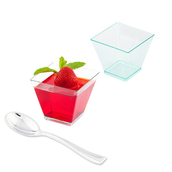 Elevate your presentation with our Bundle: Mini Serve 100 2-ounce Square Seagreen Plastic Mini Kova Cups with 100 Silver Plastic 4" Mini Spoons designed to enhance your tantalizing dishes effortlessly. This bundle includes 100 square sea green mini Kova cups and 100 silver plastic mini spoons. Durably constructed, these sea green Kova cups are built to last, ensuring your event runs smoothly. The smooth rims of these plastic mini cups make for a comfortable eating experience, while the unique sea green color adds an ocean-like elegance fitting for any occasion. Ideally designed for bite-sized appetizers, desserts, or drinks, these 2-ounce treat cups are a great addition to your menu. Pair these cups with our matching lids (SKU: RWP0305C) to protect the contents. Complementing the cups, the silver plastic mini spoons feature a shiny finish, enhancing the presentation of your tantalizing dishes. These 4-inch plastic spoons are the perfect size to accompany miniature tuna tartare or personal-sized strawberry shortcakes. Designed for single use, these disposable snack cups and sturdy-handled spoons ensure an easy cleanup, making them a perfect flatware option for eco-conscious cafes, venues, and clients. The Kova cups measure 2 inches wide by 1.75 inches tall, while the spoons are 4 inches long, offering ample capacity and convenience. Each order includes 100 sea green plastic cups and 100 silver plastic mini spoons.