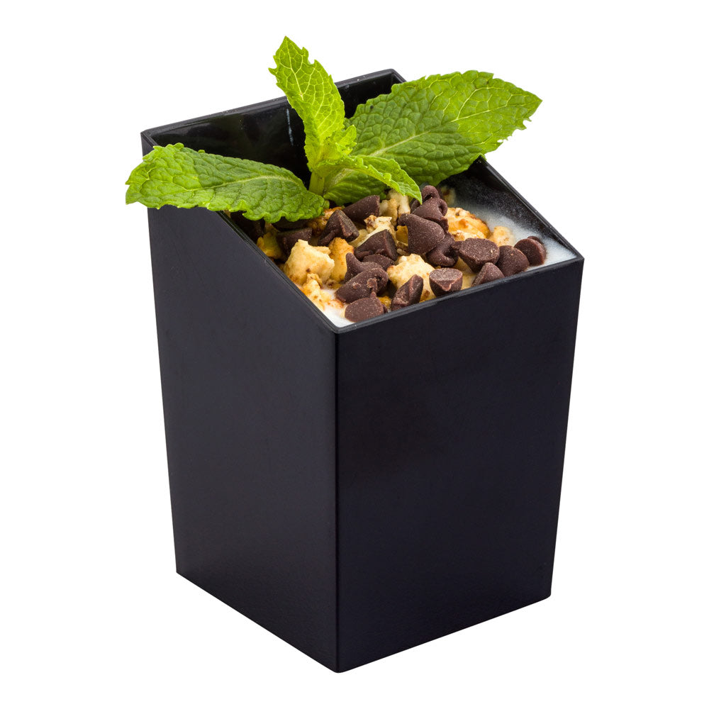 Elevate your culinary presentations with our Bundle: Mini Serve 100 3-ounce Square Black Plastic Incline Cups with 100 Silver Plastic 4" Mini Spoons, delivering modern elegance and unparalleled convenience. This bundle includes 100 sleek black incline cups and 100 shimmering silver mini spoons, perfectly complementing each other for a sophisticated yet practical tabletop display. The premium black plastic incline cups feature a sleek sloping edge, securely holding condiments, layered desserts, and appetizers with an angled design for easy access. Flaunting a stylish square shape and black finish, these mini dessert cups add a modern touch to any food presentation. The accompanying silver plastic mini spoons boast a shiny finish, effortlessly enhancing the presentation of your tantalizing dishes while their sturdy handles stand up to hefty bites. Both the incline cups and mini spoons are made from high-quality, durable plastic, ensuring frequent use and convenient disposability for hassle-free clean-up after events. The lightweight yet sturdy cups measure 1.75 inches in length by 1.75 inches in width by 2.75 inches in height, while the spoons measure 4 inches in length, providing the perfect single-serve portion. Each order includes 100 incline cups and 100 mini spoons, making this bundle an essential addition for effortlessly elevating your culinary presentations.