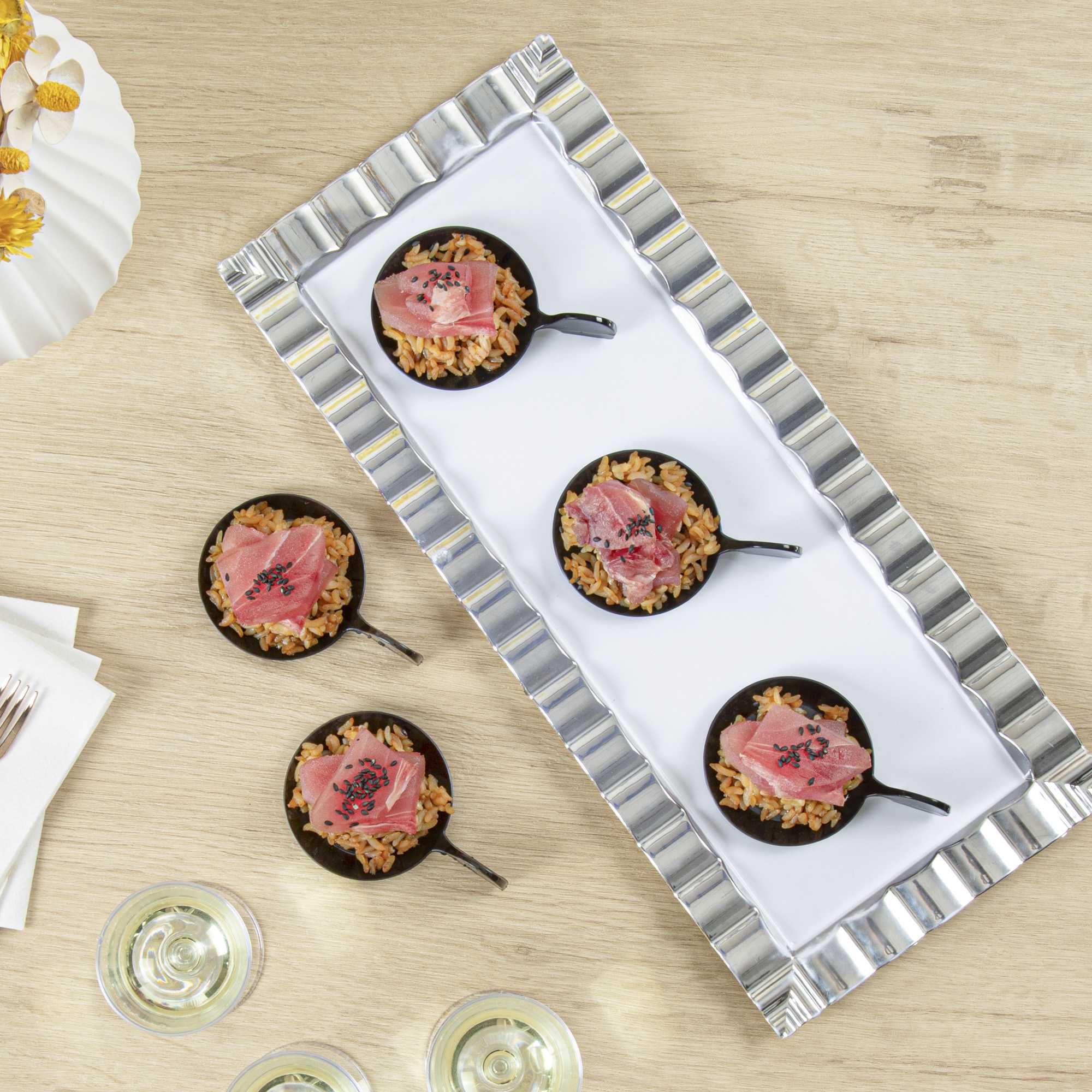 Serve up individual servings in style with our Mini Serve Fish Black Plastic Tasting Plates. The premium plastic construction of these disposable plates makes them recyclable and eco-friendly for any event. The unique fish-shaped design of these small plating dishes complements any tablescape with a modern touch. These food sampling dishes are lightweight yet durable, allowing for easy transport and handling during any tasting. The sleek black color of these recyclable mini plastic plates stylishly showcases any cuisine to guests. Perfect for passing appetizers, these plastic plates for food sampling also securely contain sauces and dips. Measuring 3.75 inches in length by 2.5 inches in width, these compact plates fit comfortably in one hand while providing enough surface area for a hearty sample. Sold in a 100 count box.