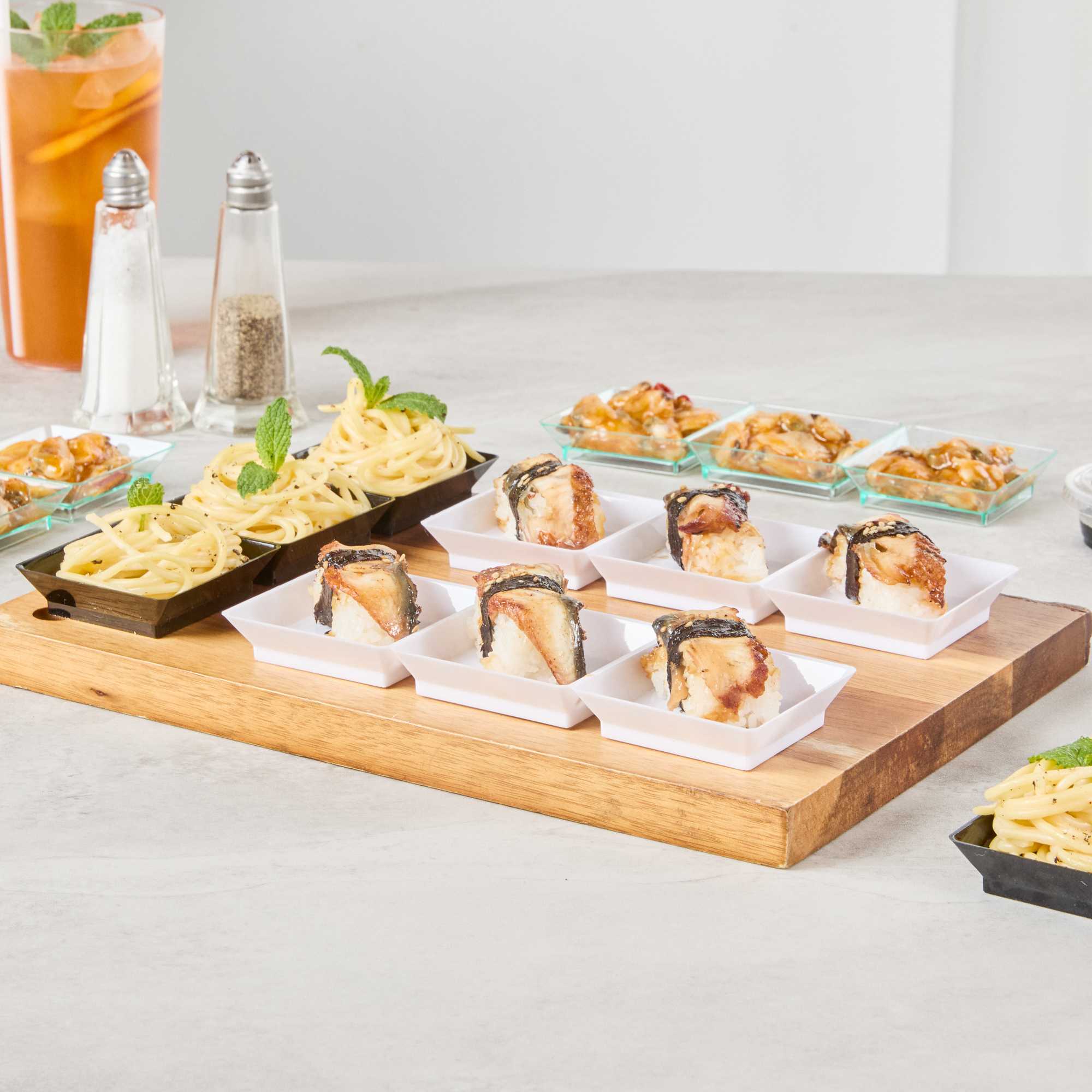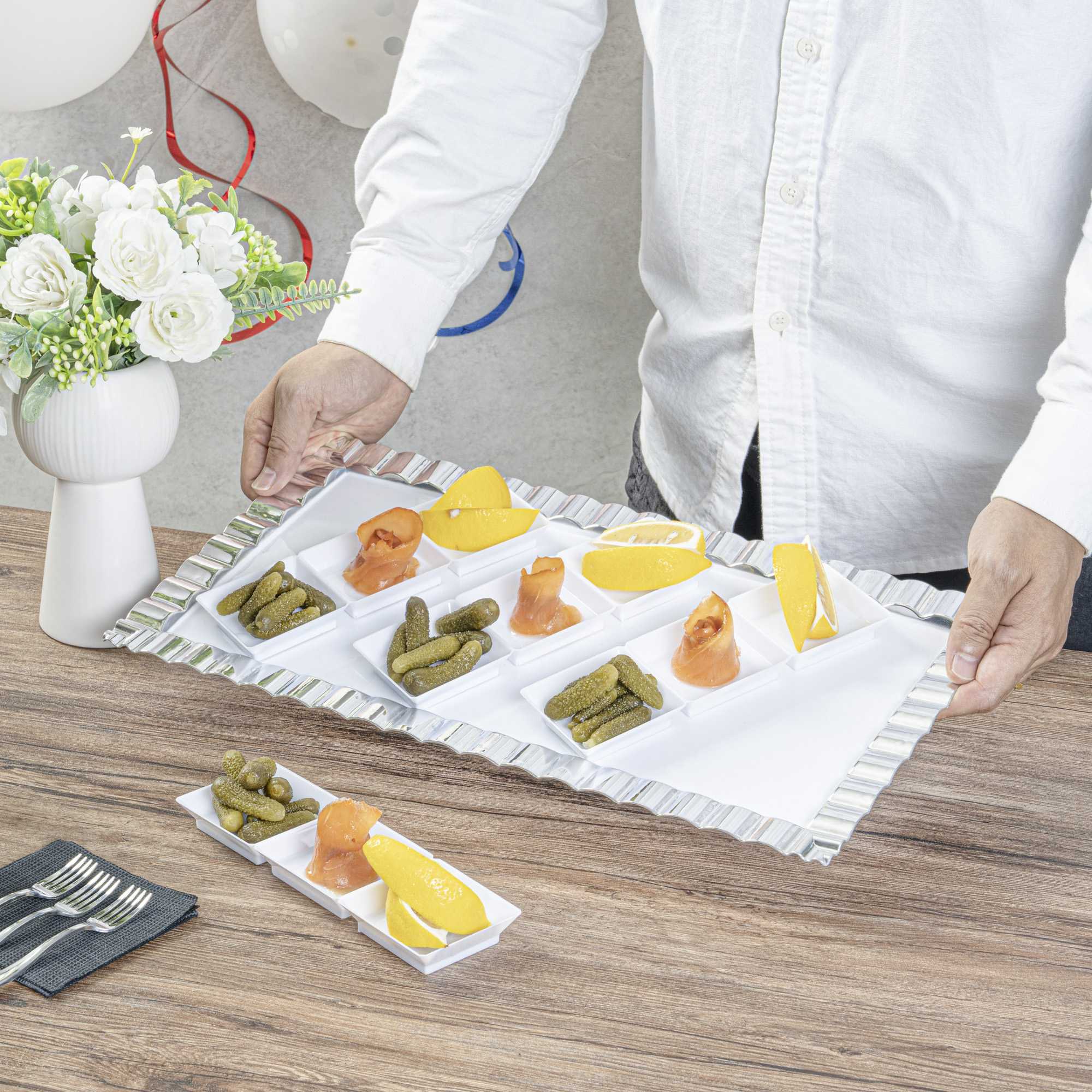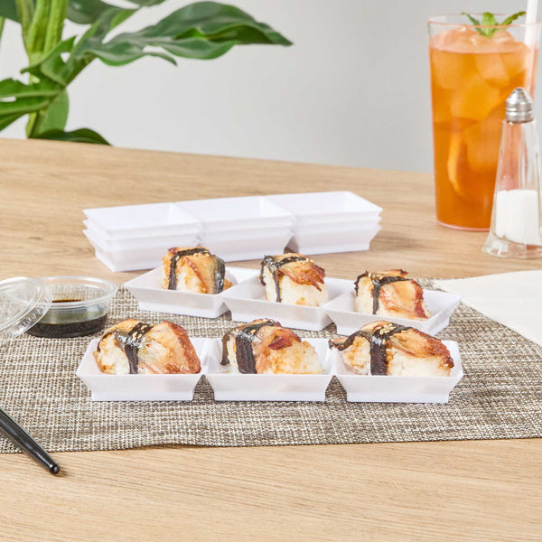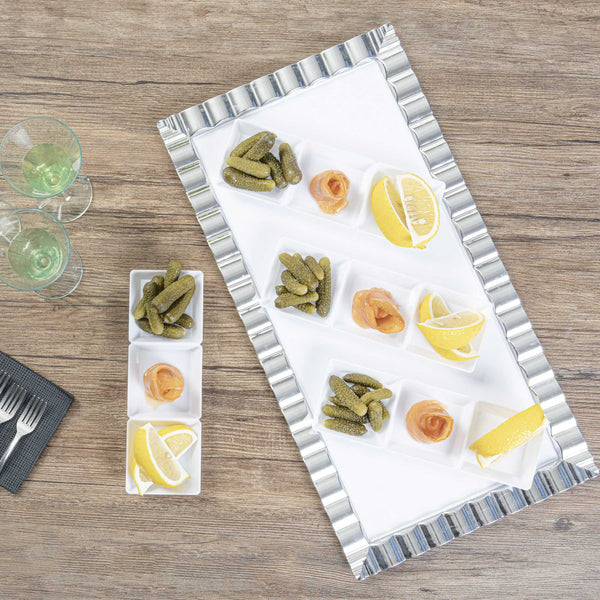 Introduce a hint of sophistication to your gatherings with our Mini Serve Rectangle White Plastic Terzetto Mini Plates. Precisely crafted from superior PS plastic, these sturdy mini plates are tailored to accommodate a variety of foods without succumbing to warping or damage, ensuring a stylishly prepared dish. The three defined compartments on these mini plates allow diverse dishes to be served simultaneously, offering your guests an unforgettable dining journey. The crisp white shade of these terzetto mini plates adds a touch of minimalist elegance that complements any dining decor. These mini appetizer plates, being disposable, provide an easy clean-up solution. To retain the freshness of your cuisine, pair these disposable mini plates with our Mini Serve corresponding clear terzetto lid (SKU: RWP0052C). These compartment plates, measuring 7.5 inches long by 2.5 inches wide, are excellent for portion-controlled servings of appetizers, desserts, or various meals. Sold in a 20 count box.