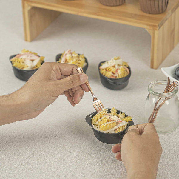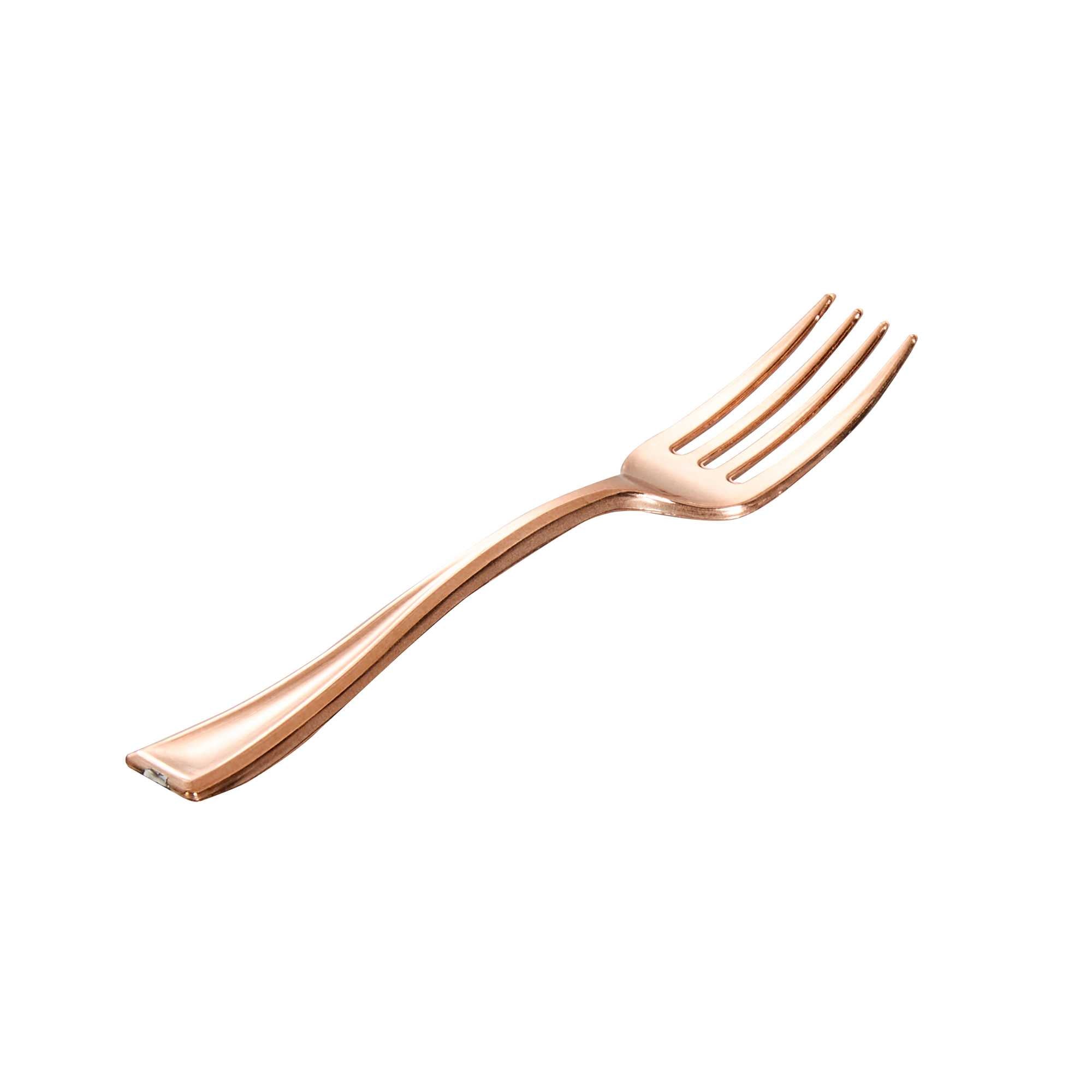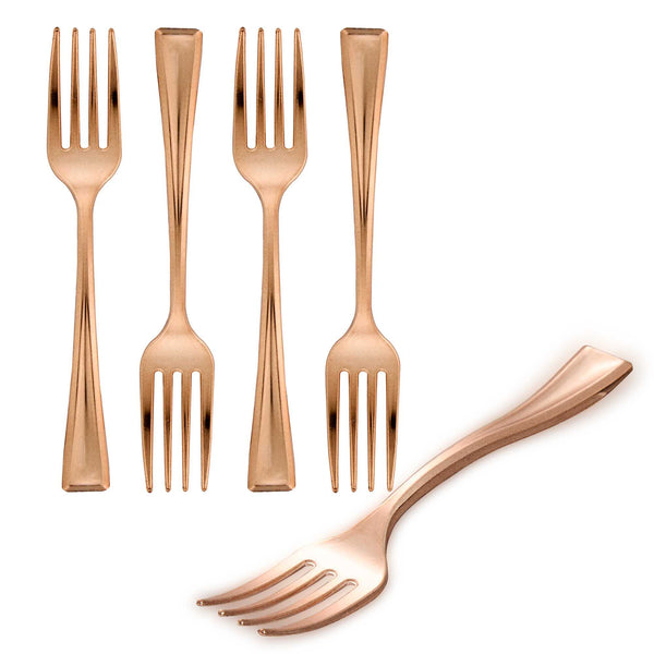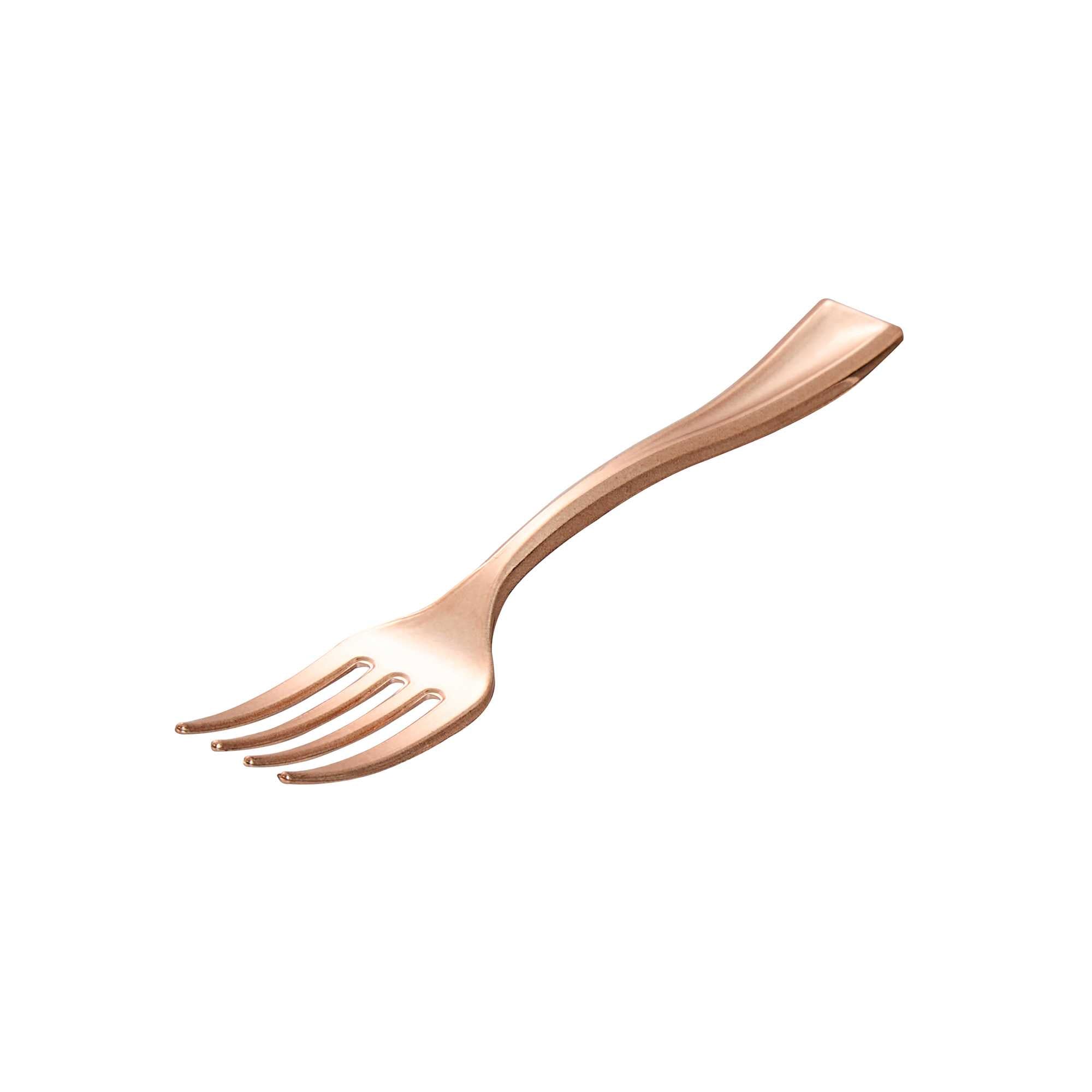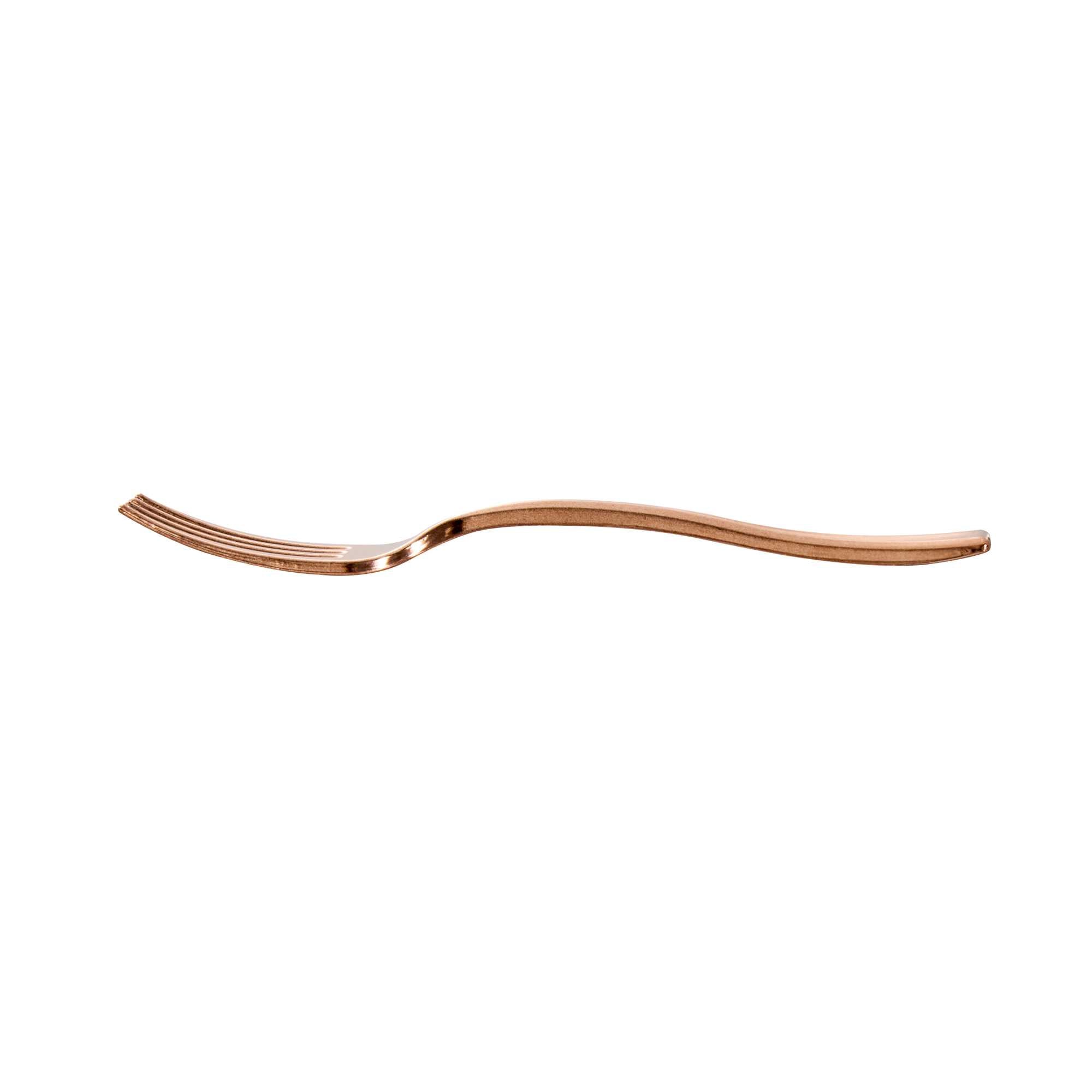 Achieve a higher level of elegance for your table setting with our Mini Serve Rose Gold Plastic Mini Forks. Featuring a shiny finish, these rose gold plastic forks are designed to effortlessly enhance the presentation of your delicious dishes. With their strong and sturdy handle, these cake forks are built to stand up to hefty bites of polenta and big scoops of gelato. Made from premium plastic, these appetizer forks are recyclable and can be conveniently disposed of after use. Measuring 4 inches in length, these single-use forks are the ideal size to accompany miniature tuna tartare or personal-sized strawberry shortcakes. Shipped in a 100 count box.