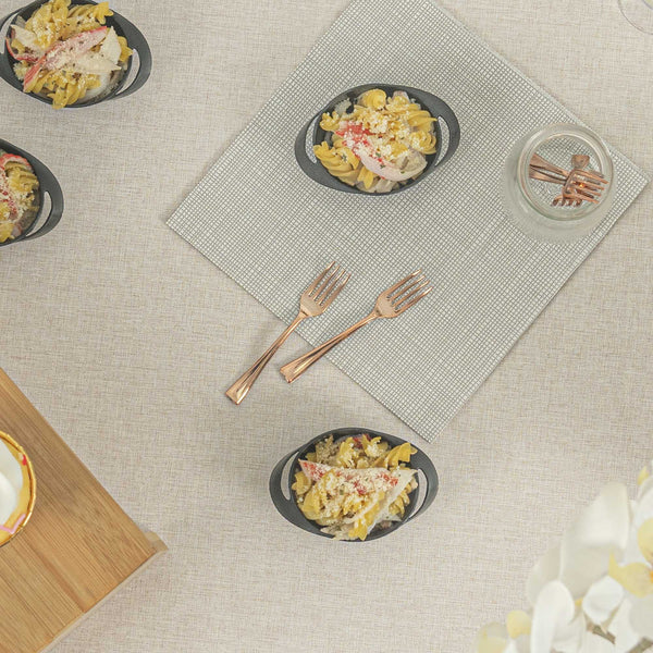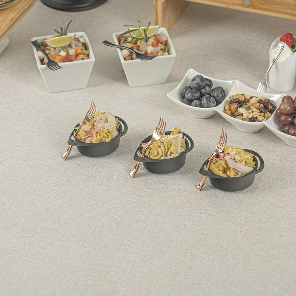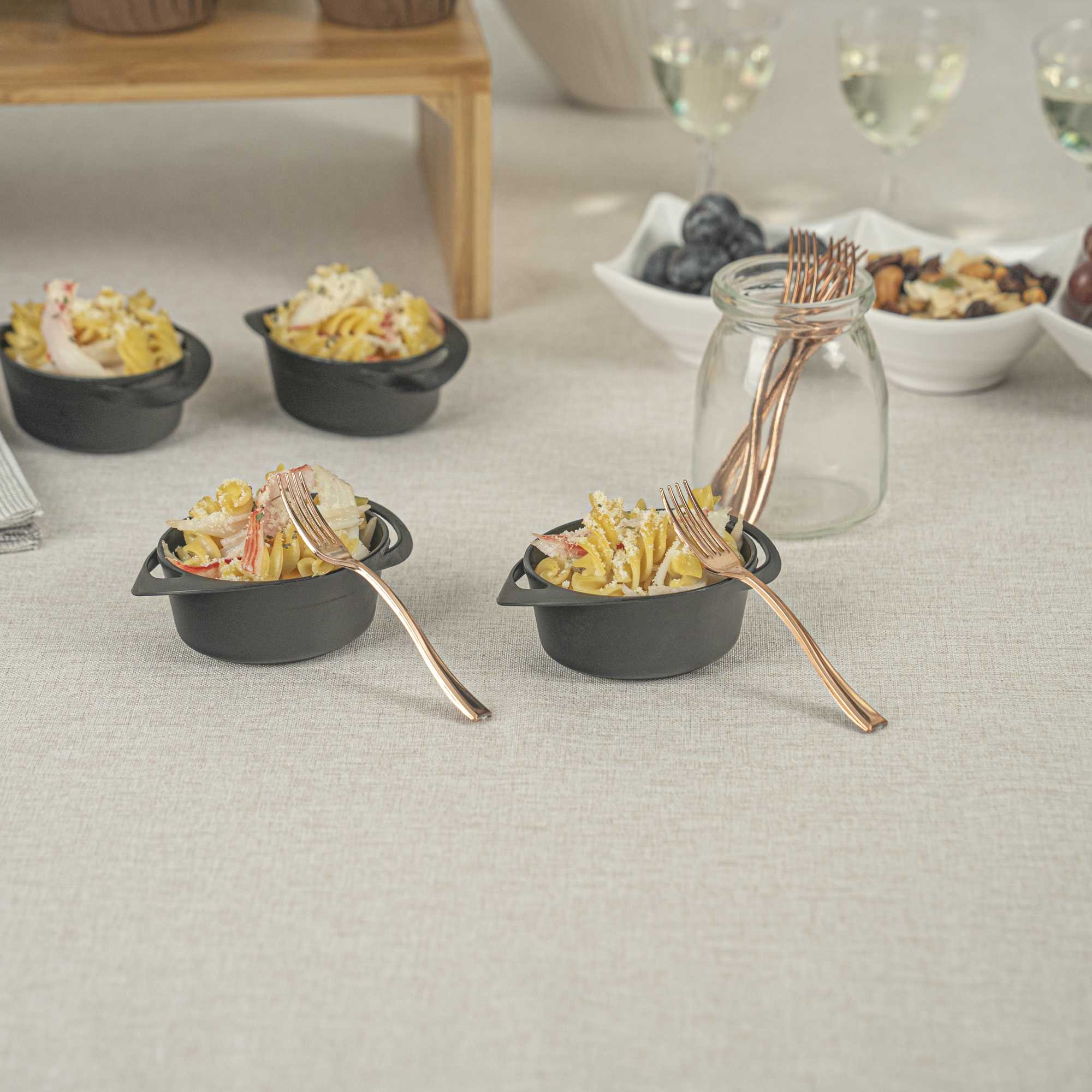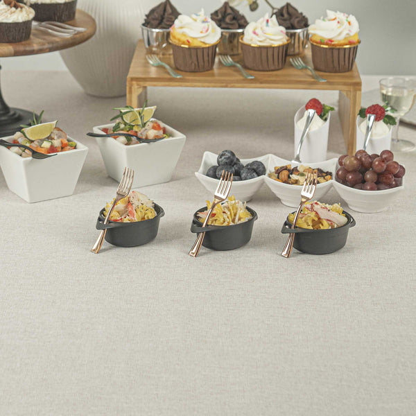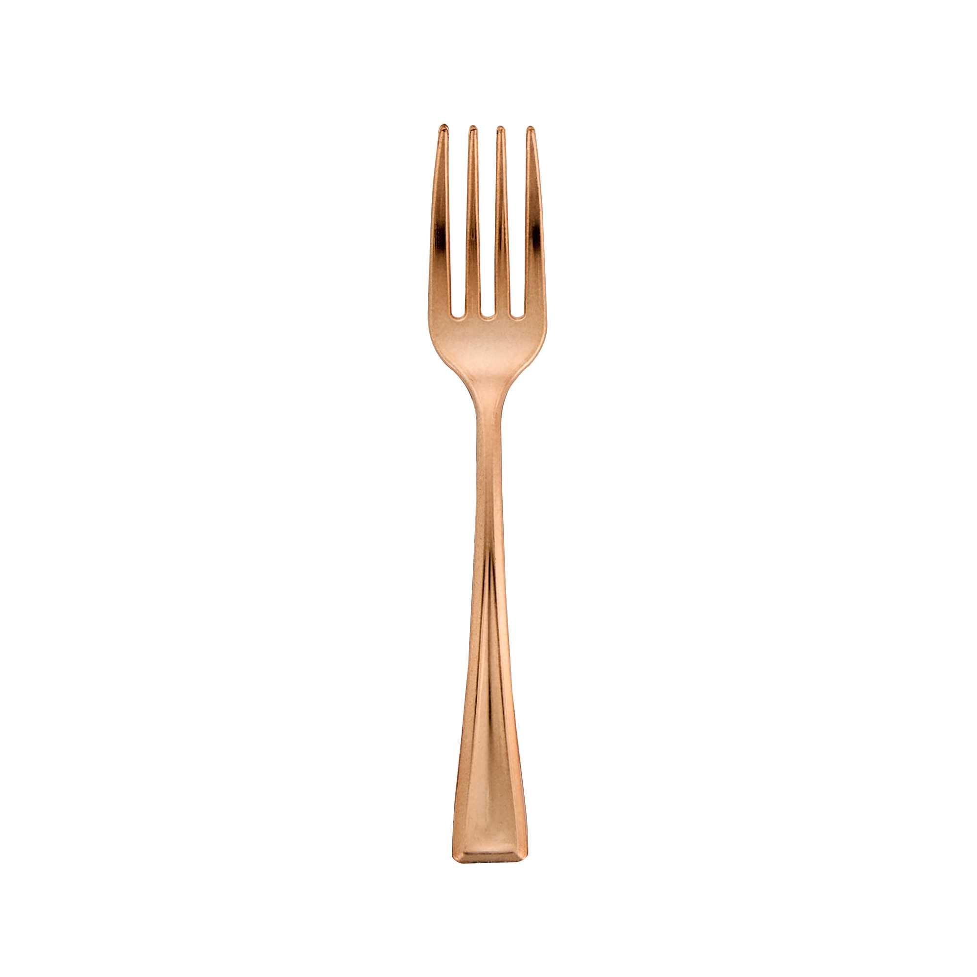 Achieve a higher level of elegance for your table setting with our Mini Serve Rose Gold Plastic Mini Forks. Featuring a shiny finish, these rose gold plastic forks are designed to effortlessly enhance the presentation of your delicious dishes. With their strong and sturdy handle, these cake forks are built to stand up to hefty bites of polenta and big scoops of gelato. Made from premium plastic, these appetizer forks are recyclable and can be conveniently disposed of after use. Measuring 4 inches in length, these single-use forks are the ideal size to accompany miniature tuna tartare or personal-sized strawberry shortcakes. Shipped in a 100 count box.