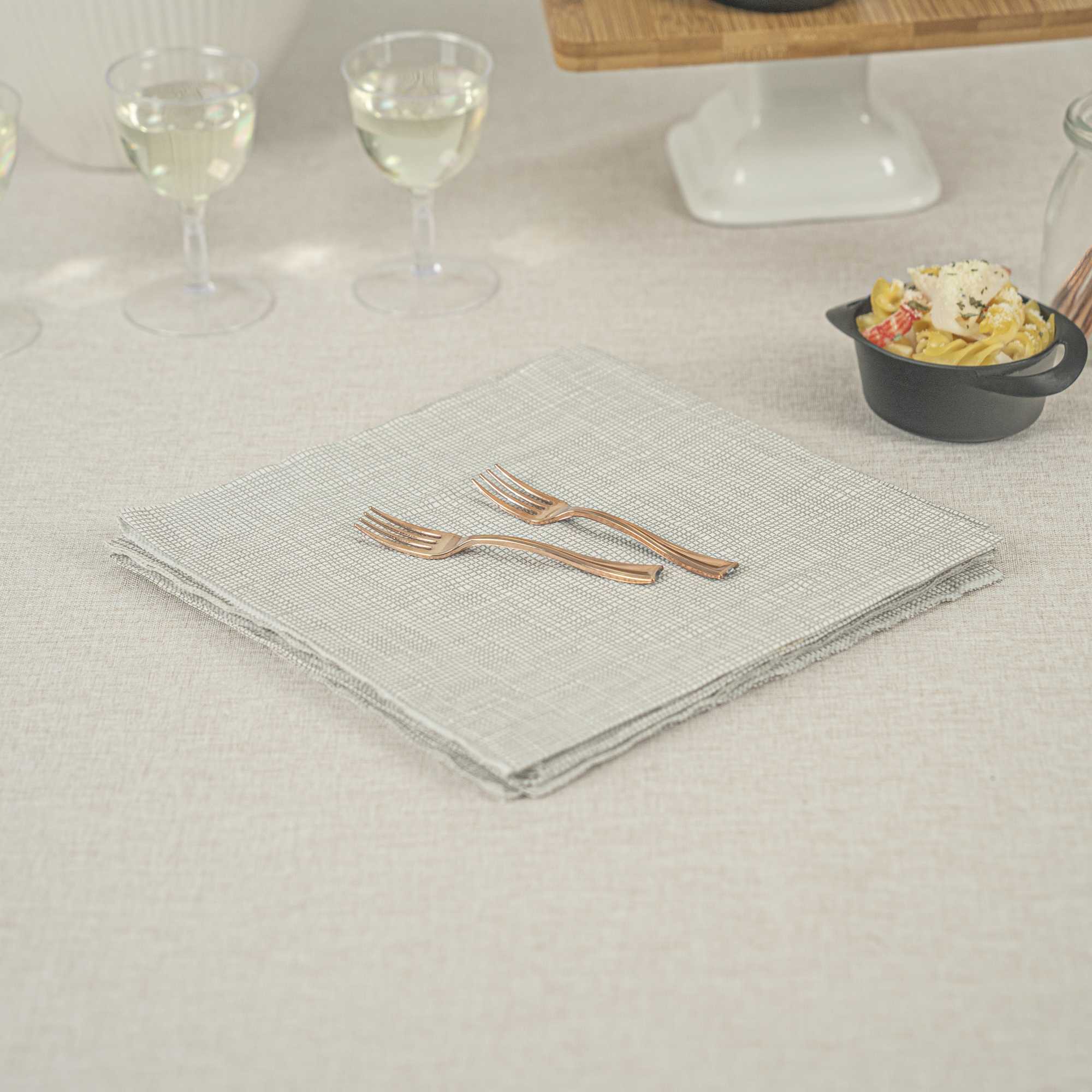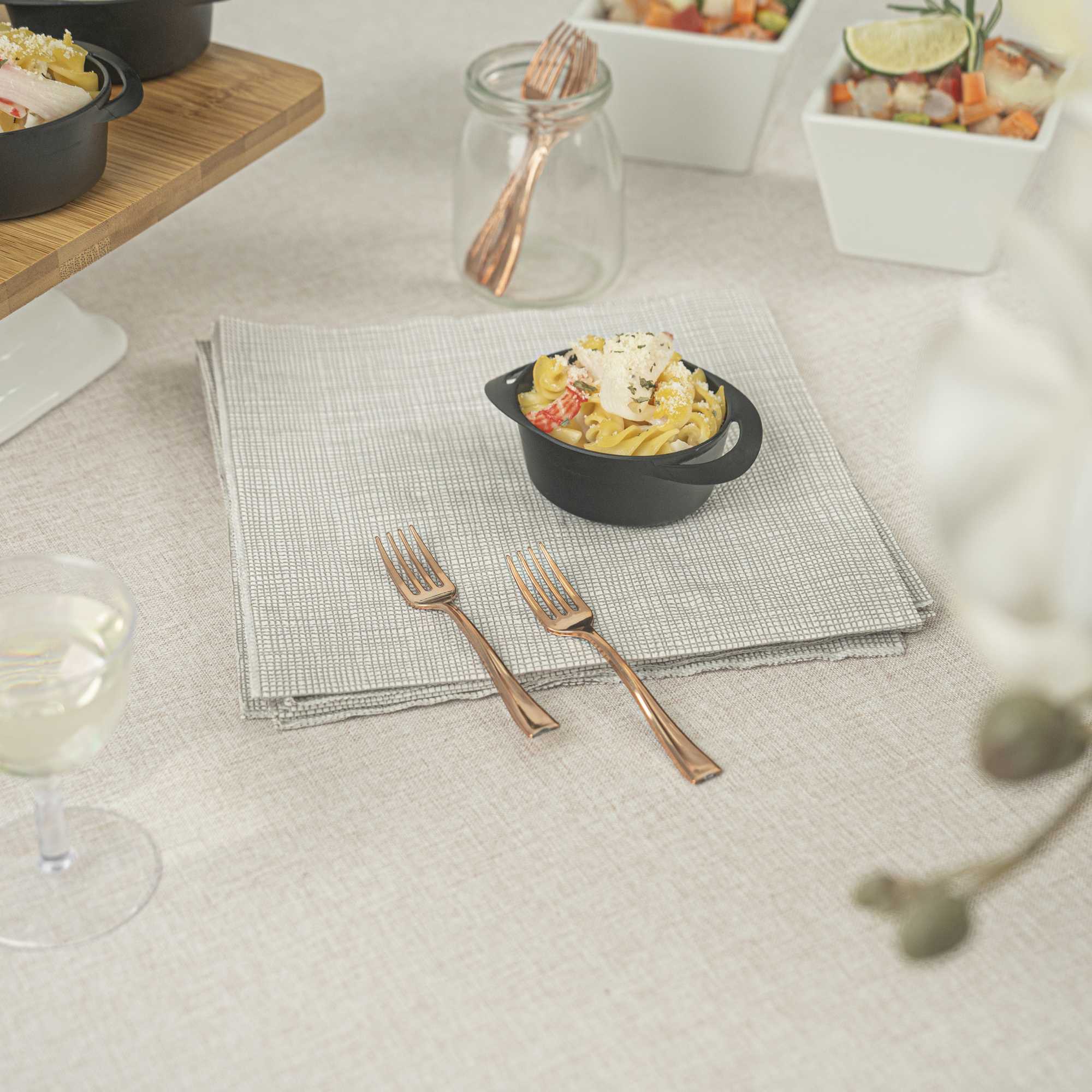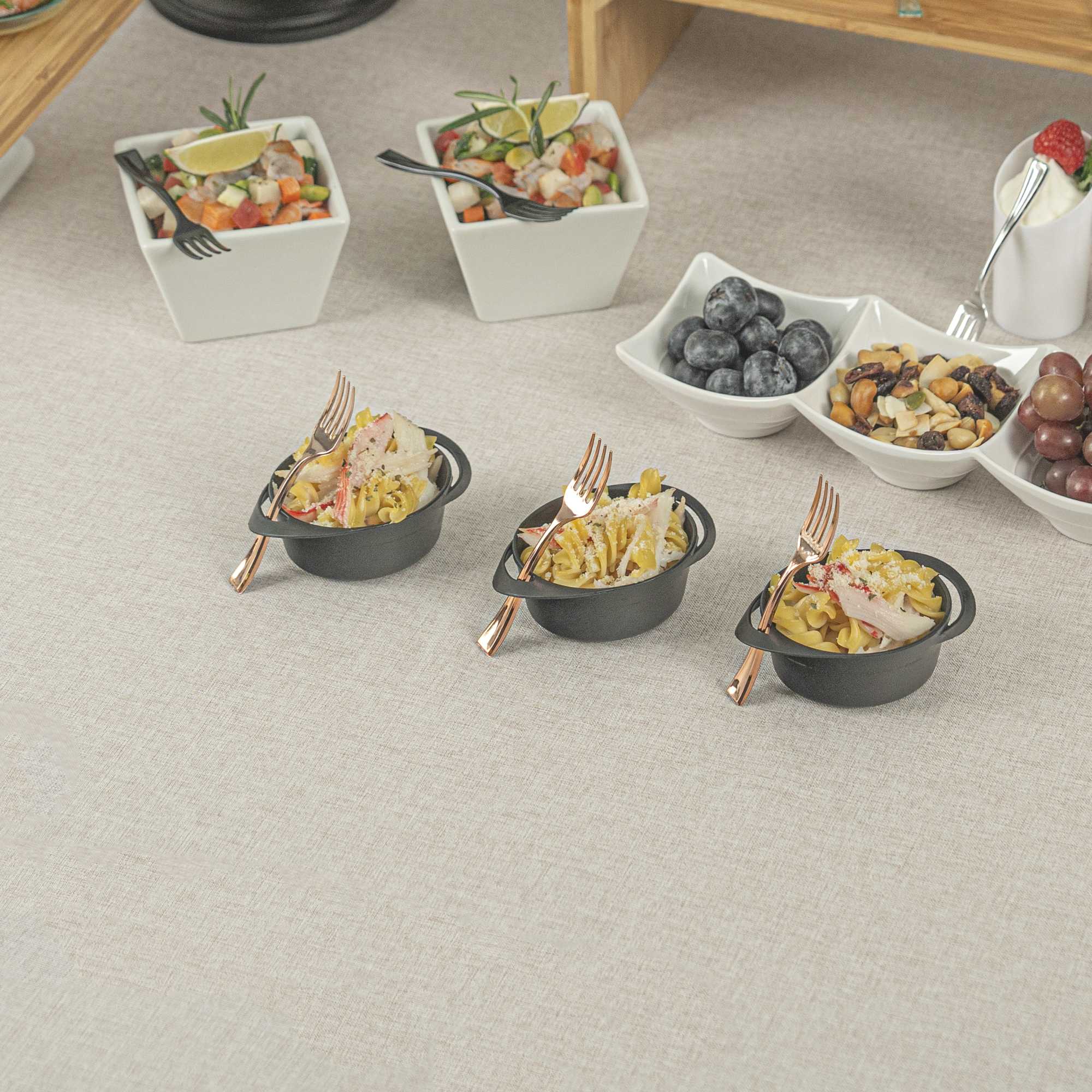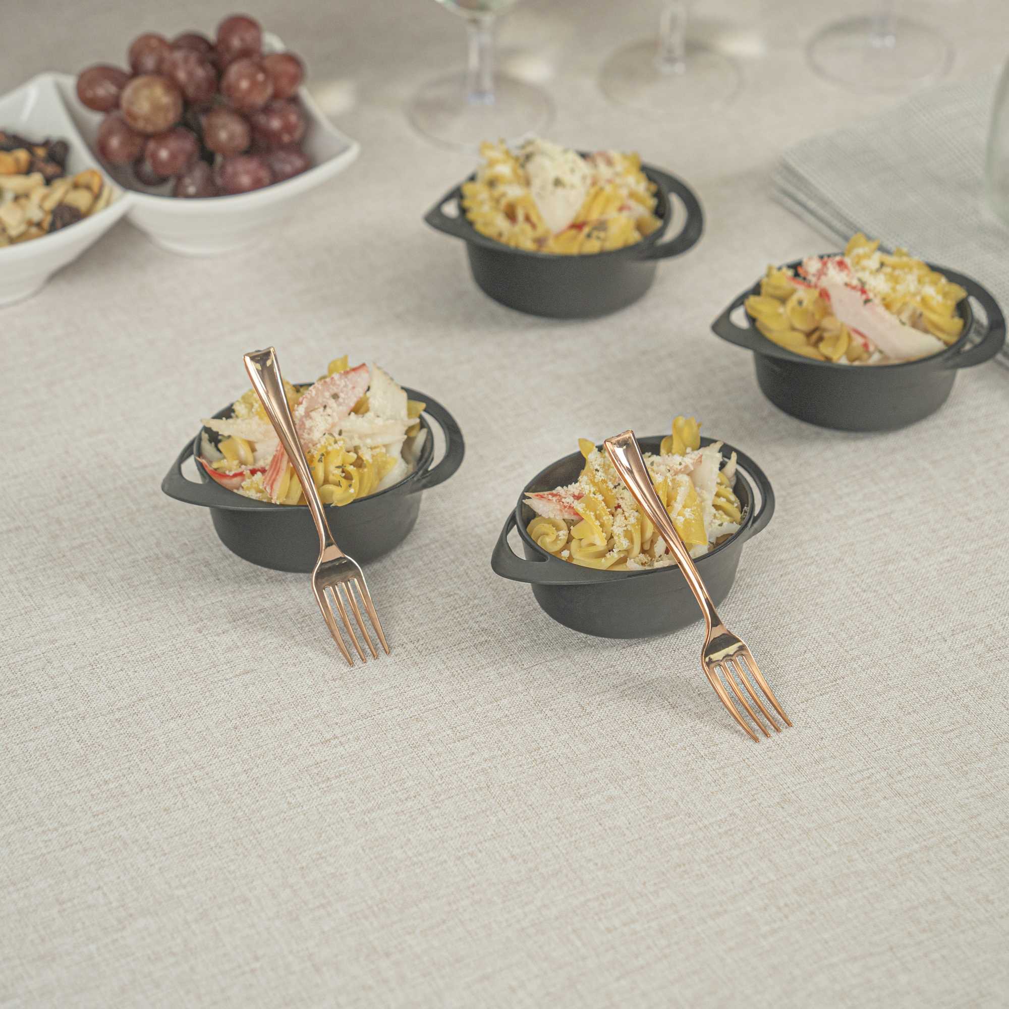 Achieve a higher level of elegance for your table setting with our Mini Serve Rose Gold Plastic Mini Forks. Featuring a shiny finish, these rose gold plastic forks are designed to effortlessly enhance the presentation of your delicious dishes. With their strong and sturdy handle, these cake forks are built to stand up to hefty bites of polenta and big scoops of gelato. Made from premium plastic, these appetizer forks are recyclable and can be conveniently disposed of after use. Measuring 4 inches in length, these single-use forks are the ideal size to accompany miniature tuna tartare or personal-sized strawberry shortcakes. Shipped in a 100 count box.