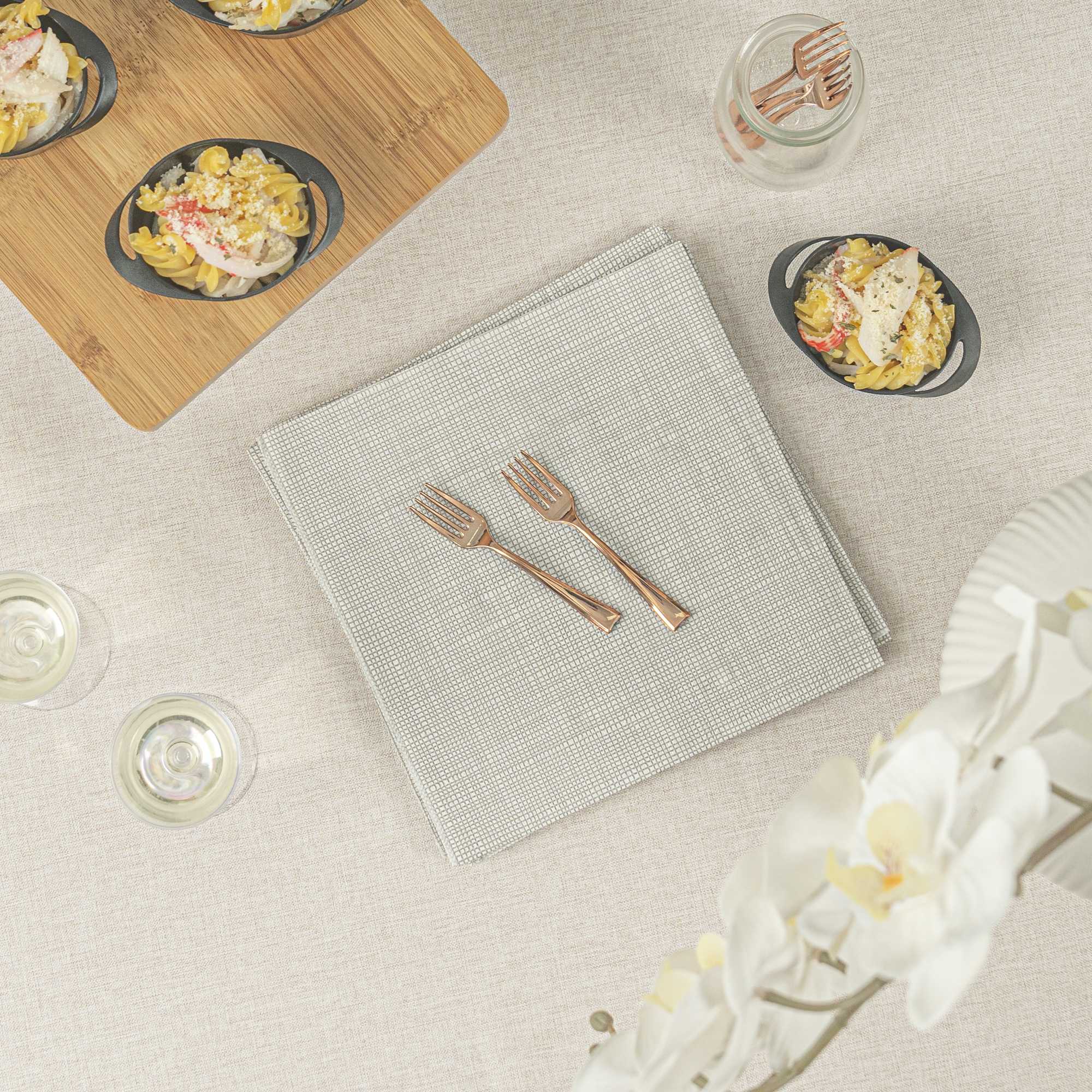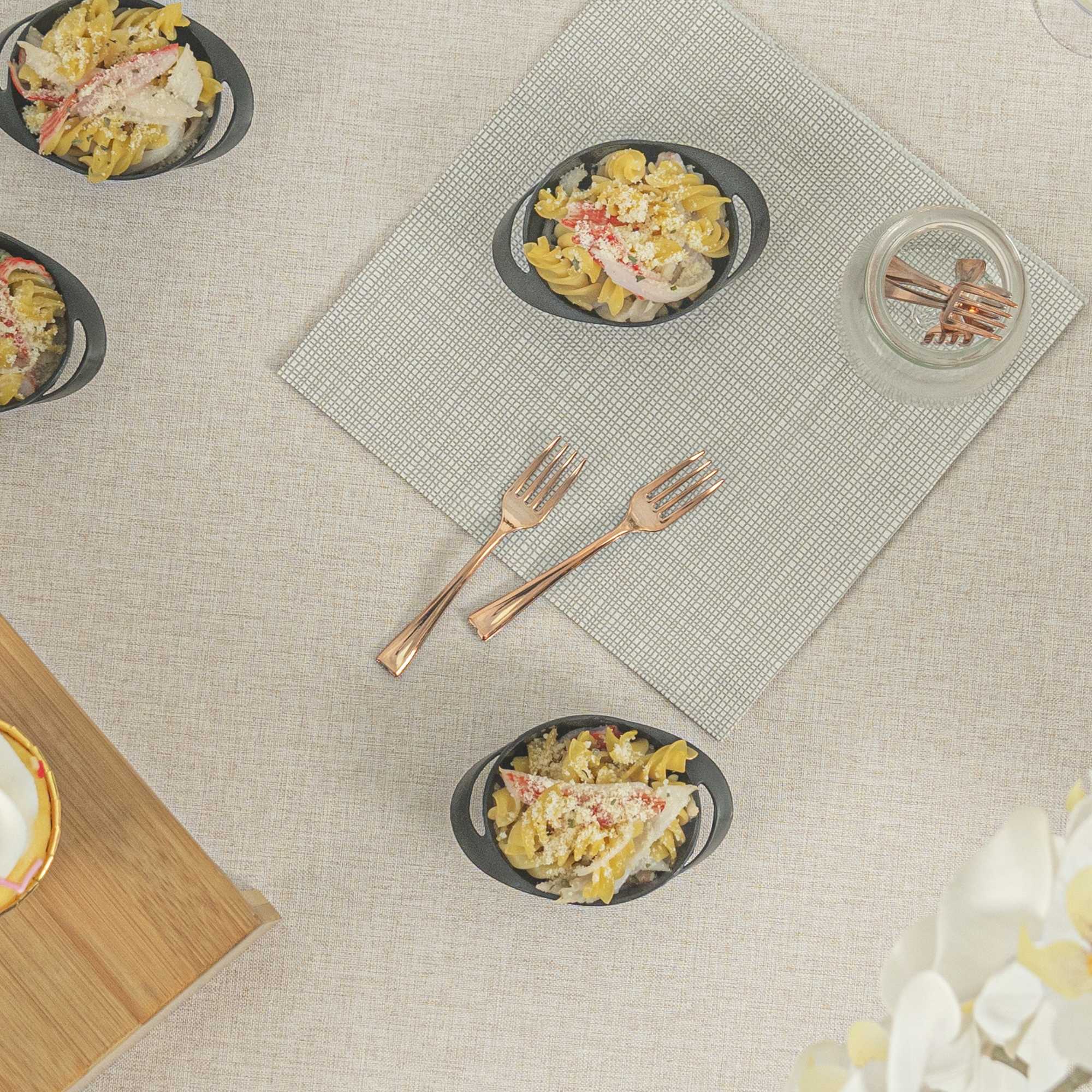 Achieve a higher level of elegance for your table setting with our Mini Serve Rose Gold Plastic Mini Forks. Featuring a shiny finish, these rose gold plastic forks are designed to effortlessly enhance the presentation of your delicious dishes. With their strong and sturdy handle, these cake forks are built to stand up to hefty bites of polenta and big scoops of gelato. Made from premium plastic, these appetizer forks are recyclable and can be conveniently disposed of after use. Measuring 4 inches in length, these single-use forks are the ideal size to accompany miniature tuna tartare or personal-sized strawberry shortcakes. Shipped in a 500 count box.