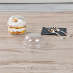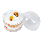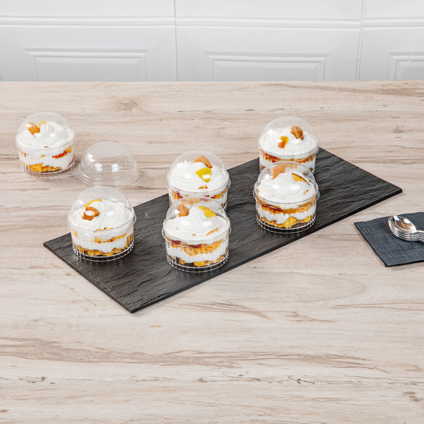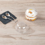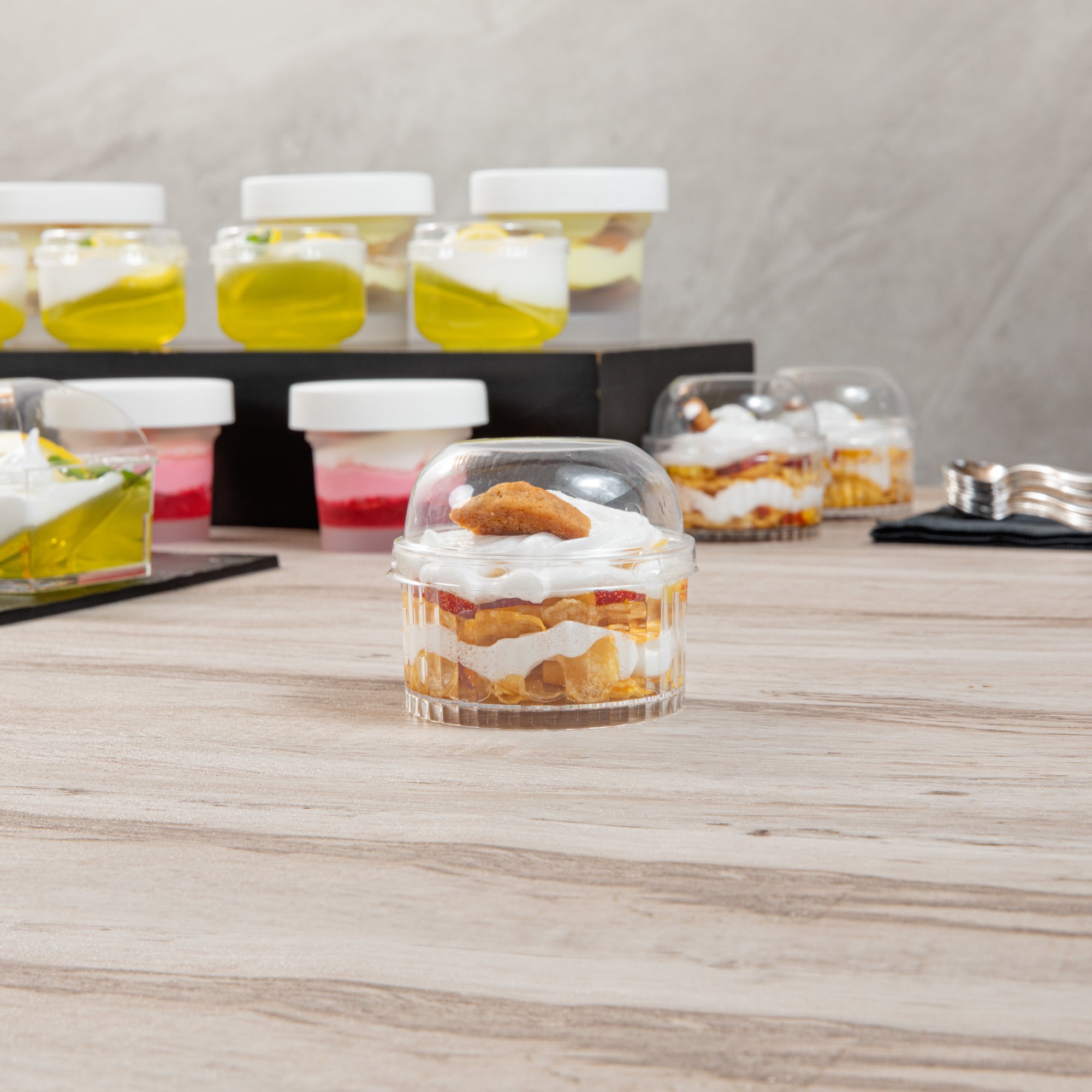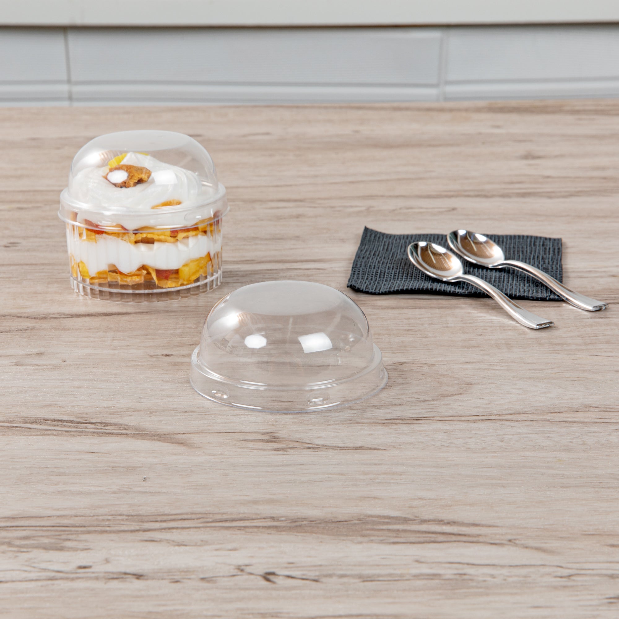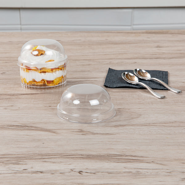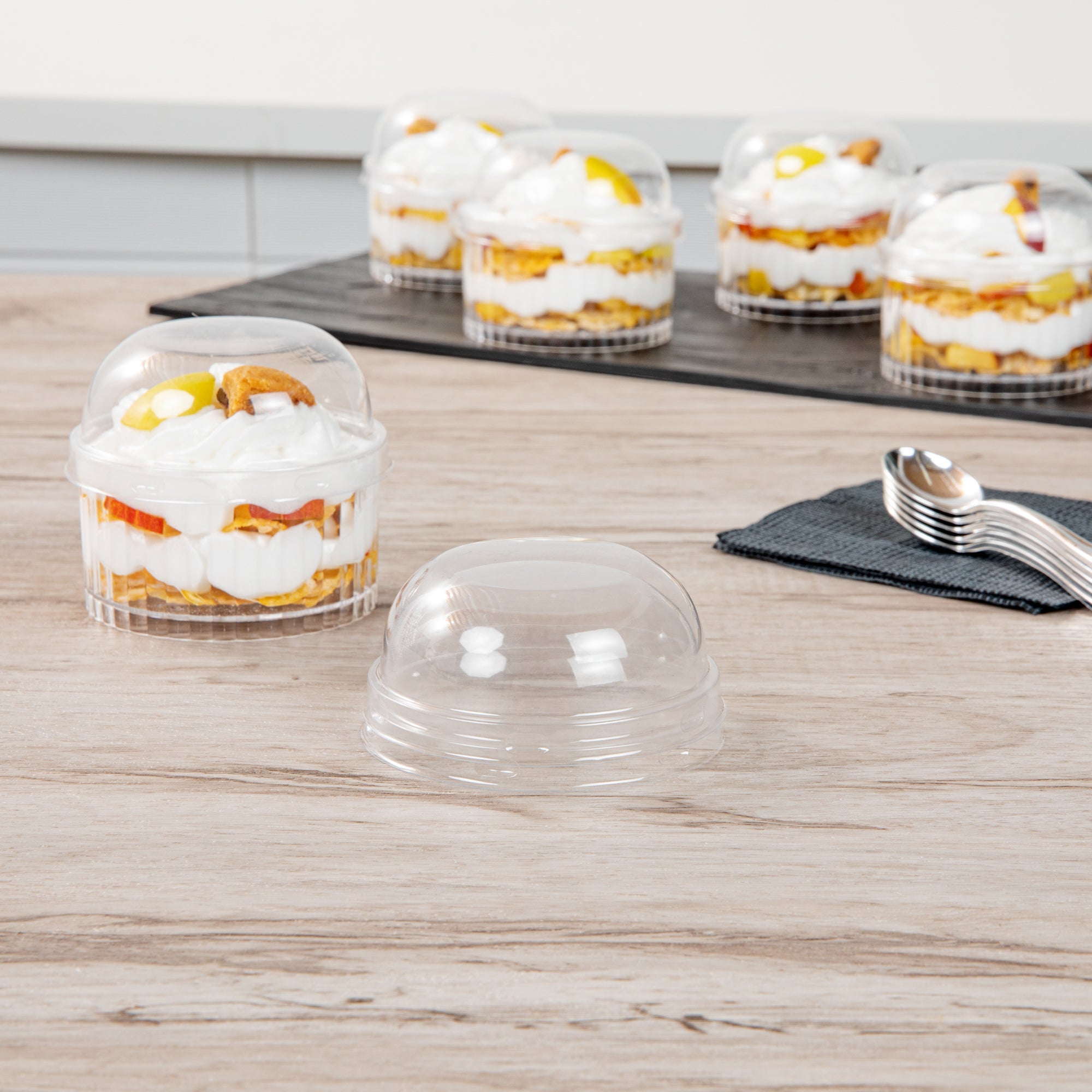 Elevate your dessert presentations with our Mini Serve Round Clear Plastic Dome Lids. These plastic dome lids, crafted from durable PS plastic, are built to withstand the rigors of any bustling kitchen or event. The clear dome lid's unique design not only showcases the appealing aesthetics of your cold food offerings but also provides extra space for dessert toppings. With a clear finish, these recyclable dessert cup lids allow for easy identification and display of your sweet treats, making them perfect for buffets, catering events, or dessert shops. The stackable design of these clear plastic lids ensures efficient storage, saving valuable space in your kitchen. These disposable plastic dome lids provide an easy cleanup after use. Measuring 3 inches in diameter by 1.25 inches in height, these clear dome lids are designed to pair perfectly with our 4-ounce fluted dessert cups (RWP1416C), creating a uniform and professional look. Sold in a 100 count box. Dessert cups are available and sold separately.