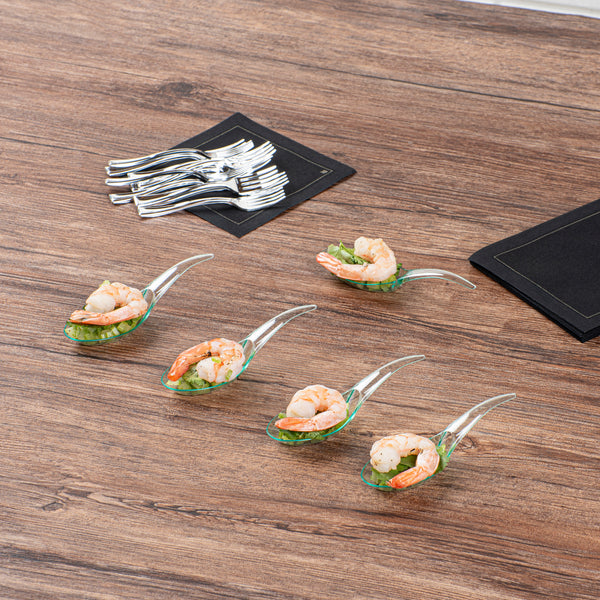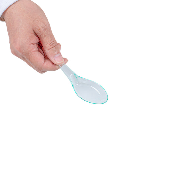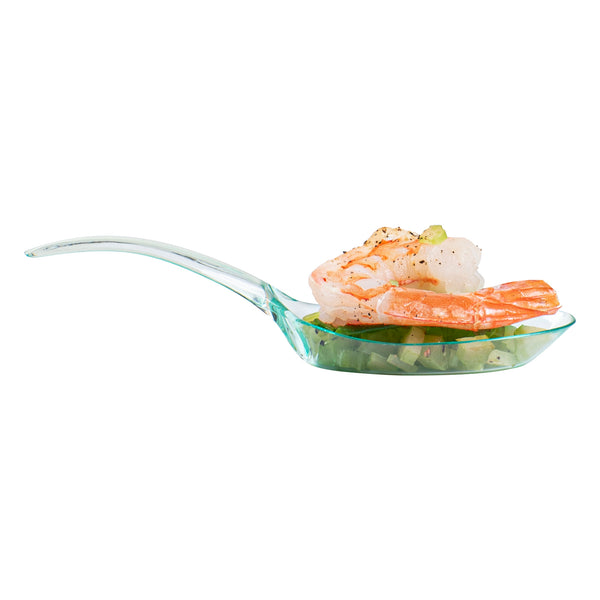 Transform your catering experience with our Mini Serve Seagreen Plastic Wave Spoons. With a chic seagreen tone combined with a distinctive curved handle, these appetizer spoons impart an irresistible appeal to any event. The elongated basin of these plastic wave spoons facilitates ample space for perfectly portioning bite-sized appetizers and dainty desserts, while the flat base ensures a seamless and elegant service. Crafted from superior plastic, these amuse bouche spoons are disposable for swift and effortless cleanup. Each of these seagreen appetizer spoons measures 5 inches in length by 1.5 inches in width. Sold in a 100 count box.