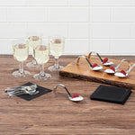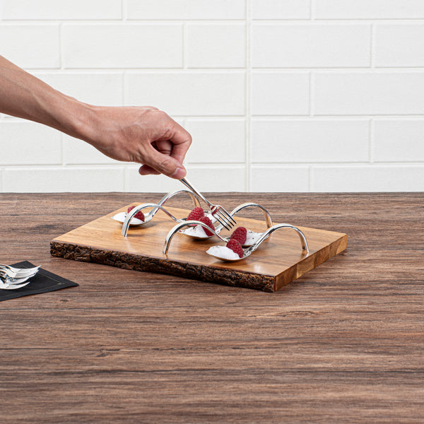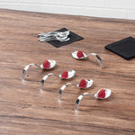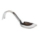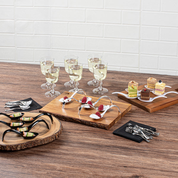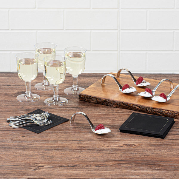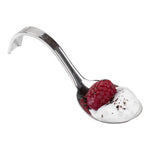 Add an elegant touch to tapas and hors d'oeuvres with our Mini Serve Silver Plastic Curly Tasting Spoons. The high-shine and reflective finish of these disposable tasting spoons create a striking backdrop for your culinary creations. With a shallow basin design, these plastic display spoons beautifully showcase your bite-sized appetizers and desserts. Built with a dramatically curved handle, these amuse bouche spoons are able to stand on their own for convenient and hands-free service. To make the cleaning process super easy, these food display spoons are disposable. Combining a sleek design with a realistic burnished silver finish, these appetizer spoons effortlessly enhance the presentation of any catered event or foodservice establishment. Each of these contemporary silver plastic spoons measures 4 inches in length by 1.25 inches in width, making them ideal for presenting beautiful bite-sized creations. Sold in a 100 count box.