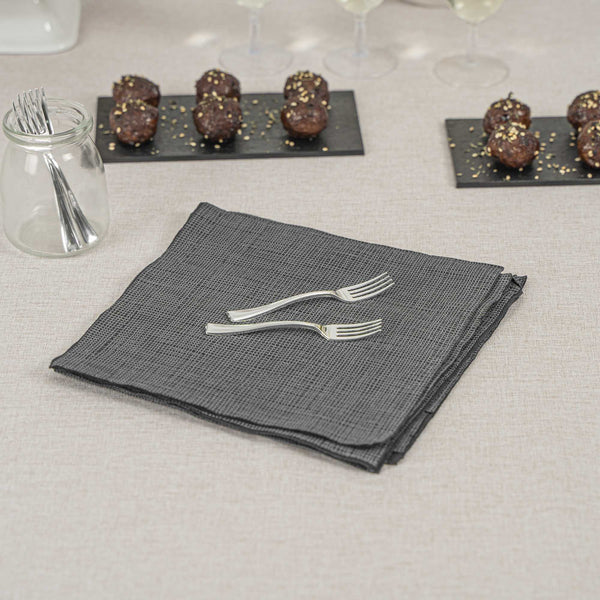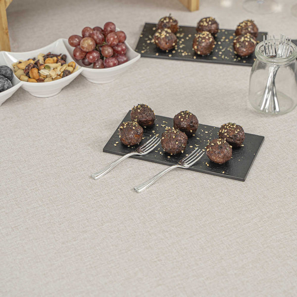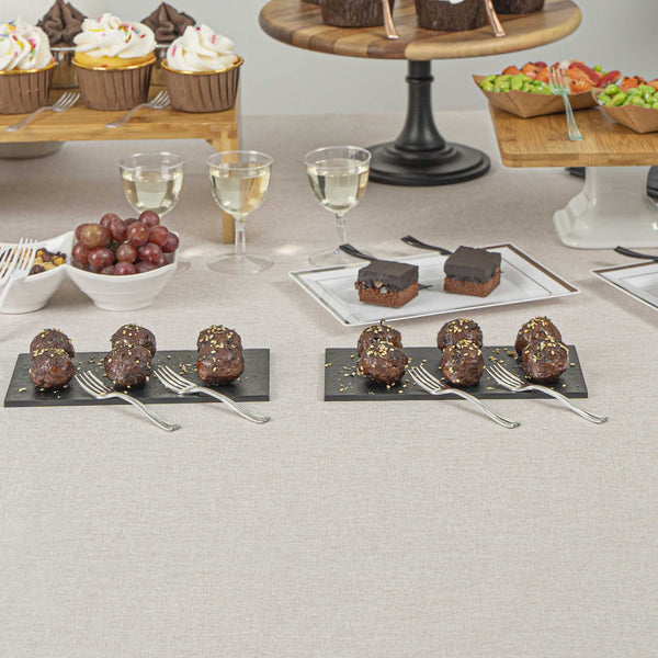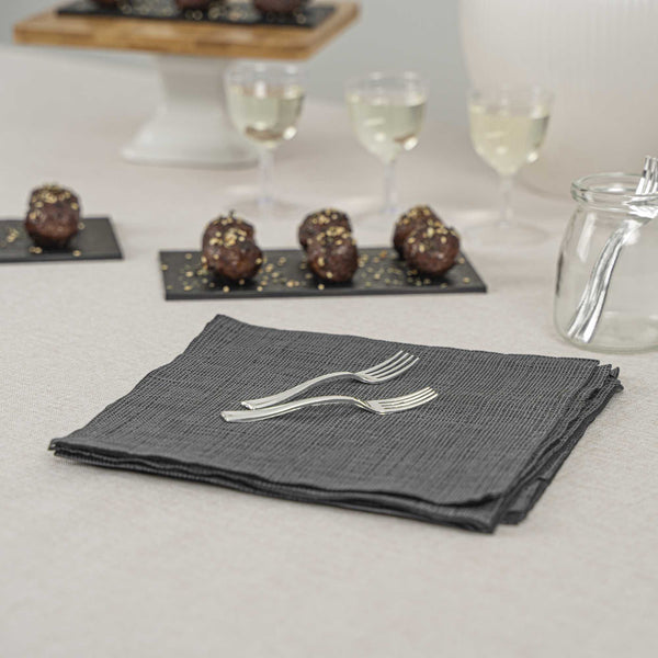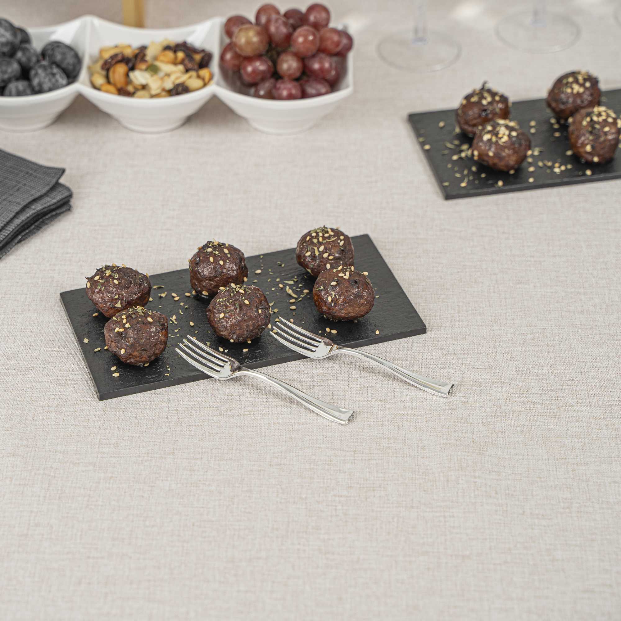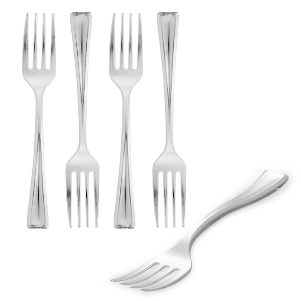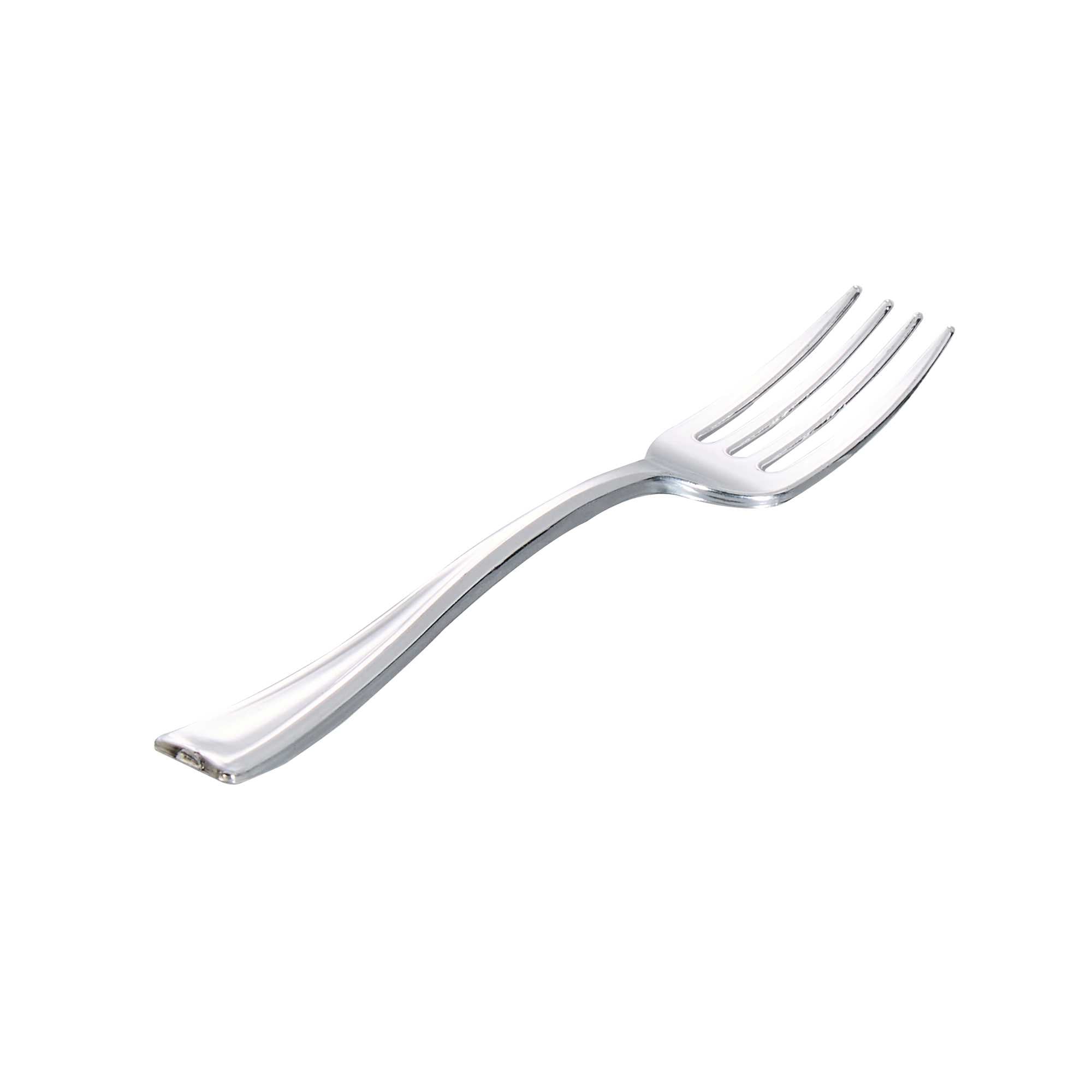 Elevate the look of your table setting with our Mini Serve Silver Plastic Mini Forks. Featuring a shiny silver finish, these silver plastic forks are designed to effortlessly enhance the presentation of your tantalizing dishes. With their strong and sturdy handles, these cake forks are built to stand up to hefty bites of polenta and big scoops of gelato. Made from premium plastic, these appetizer forks are conveniently disposable and recyclable, making them a perfect flatware option for eco-conscious cafes, venues, and clients. Measuring 4 inches in length, these single-use forks are the ideal size to accompany miniature tuna tartare or personal-sized strawberry shortcakes. Shipped in a 100 count box.