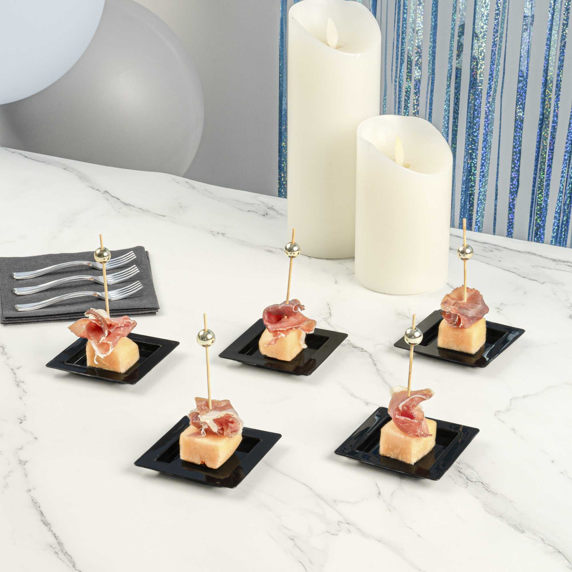 Provide a premium disposable plating solution for appetizers and small bites with our Mini Serve Square Black Plastic Mini Edge Plates. These geometric square plates add an elegant design for displaying hors d'oeuvres. Constructed of sturdy plastic, these mini disposable plates are greaseproof. The premium plastic construction ensures these small square plates are durable enough for catering events. Perfect for food displays, these square black plastic plates for cold foods allow appetizers to shine. Great for catering, the geometrical appetizer plates are disposable to minimize cleanup. With a classy black finish, these appetizer plates add a touch of sophistication to the food presentation. With a capacity of 1 ounce, these mini appetizer plates measure 2.75 inches in length by 2.75 inches in width. Sold in a 100 count box.