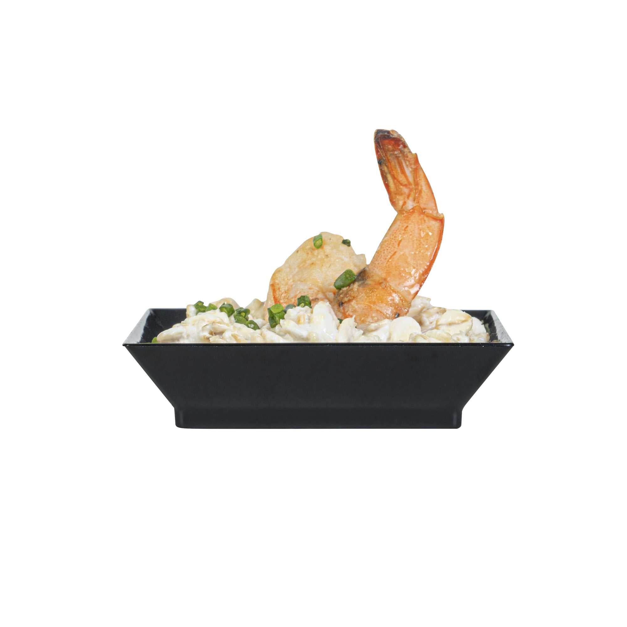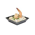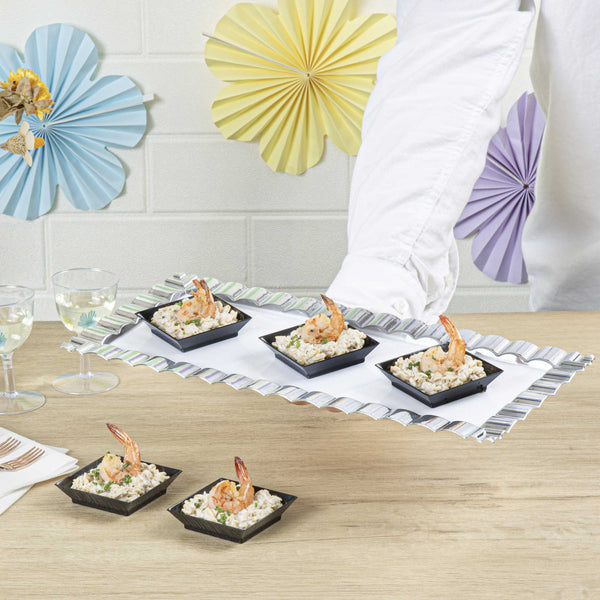 Use our Mini Serve Square Black Plastic Mini Modern Plates as a beautiful blank canvas to artfully plate your fare for catered events or cocktail parties. These durable square plastic plates are designed to be sturdy without chipping or breaking during use. These sophisticated disposable plates feature raised edges that are great for keeping your plating and presentation chic and organized. Plus, the protective edges of these starter plates help to ensure easy and mess-free serving. With a sophisticated black finish, these medium-sized plastic plates are the perfect backdrop for displaying your delectable fares. Measuring 2.5 inches in length by 2.5 inches in width, these plastic plates are ideal for all catering services. Sold in a 25 count box.