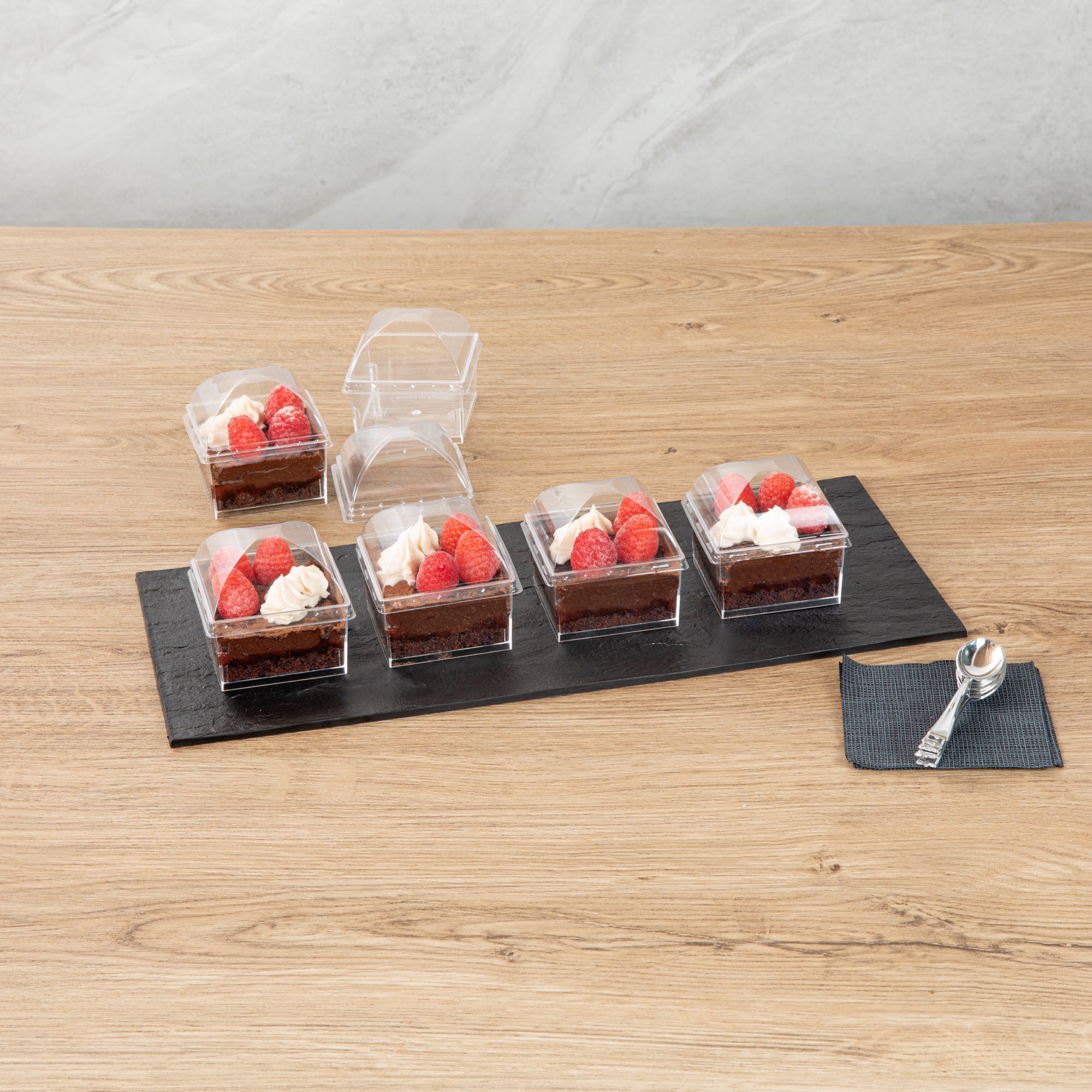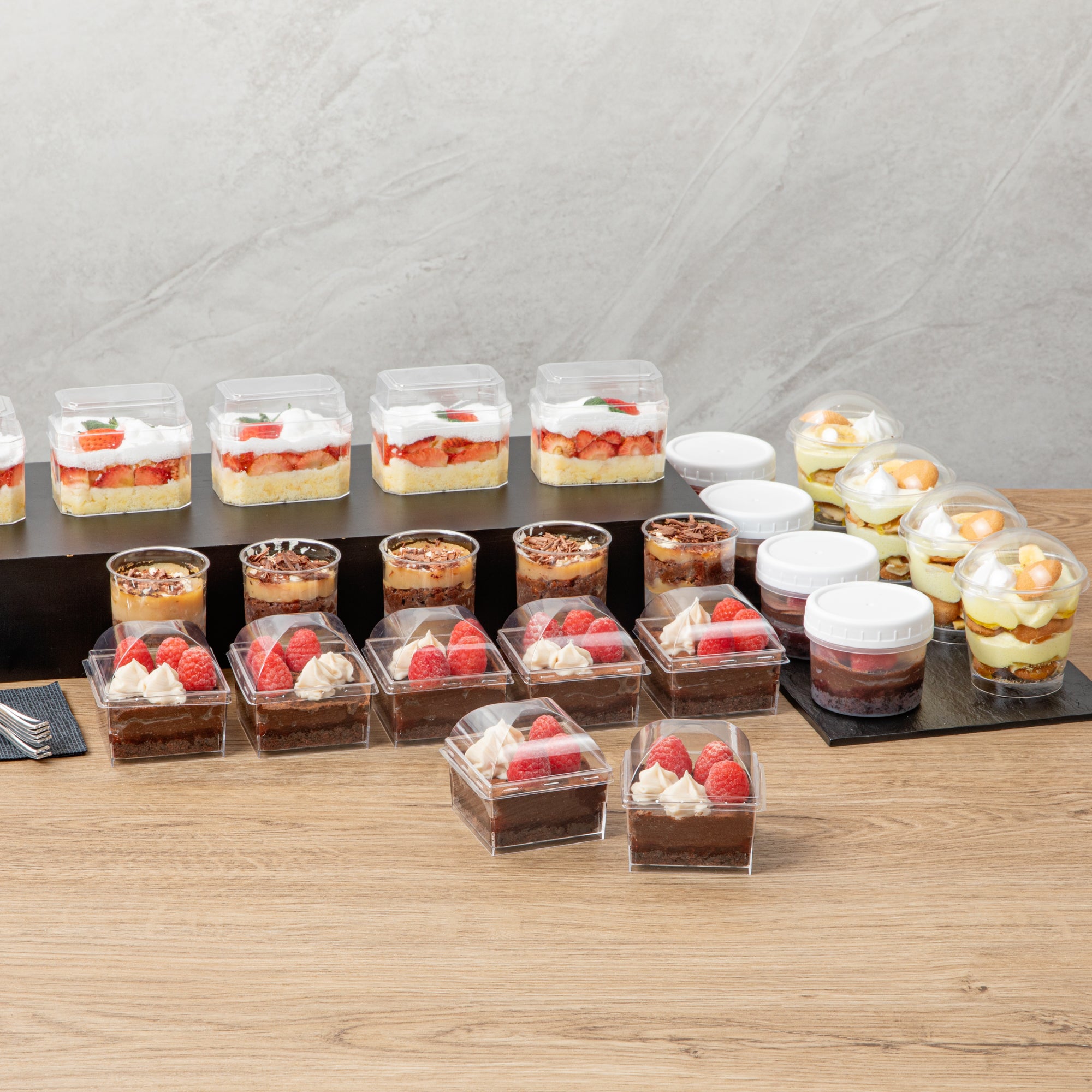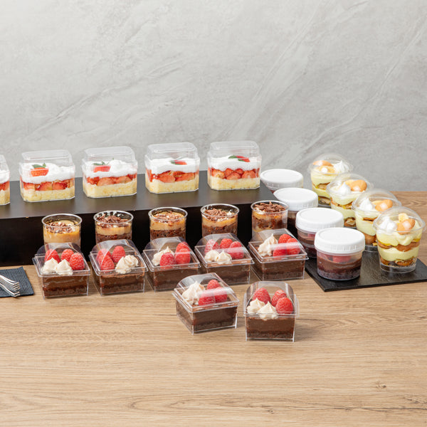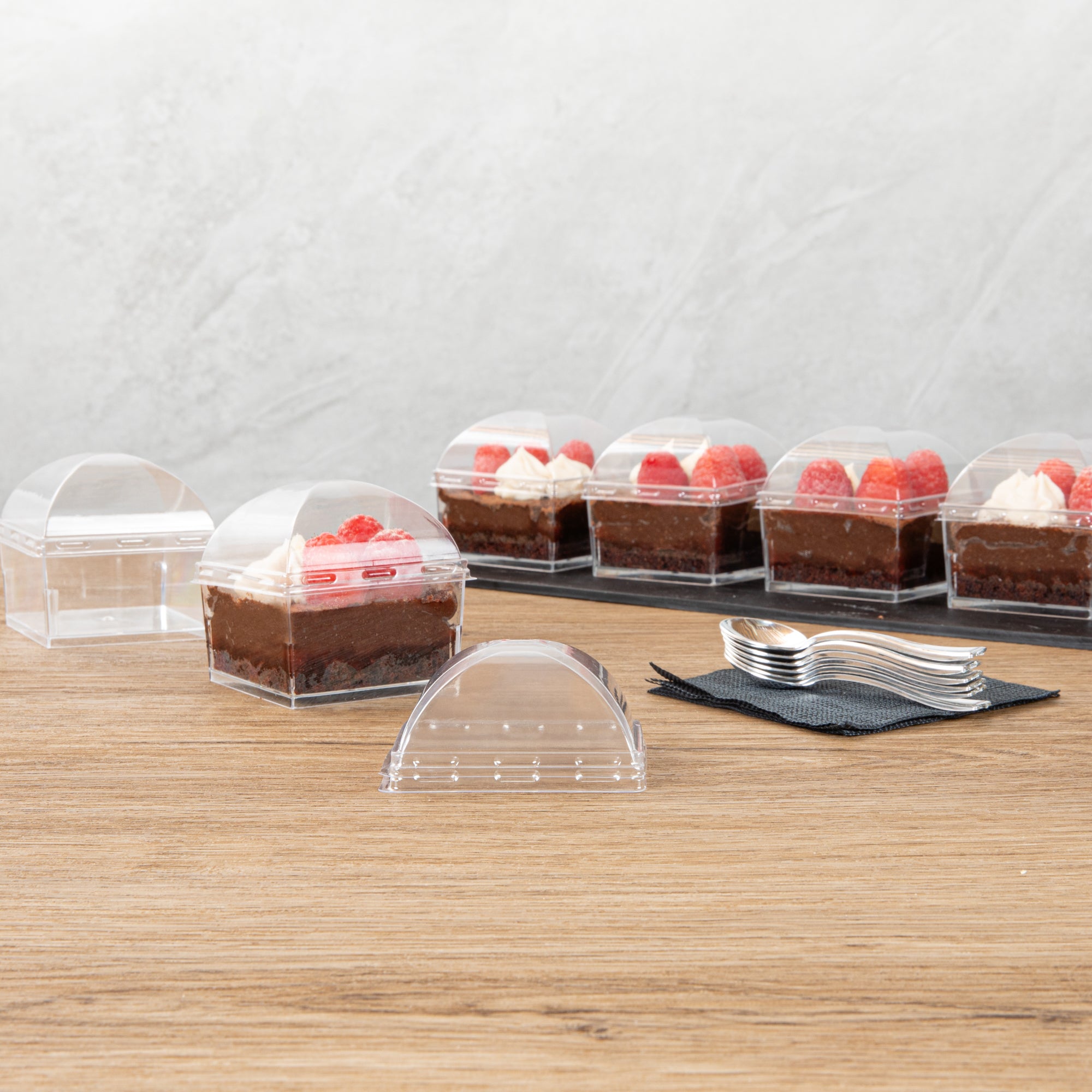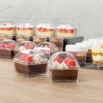 Upgrade your dessert presentations with our Mini Serve Square Clear Plastic Dome Lids. These plastic dome lids are made from durable PS plastic, ensuring a secure cover for your delicious treats. Perfectly suited for cold foods, these dome lids are designed to pair effortlessly with 5-ounce dessert cups (RWP1418C). These clear plastic lids showcase your culinary creations while keeping them fresh and appetizing. With their stackable design, these recyclable dessert cup lids maximize storage space in your restaurant or catering facility. Measuring 2.75 inches in diameter by 1.25 inches in height, these disposable clear dome lids conveniently fit atop square dessert cups for ease of transport and display. Sold in a 100 count box. Dessert cups are available and sold separately.