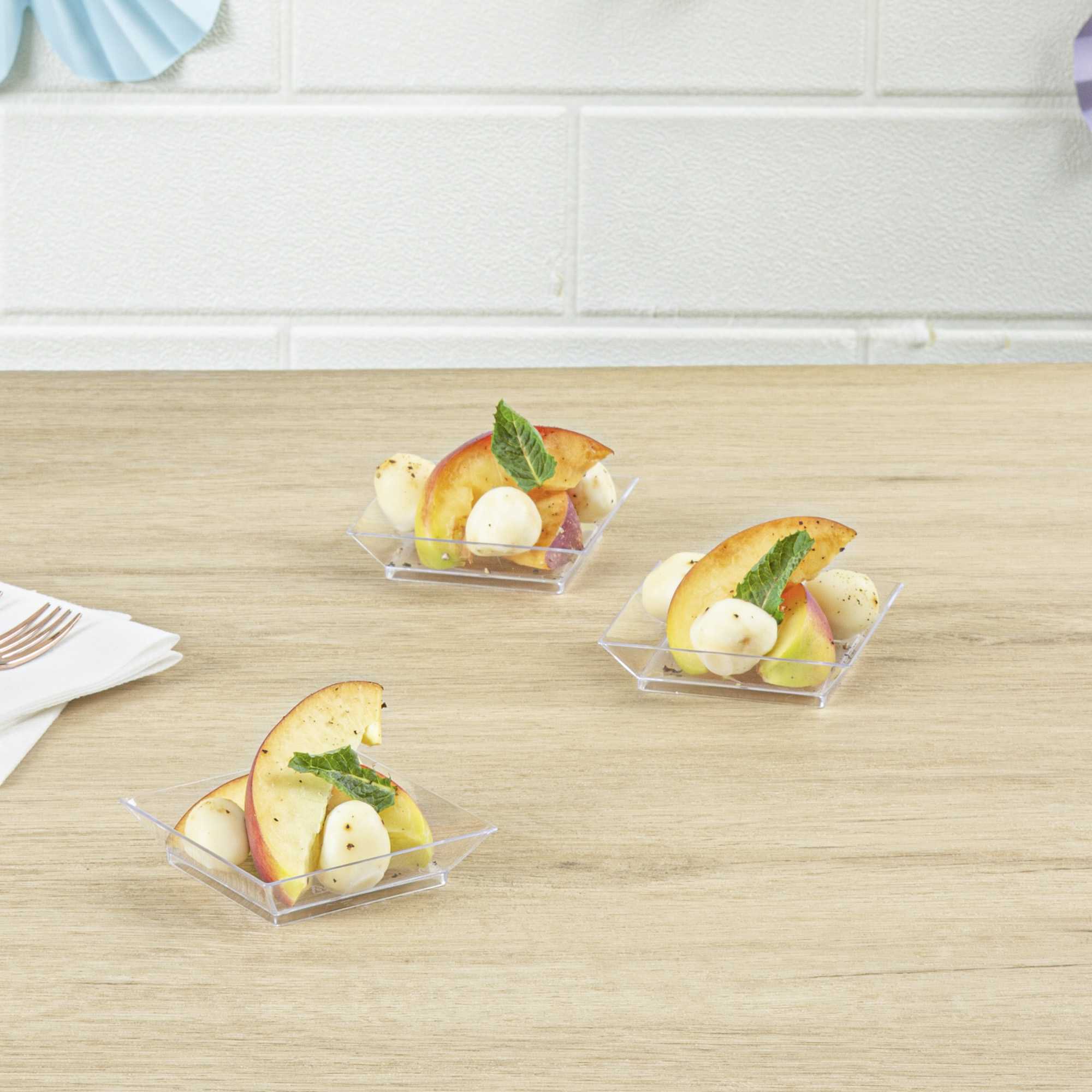 Our Mini Serve Mini Serve Square Clear Plastic Mini Modern Plates serve as an elegant blank canvas for creatively presenting your culinary creations at catered events or cocktail parties. Crafted for durability, these square plastic plates are engineered to maintain their sturdiness without the risk of chipping or breaking during use. These refined disposable plates boast raised edges, enhancing the sophistication of your plating while ensuring a neat and organized presentation. Plus, these starter plates' protective edges facilitate effortless and mess-free serving. These disposable plates are designed with sustainability in mind. Featuring a clear finish, these medium-sized plastic plates provide the perfect backdrop for showcasing your delicious dishes. Measuring 2.5 inches in length and 2.5 inches in width, these plastic plates are well-suited for a variety of catering services. Sold in a 100 count box.