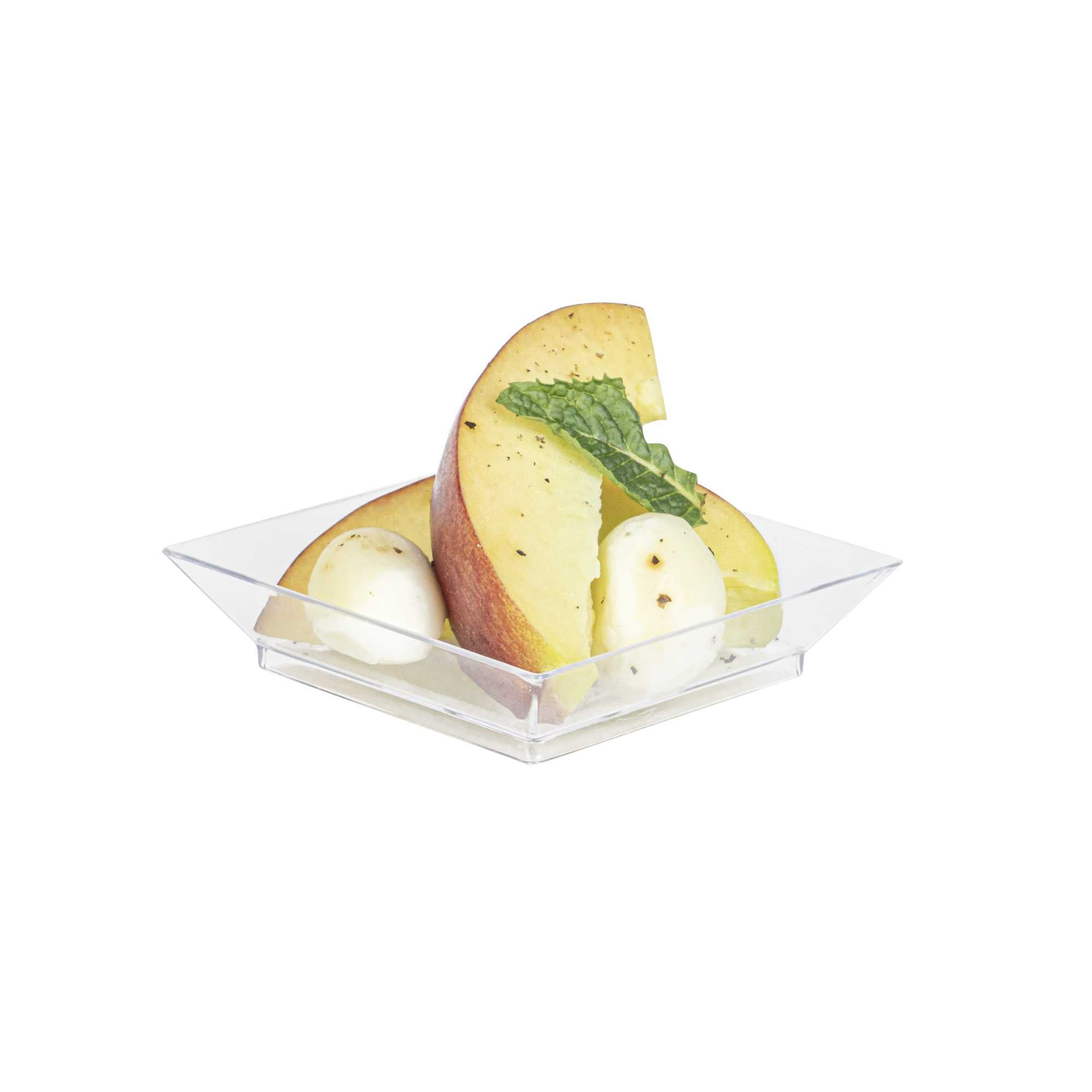 Our Mini Serve Mini Serve Square Clear Plastic Mini Modern Plates serve as an elegant blank canvas for creatively presenting your culinary creations at catered events or cocktail parties. Crafted for durability, these square plastic plates are engineered to maintain their sturdiness without the risk of chipping or breaking during use. These refined disposable plates boast raised edges, enhancing the sophistication of your plating while ensuring a neat and organized presentation. Plus, these starter plates' protective edges facilitate effortless and mess-free serving. These disposable plates are designed with sustainability in mind. Featuring a clear finish, these medium-sized plastic plates provide the perfect backdrop for showcasing your delicious dishes. Measuring 2.5 inches in length and 2.5 inches in width, these plastic plates are well-suited for a variety of catering services. Sold in a 20 count box.