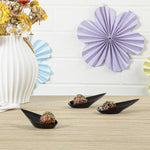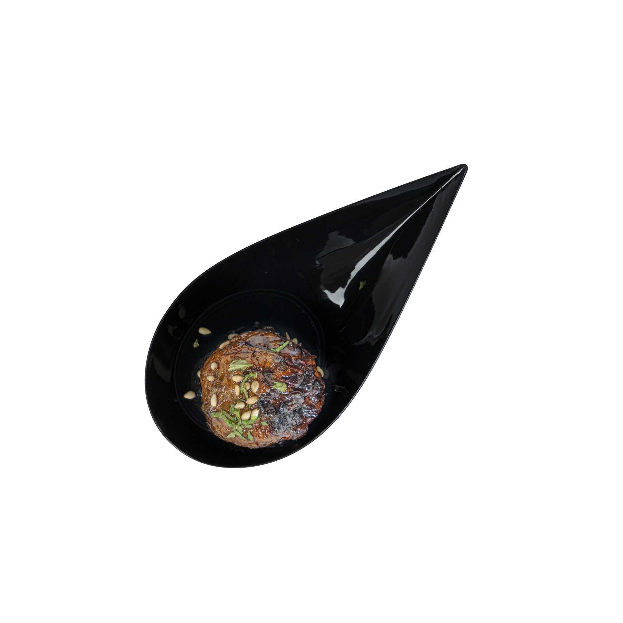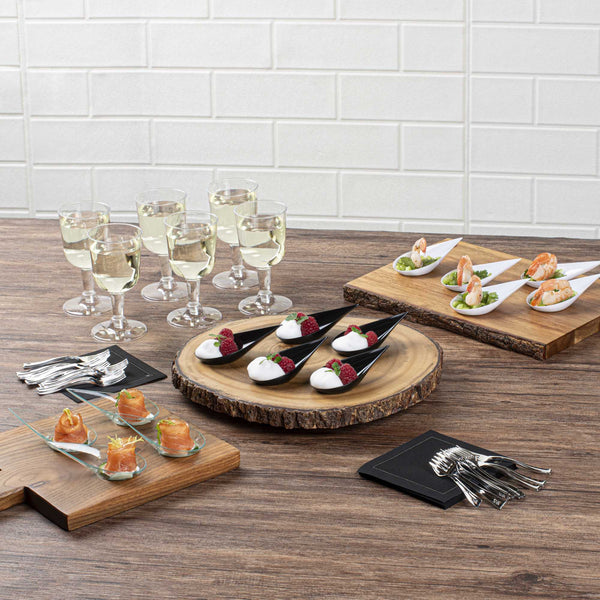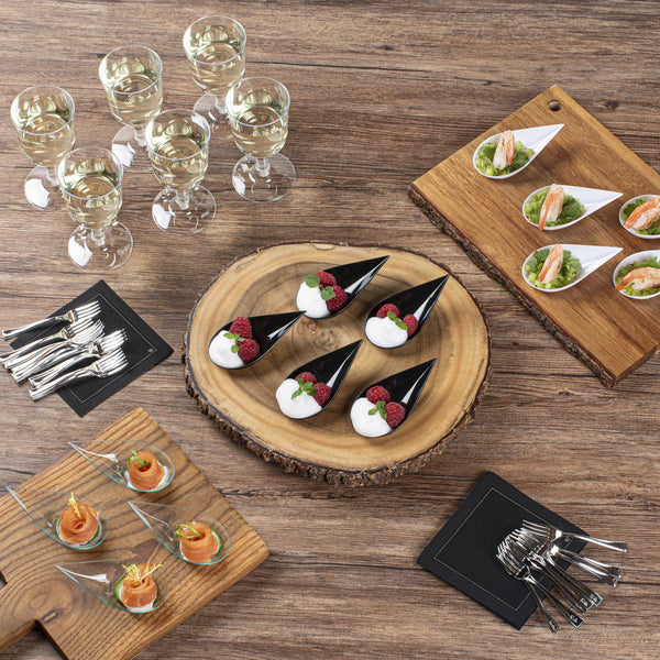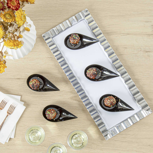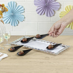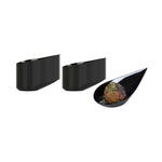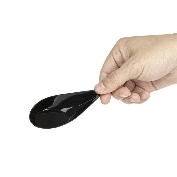 Create attention-grabbing appetizer and dessert displays with our Mini Serve Teardrop Black Plastic Spoons. Featuring a contemporary teardrop design, these black plastic spoons add a touch of modern elegance to any occasion. The wide, indented basins of these plastic spoons expertly contain your culinary creations, while their polished black finish easily matches any venue or decor. Built with a flat base and a sleek pointed handle, these mini appetizer spoons are designed to add trendsetting sophistication to any food presentation. Each of these plastic appetizer spoons measures 4 inches in length by 2 inches wide and has a capacity of up to 1 ounce. Ideal for cocktail parties, tasting events, and other catered functions, these upscale appetizer spoons are conveniently disposable for quick and easy cleanup. Sold in a 100 count box.