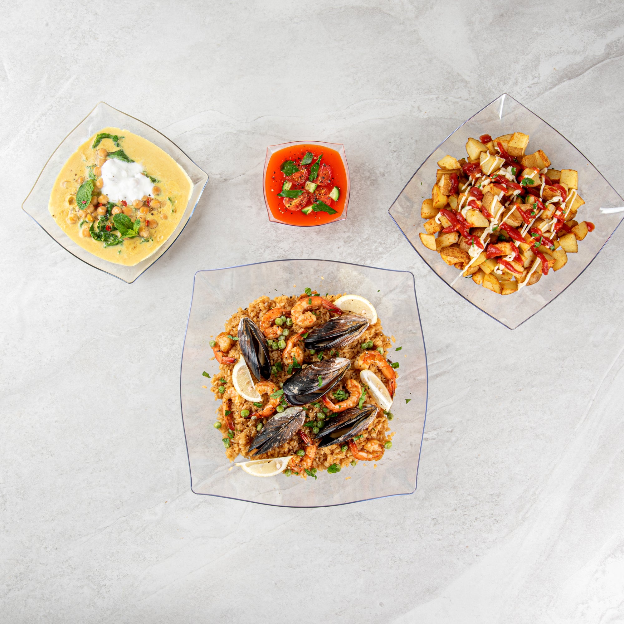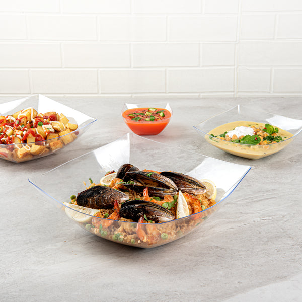 Experience elegance in dinnerware with our Moderna 128-ounce Square Black Plastic Serving Bowls. These durable polystyrene bowls effortlessly handle hefty portions. Suitable for a wide range of warm and cold foods up to 150F, these serving bowls are perfect for serving poke or smoothie bowls. With a greaseproof design, these clear plastic bowls prevent oil leakage. Disposable for easy cleanup, these dinner bowls promote sustainability as recyclable options. Enhancing the food presentation with their sleek black finish, these recyclable plastic bowls add sophistication to your enticing dishes. Measuring 12 inches in length by 12 inches in width by 4 inches in height, each square bowl has a capacity of 128 ounces. Shipped in a 10 count box.