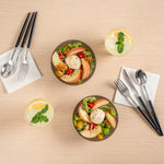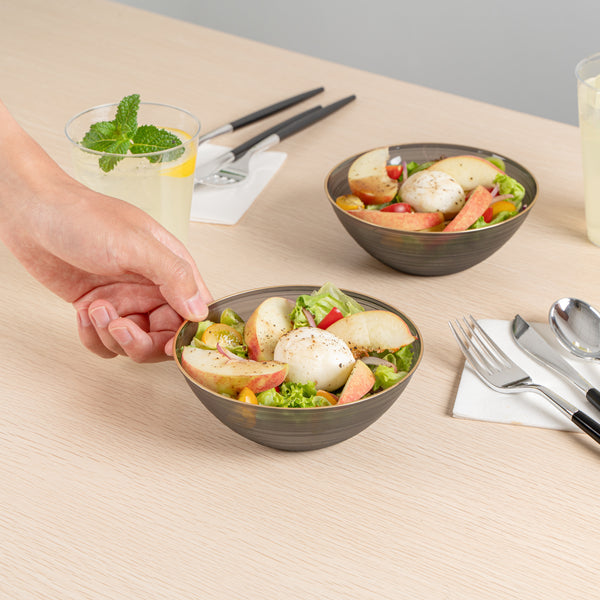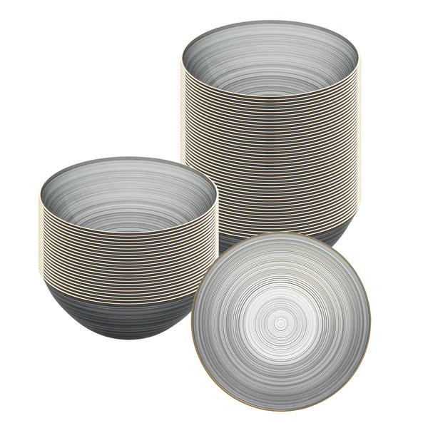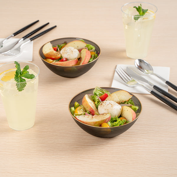 Effortlessly elevate any event with disposable bowls that combine convenience and elegance. Moderna Black Plastic Disposable Bowls with a Gold Rim offer a disposable design that ensures quick and efficient cleanup, saving you valuable time after your gatherings. These black plastic bowls feature a striking gold rim that enhances the presentation of any dish, providing an elegant touch to your tablescapes for weddings, parties, and catered events. With dimensions of 5.6 inches by 5.6 inches by 2 inches, these bowls are ideal for serving a variety of dishes in style. They are both durable and safe, making them perfect for foodservice professionals seeking reliable party serving bowls. Whether for family gatherings or holiday celebrations, these bowls are suitable for all occasions, ensuring a seamless dining experience. Each order includes 100 Moderna Black Plastic Disposable Bowls with a Gold Rim.