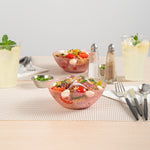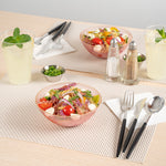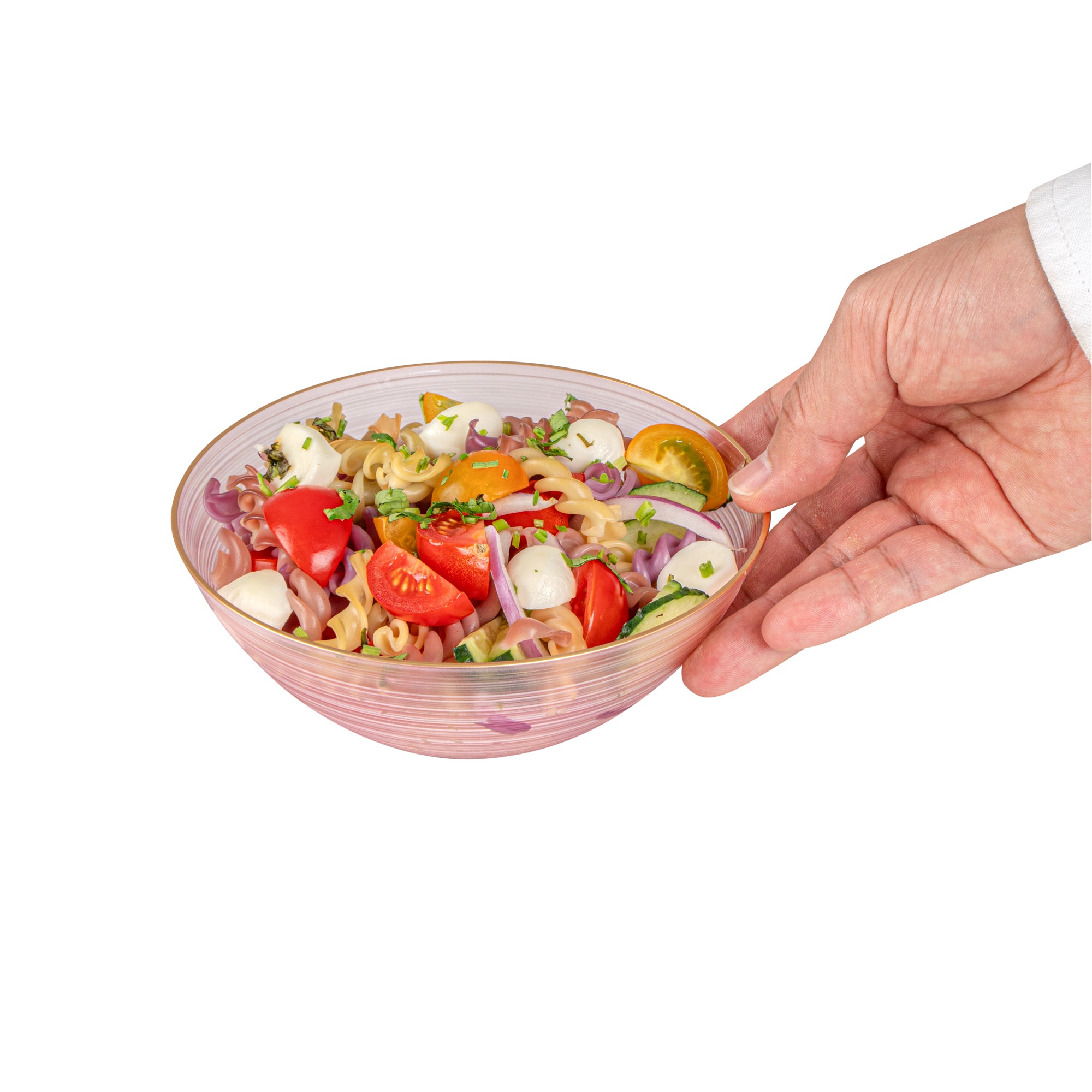 Ensure elegant presentations with effortless cleanup. Moderna Elegant Design Pink Plastic Disposable Serving Bowls feature a rippled design with a sophisticated gold rim, adding a touch of class to any table setting. Crafted from high-quality plastic, these disposable serving bowls offer durable construction that ensures sturdiness and reliability for catering events. The pink translucent material provides an attractive presentation for dishes, making these bowls ideal as plastic salad bowls for upscale dining. With a 16-ounce capacity and dimensions of 5.6 inches by 5.6 inches by 2.05 inches, they are versatile for serving salads, desserts, or appetizers at weddings and family gatherings. Their convenient disposable design reduces post-event cleanup time, making them perfect for busy catering services. Elevate your dining experience with these elegant plastic bowls, enhancing your event's ambiance. Each order includes 100 Moderna Elegant Design Pink Plastic Disposable Serving Bowls.