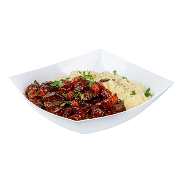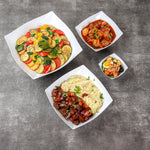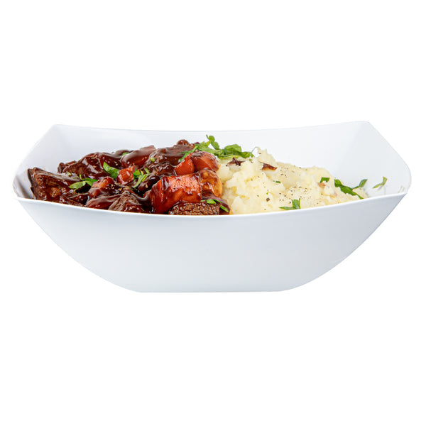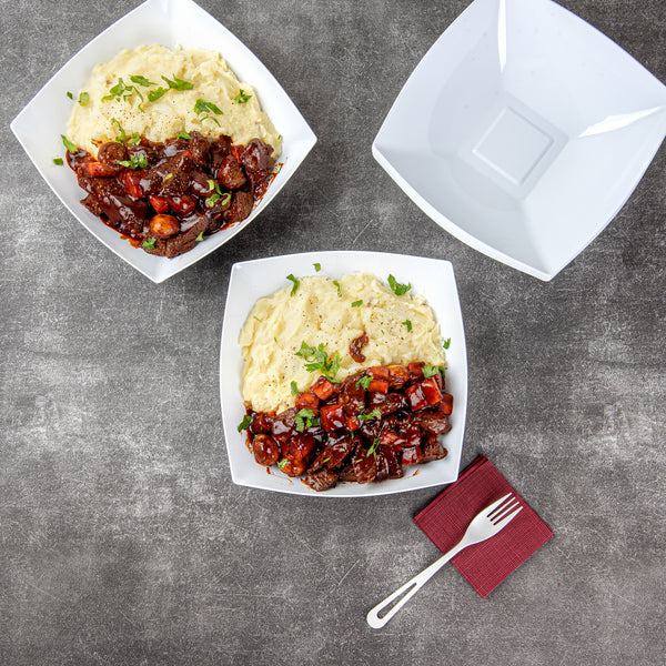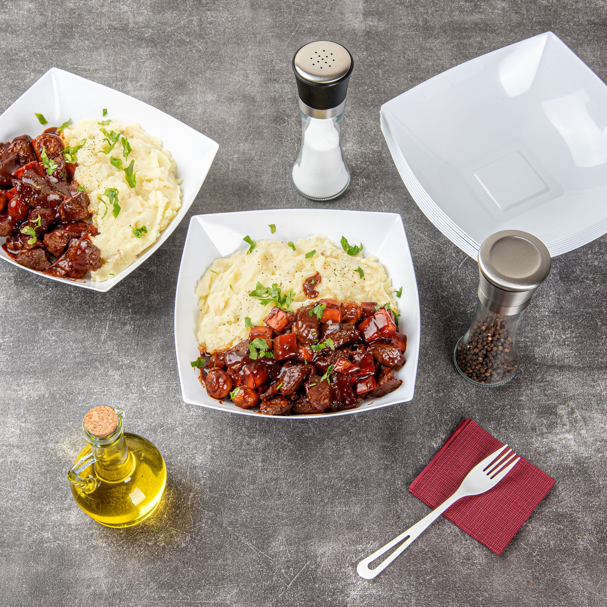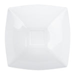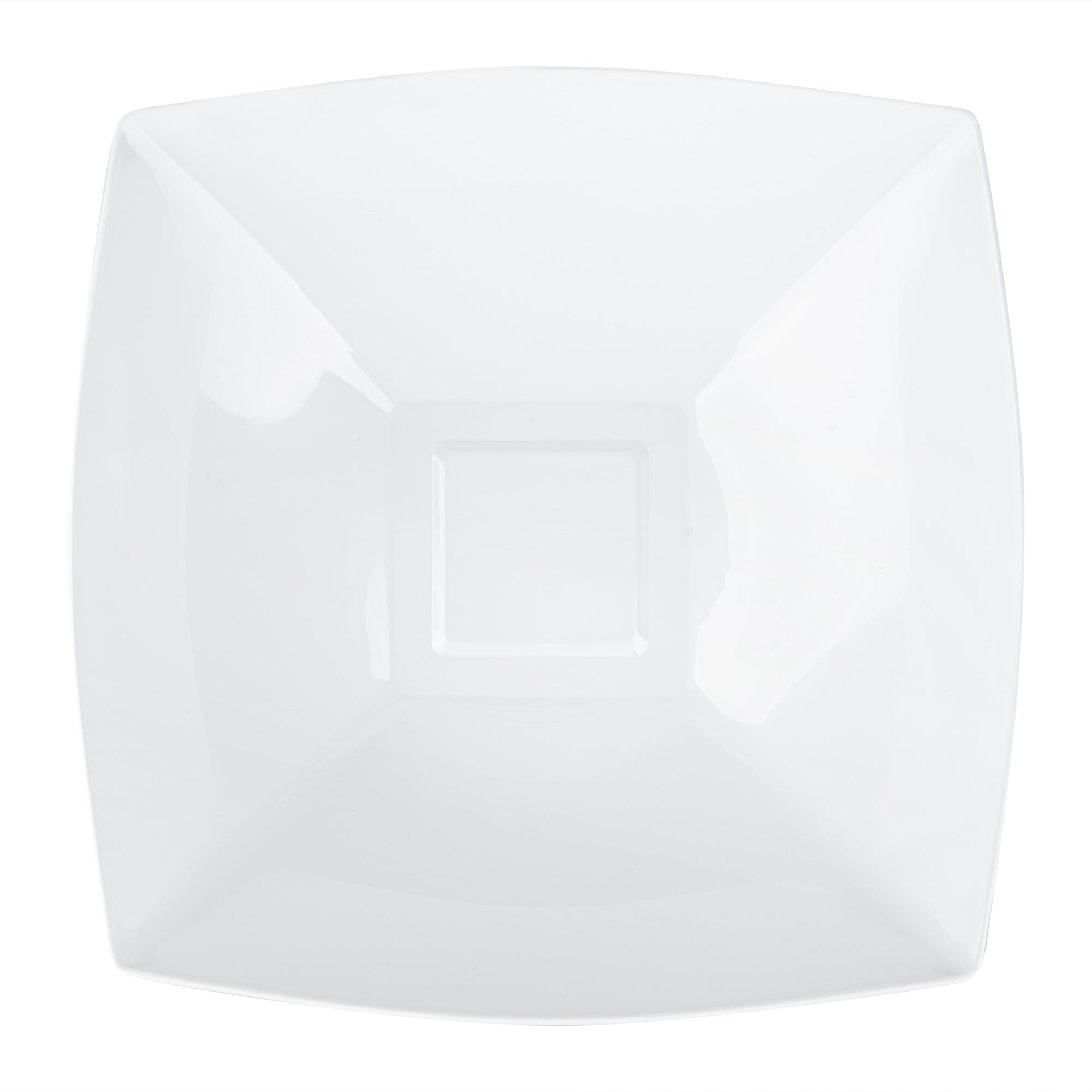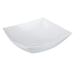 Offer stylish and practical food service with our Moderna 64-ounce Square White Plastic Bowls. Constructed from high-quality plastic, these recyclable bowls are well-suited for warm and cold food offerings, from fruit platters to pasta salads. The greaseproof characteristic feature ensures that saucy dishes remain neatly contained, making them ideal for hospitality or catering use. With a temperature resistance of up to 150°F, they are a reliable addition to any foodservice setup. The crisp white finish enhances the visual appeal of meals and blends effortlessly into formal and casual settings alike. Each of these disposable square bowls measures 9.69 inches in length by 9.69 inches in width by 2.95 inches in height and has a capacity of 64 ounces. Sold in a 100 count box.