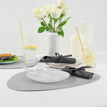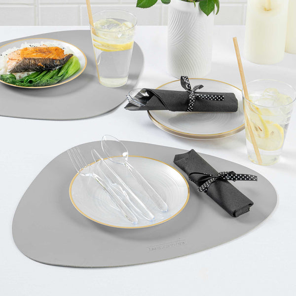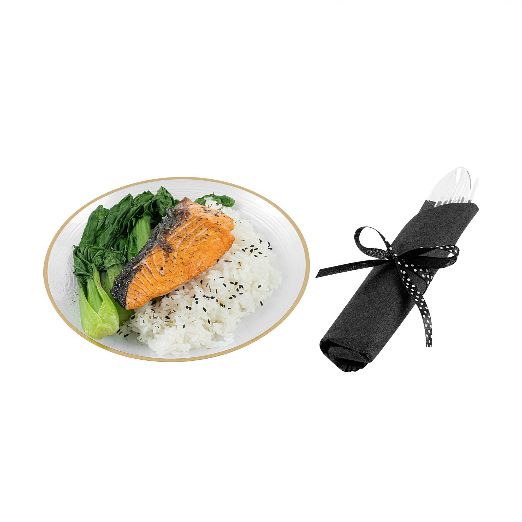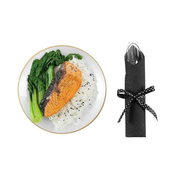 Simplify cleanup and elevate your presentation with the Moderna Recyclable Plastic Cutlery Set. Crafted from durable plastic, this plastic cutlery set is designed for easy post-event cleanup, ensuring that your foodservice operations remain efficient. Its recyclable design makes it an eco-friendly choice, while the cold food-friendly construction allows you to serve salads and desserts with confidence. Each disposable utensils set includes a napkin and is elegantly tied with a charming polka-dotted ribbon, providing an upscale presentation for banquets, catering events, or casual gatherings. Measuring 7.25 inches in length and 2 inches in width, this plastic fork knife spoon set is perfect for both wet and dry foods, offering versatility and reliability in every use. Make a sustainable choice without compromising on quality or style. Each order includes 100 Moderna Recyclable Plastic Cutlery Sets.