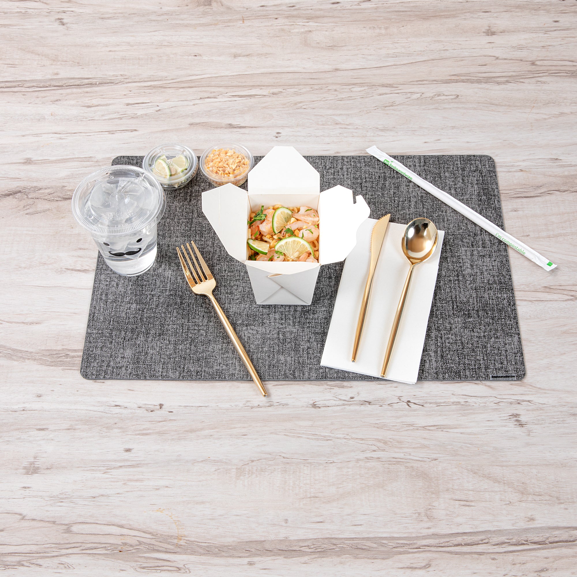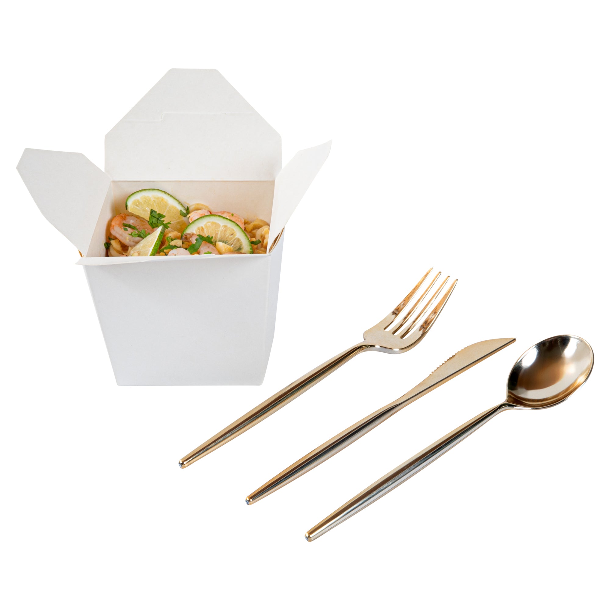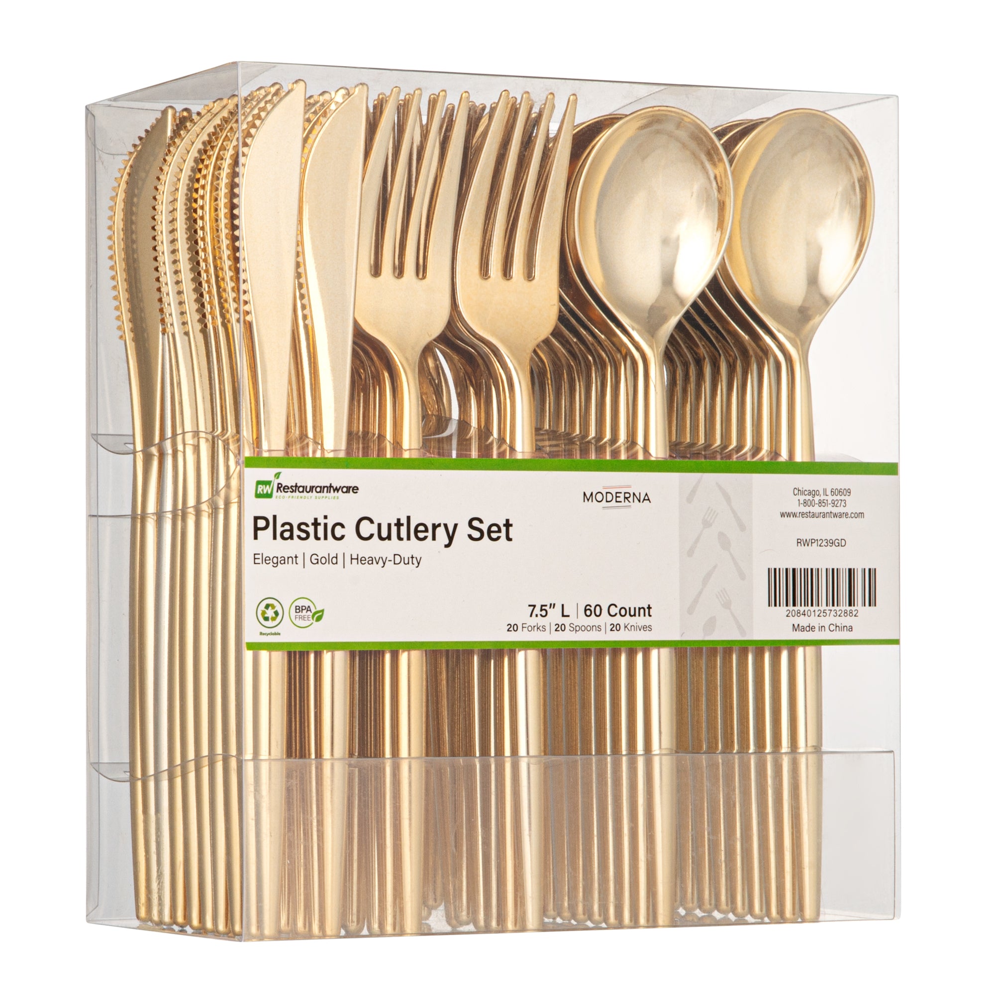 Elevate your dining experience with our exquisite Moderna Gold Plastic Cutlery Sets. These party cutlery sets feature high-quality polystyrene utensils, ensuring durability and elegance at every meal. The reinforced handle of this recyclable plastic flatware for dinner ensures they don't break easily. With a regal gold finish, these heavy-duty plastic flatware sets add a stylish touch to your table decor. These disposable sets include 20 forks, 20 knives, and 20 spoons, making them perfect for large gatherings. To simplify post-event cleanup, these plastic flatware sets are disposable. Each utensil in these party cutlery sets measures 7.5 inches long. Shipped in a 60 count box.