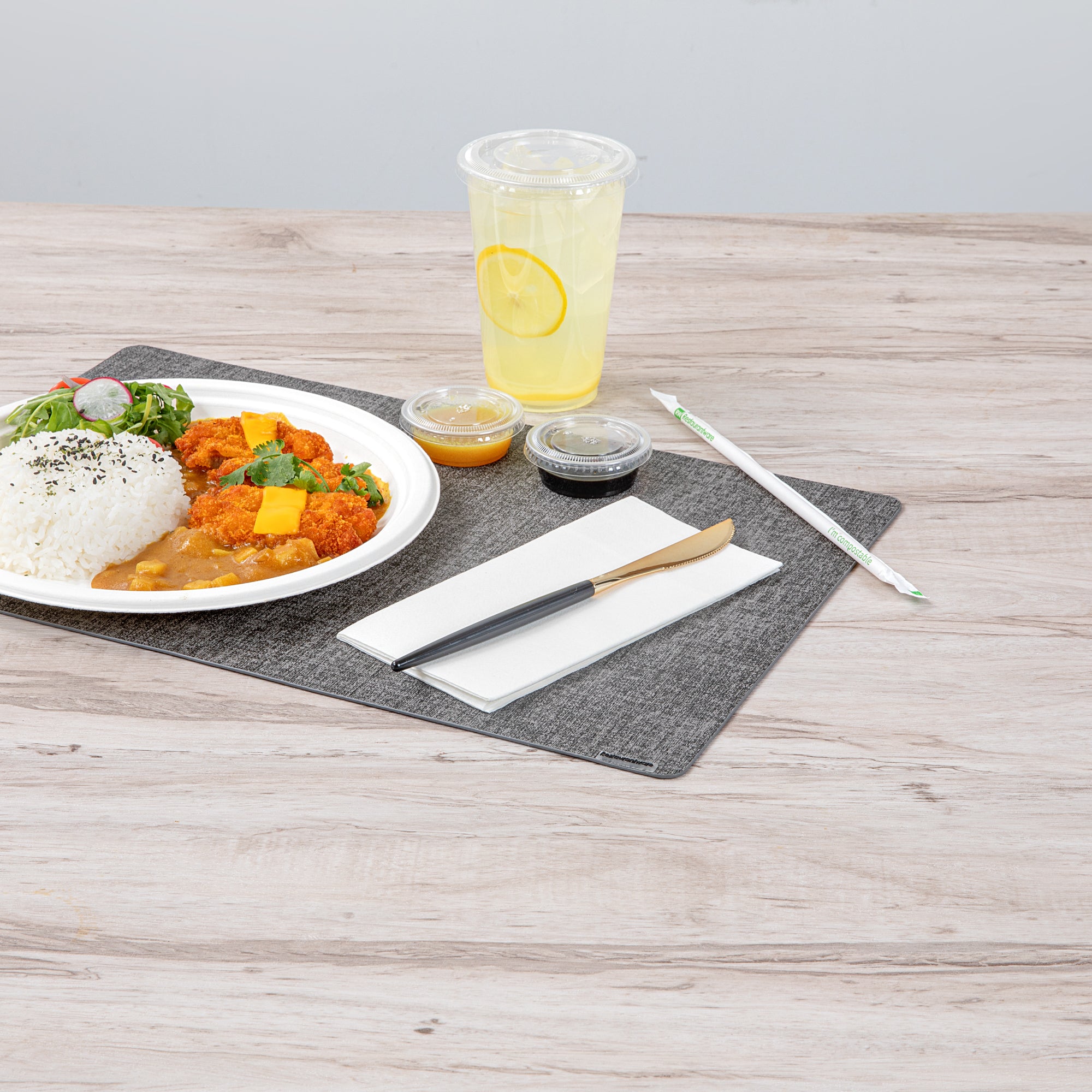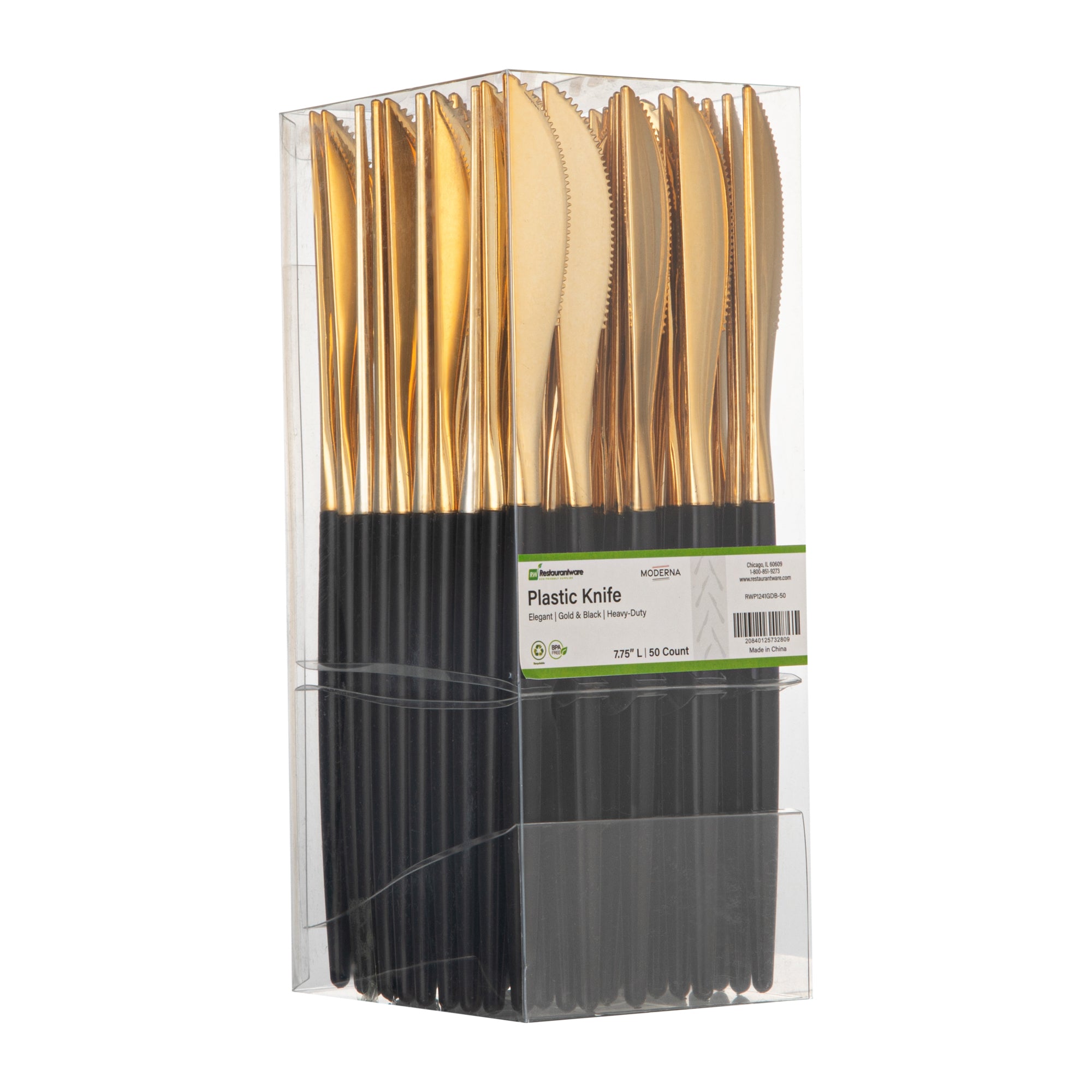 Spread butter and jam easily over your bread slices using our Moderna Gold Plastic Knives. Made from top-quality polystyrene plastic, these recyclable knives for desserts are durable and do not bend or break while using them. With a smooth black-finish handle, these disposable knives provide you with a firm grip while cutting your meat. The serrated edges of this plastic cutlery let you slice cakes easily without having to apply much pressure. These disposable plastic knives come in a royal golden shade to serve your dishes in style. Each of these plastic knives measures 7.75 inches in length and is ideal for hot or cold foods up to 167F. Sold in a 50 count box.
