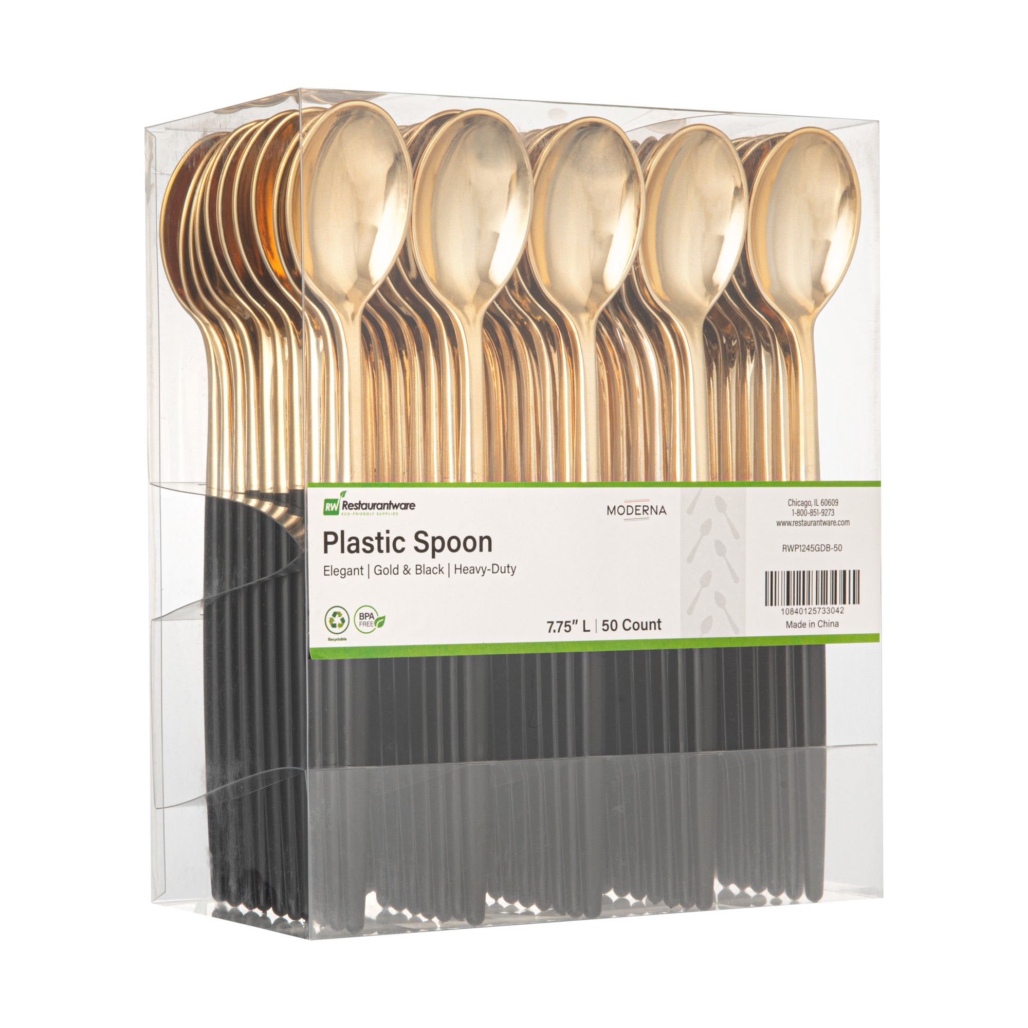 Embrace the modern aesthetic with our Moderna Gold Plastic Spoons. Expertly crafted from durable polystyrene plastic, these plastic spoons are built to withstand the demands of scooping a variety of food items. These plastic utensils are, ensuring that no harmful substances will contaminate your meals. With an impressive resistance to temperatures up to 150F, these gold spoons effortlessly accommodate both hot and cold dishes with ease. Plus, these gold spoons with white handles are recyclable, offering an environmentally friendly option that allows you to minimize your carbon footprint. Designed for your convenience, these fancy plastic silverware pieces are specifically crafted for easy disposal, making them an ideal choice for large events and gatherings. Adorning gold and black finish, these fancy plastic utensils add a touch of elegance to your tablescape, elevating your dining setting. Each utensil in these party cutlery sets measures 7.75 inches long. Shipped in a 50 count box.