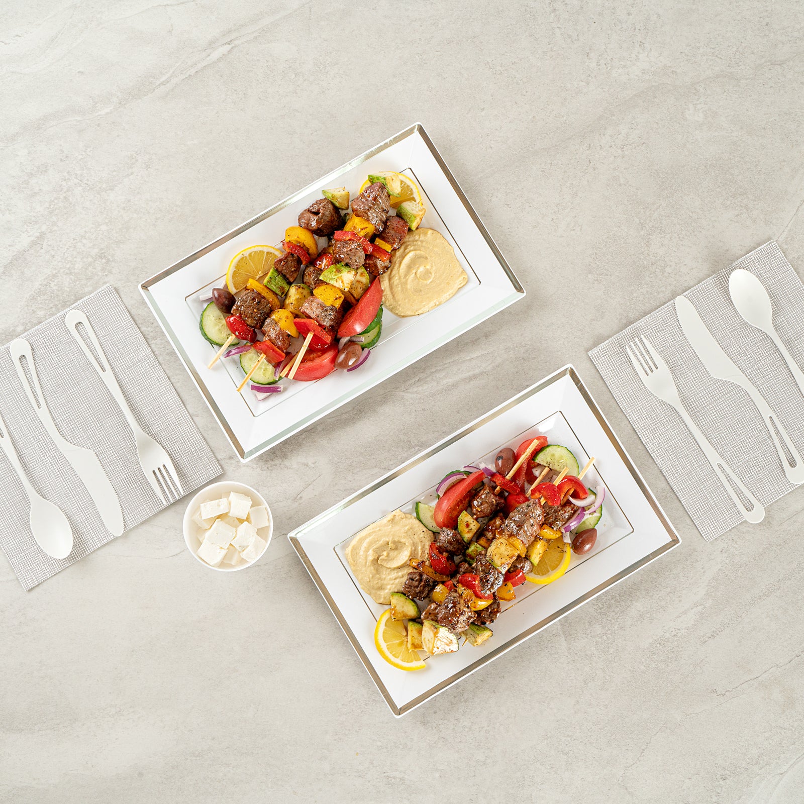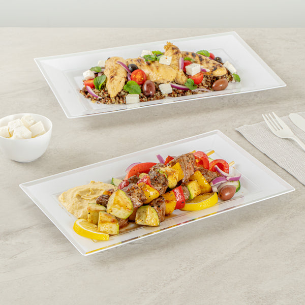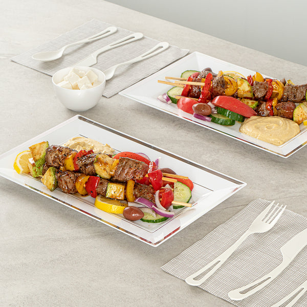 Ensure a clean and chic presentation with elegant disposable tableware. The Moderna Rectangle White Plastic Silver-Rimmed Plates feature a greaseproof surface that keeps every meal looking pristine, making them perfect for upscale dining and catering events. These rectangular plastic plates, crafted from premium plastic, are cold food friendly, ensuring that chilled desserts and salads are served at their best. With a sophisticated silver rimmed design, these plates not only elevate your tablescape but also optimize space on buffet displays, allowing for a versatile dining setup. Measuring 11.5 inches in length and 7.25 inches in width, their substantial size accommodates a variety of dishes, enhancing operational efficiency at restaurants and catered events. Embrace sustainable dining with recyclable materials, offering an eco-friendly solution without compromising style. Elevate your foodservice experience with convenience and elegance. Each order includes 100 plates.