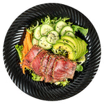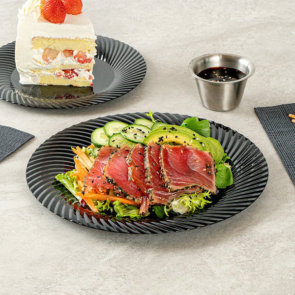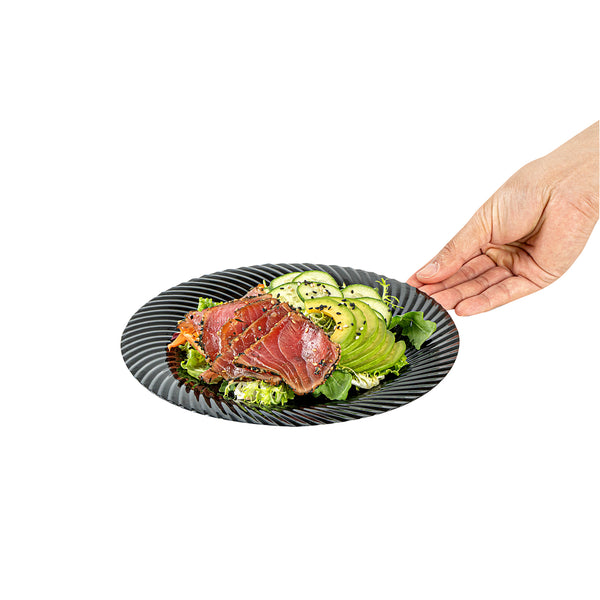 Elevate your dining experience with sophisticated presentation. The Moderna Sophisticated Design Black Plastic Plates feature an elegant wave pattern that enhances the visual appeal of your culinary creations, making them ideal black plastic plates for upscale events. With a 9-inch by 9-inch dimension, these seashell plates are designed to accommodate both hot and cold dishes, providing versatility in foodservice environments. Made from recyclable plastic, these plastic serving plates offer an eco-friendly alternative, supporting sustainability initiatives without compromising on style or functionality. Their sturdy construction ensures that they remain cold food friendly, making them perfect for various catering occasions. Upgrade your serveware and impress guests by choosing these stylish and sustainable options. Each order includes 200 Moderna Sophisticated Design Black Plastic Plates.