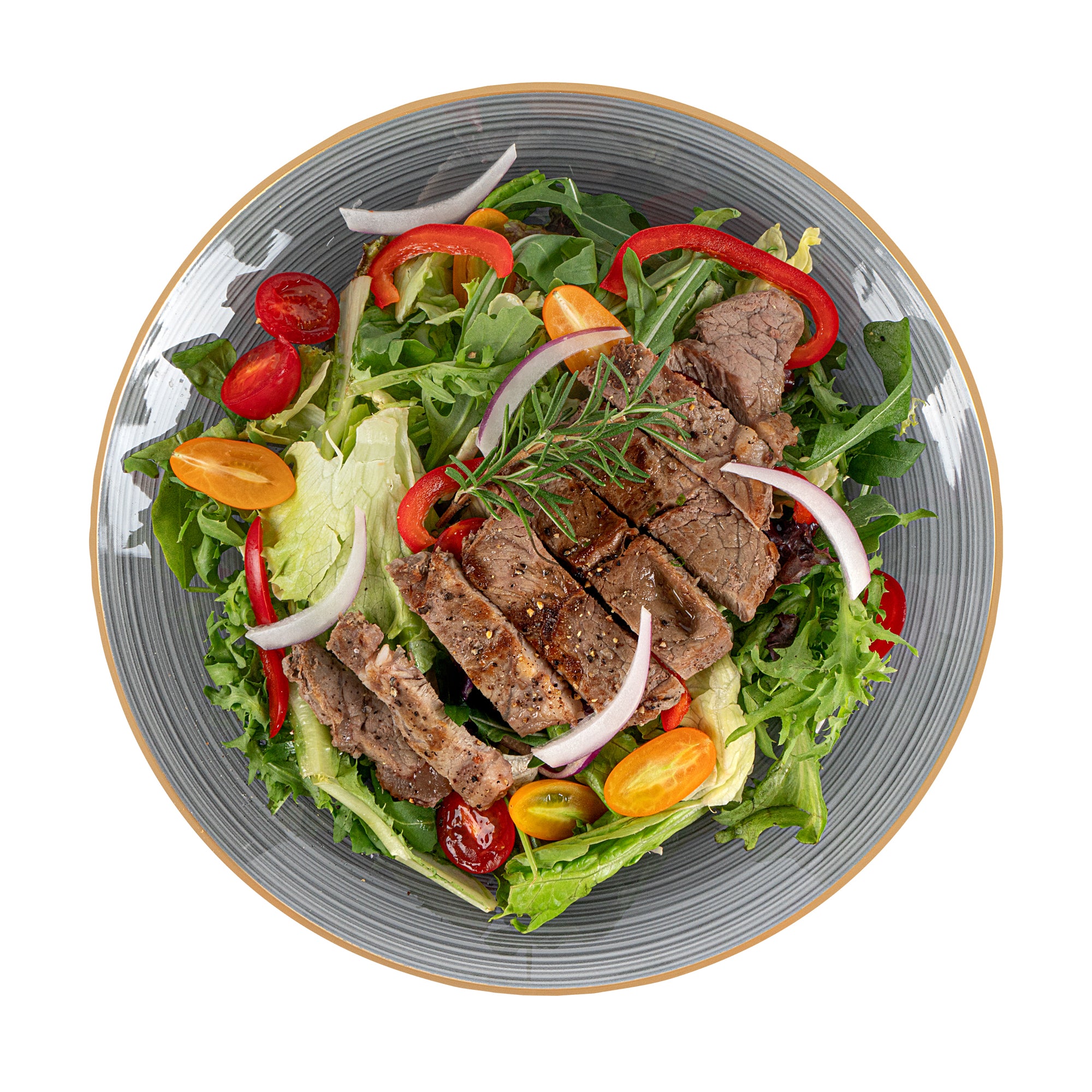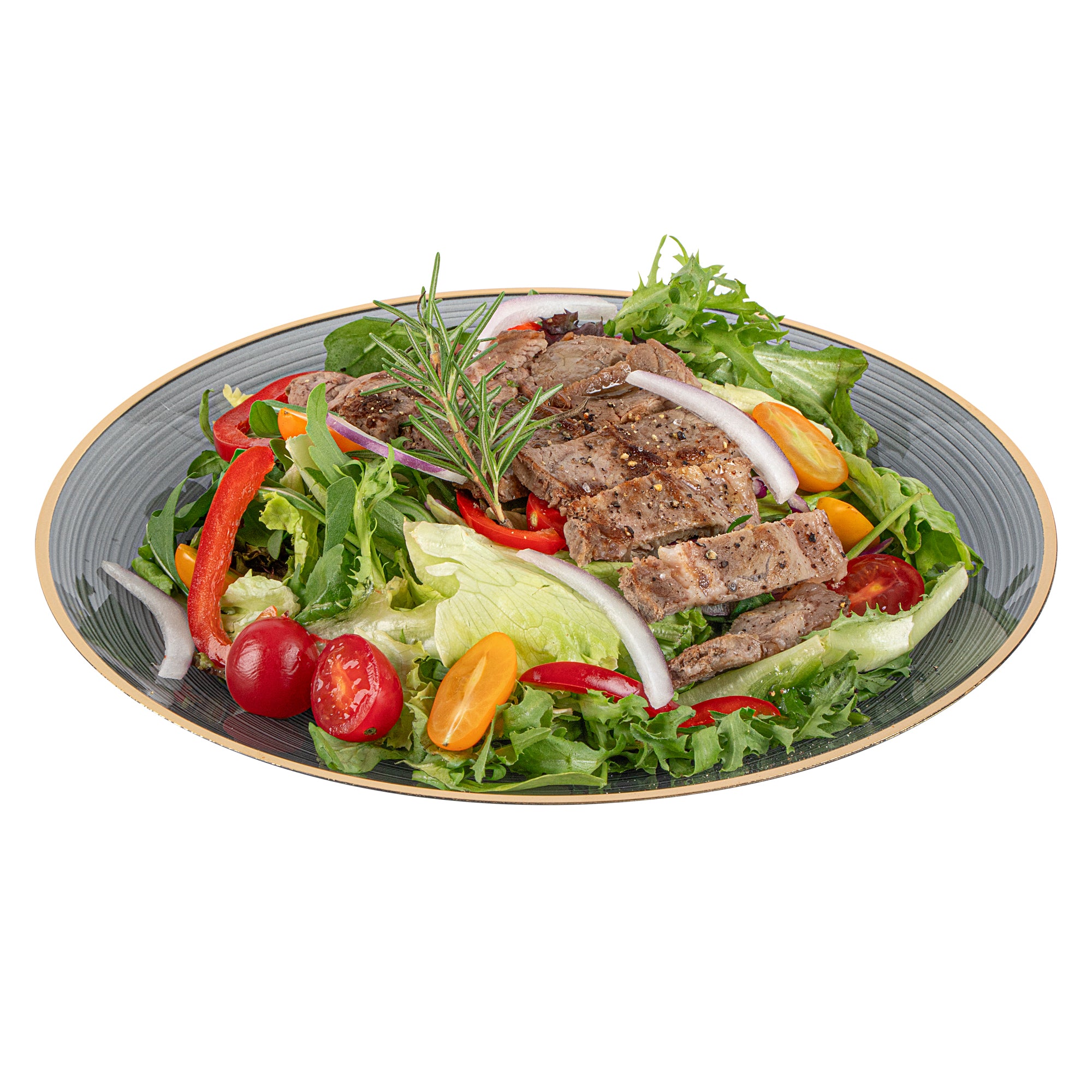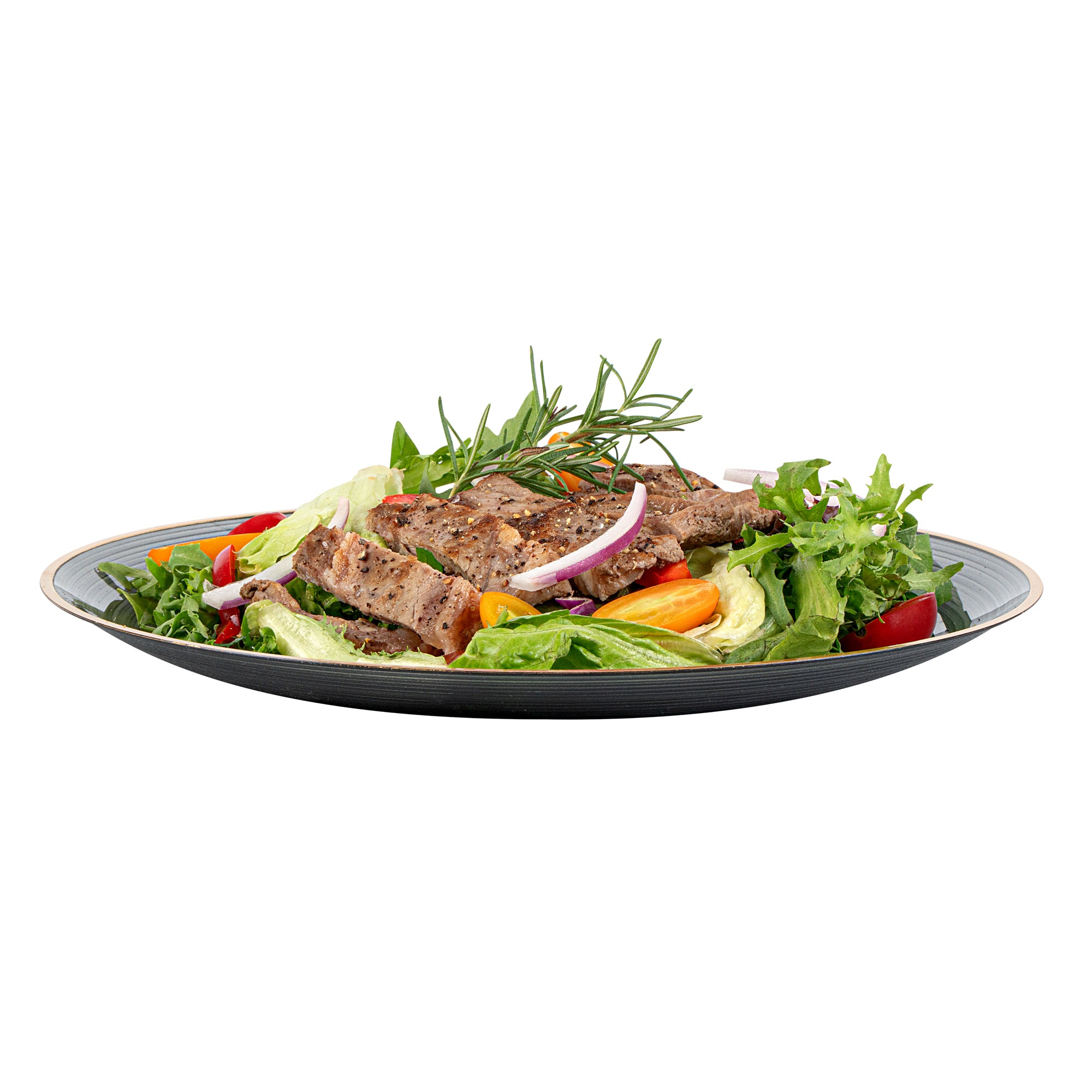 ROUND BLACK TRANSLUCENT PLASTIC GOLD-RIMMED PLATE - RIPPLED