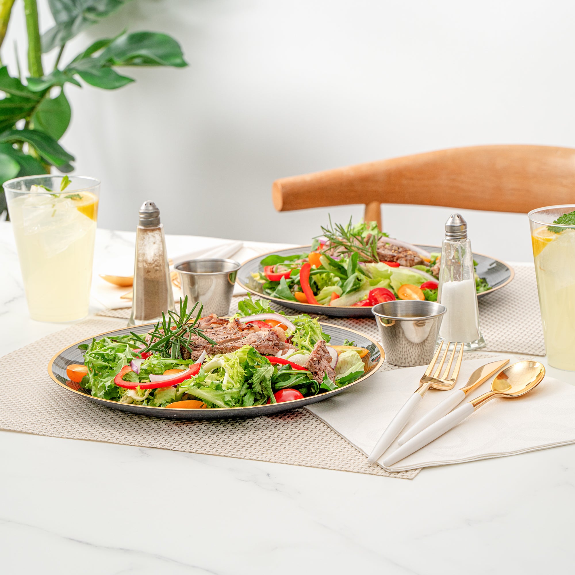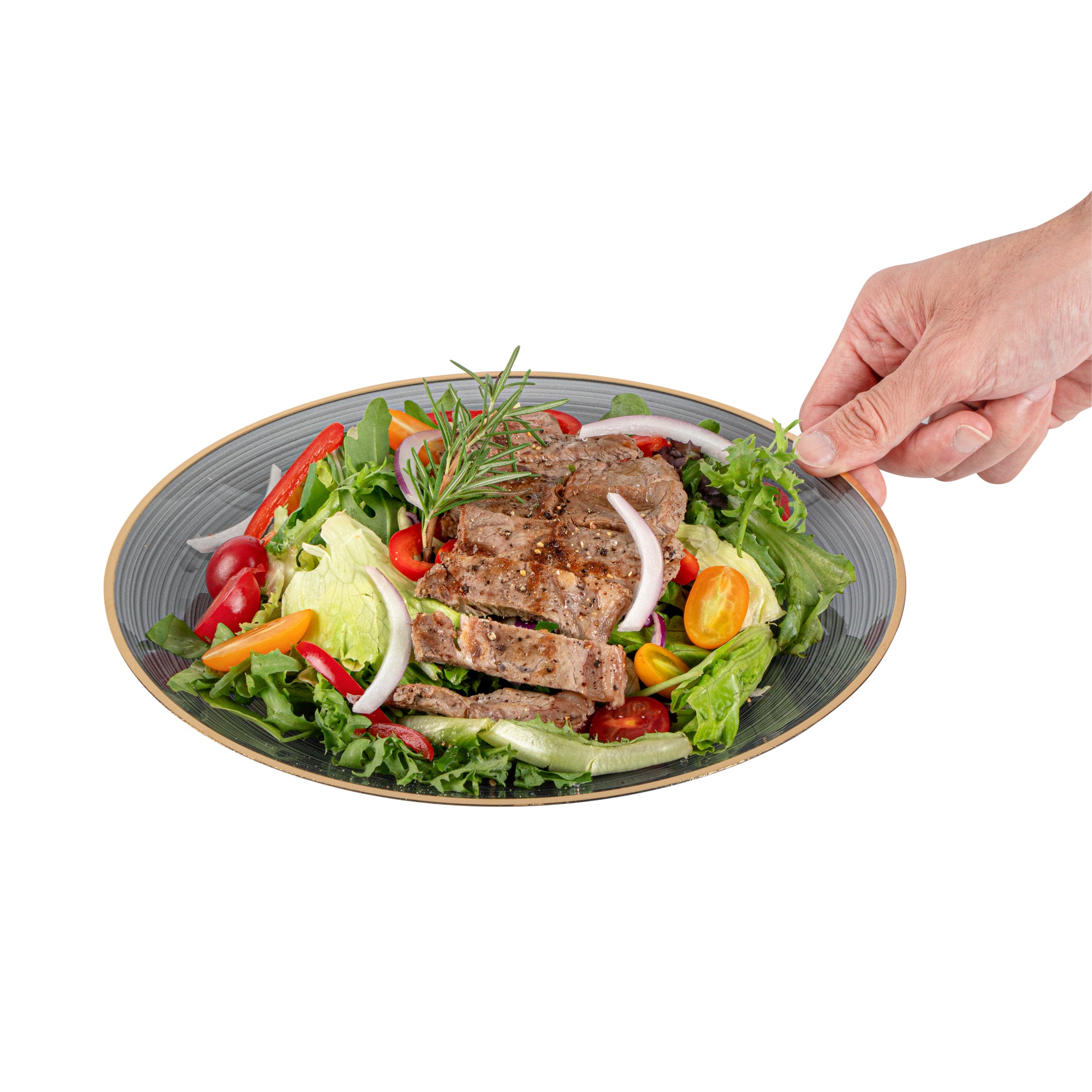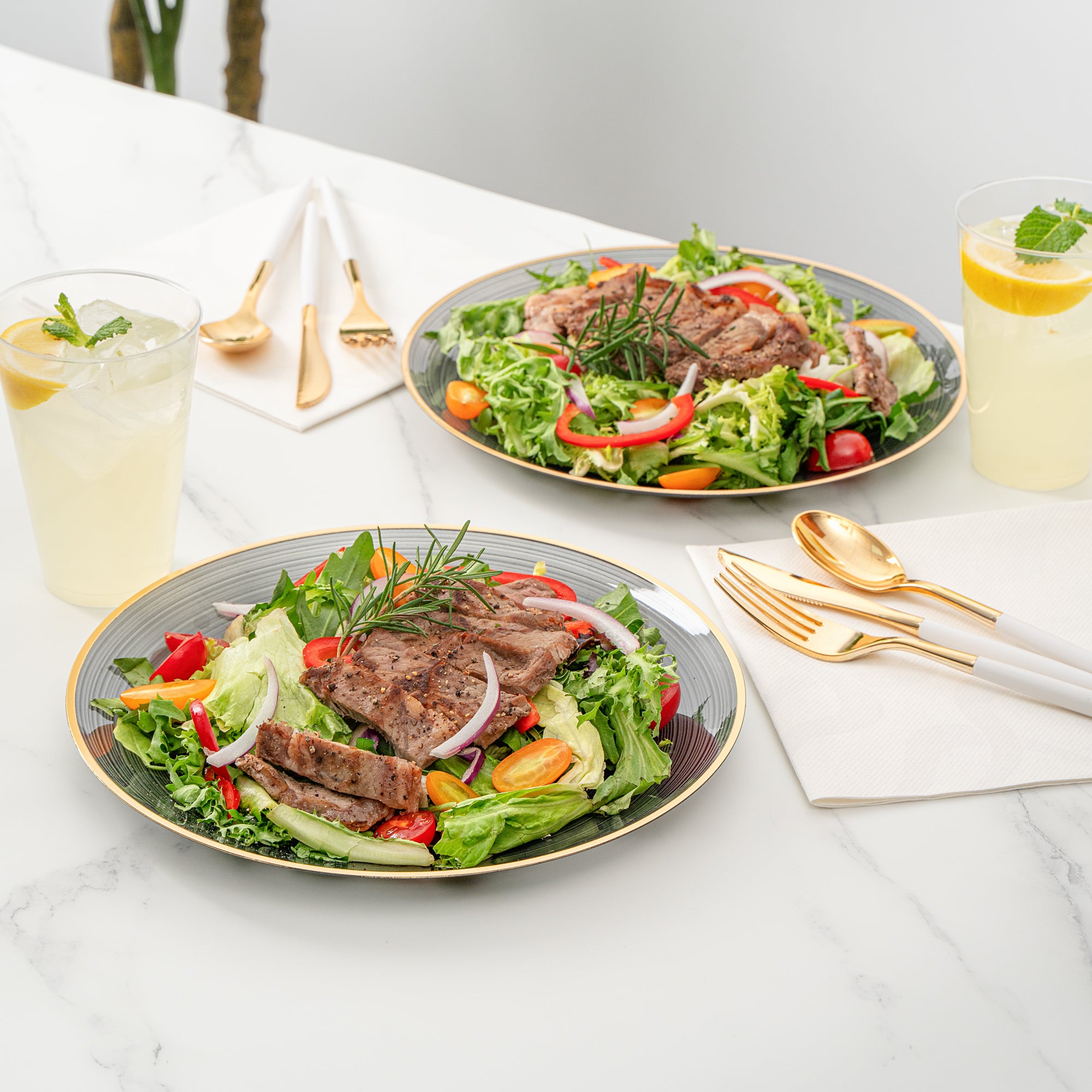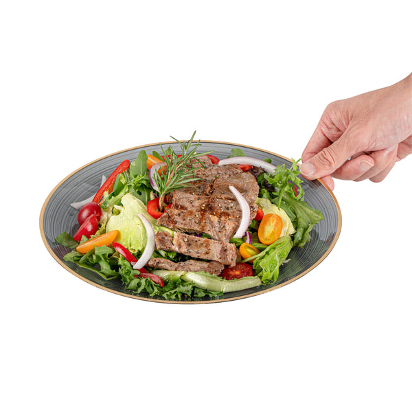 Enhance your event's elegance with disposable ease. The Moderna Secure-Grip Plastic Dinner Plates combine a rippled surface for secure handling with a sophisticated crystal design, making them the ideal plastic dinner plates for upscale occasions. Measuring 10.1 inches in diameter, these elegant disposable plates feature a striking gold rim that elevates table presentations, perfect for weddings and corporate events. Their disposable nature allows for quick cleanup, saving valuable time for busy caterers. Made from durable plastic, these plates ensure reliable use without compromising on safety, making them the preferred choice for gold rim plates at stylish gatherings. The translucent black color with a gold rim complements diverse event themes, adding an extra touch of sophistication to your table settings. Upgrade your event with these stylish and functional plates today! Each order includes 20 Moderna Secure-Grip Plastic Dinner Plates.