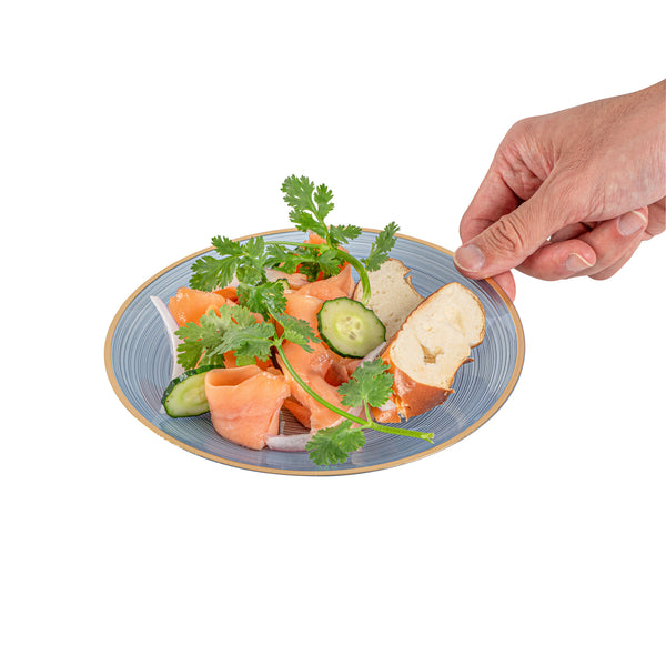 ROUND BLUE TRANSLUCENT PLASTIC GOLD-RIMMED PLATE - RIPPLED