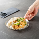 Create a lasting impression with our Moderna Round Clear Plastic Gold-Rimmed Plates. The hammered textured design of these plates with gold trim enhances the overall look of the plate. Made from high-quality PS plastic, these plates are sturdy and robust enough to hold even the heaviest meals. The striking combination of clear and gold on these disposable plates adds a touch of refinement to your food presentation. These plates are suitable for both warm and cold dishes as they withstand temperature up to 150F, making them a versatile option for any cuisine. The greaseproof material prevents oils from leaking and is an ideal choice for messy foods. Plus, these heavy-duty plastic plates are recyclable, making them a more eco-friendly choice. The disposable design of these fancy dinner plates makes cleanup a breeze. The clear finish of these plastic plates adds an elegant touch to your food display. Measuring 7.1 inches in diameter, these party plates are ideal for serving entrees and desserts. Shipped in a 40 count box.