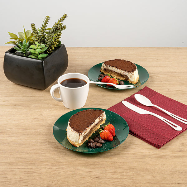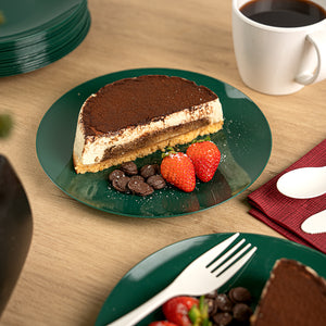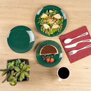 Enhance your event's elegance with versatile dining solutions. Moderna Recyclable Plastic Plates provide the perfect balance of style and functionality, with a 7.5-inch size ideal for serving an array of dishes. These 7.5 inch plastic plates are designed to accommodate both warm and cold foods, ensuring versatility in any foodservice setting. Made from recyclable plastic, they offer a sustainable alternative to traditional disposable party plates, supporting eco-friendly operations without sacrificing quality. The forest green finish of these plastic appetizer plates adds an elegant backdrop that beautifully complements your culinary creations, making each dish stand out. With a greaseproof and durable design, these plates maintain their integrity, reducing the risk of leaks or mess during service. Elevate your presentation and streamline your operations with these adaptable plates. Each order includes 40 Moderna Recyclable Plastic Plates.