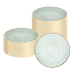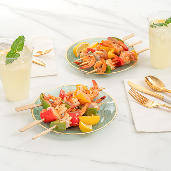Elevate your event with elegant and disposable tableware. The Moderna Elegant Design Green Plastic Disposable Plates feature a chic crystal design that elevates table settings, perfect for upscale events. These gold rimmed plates incorporate a rippled texture with a gold rim for a sophisticated look, ensuring a standout presentation for weddings and corporate gatherings. With a secure-grip design, these appetizer plates prevent spills during service, enhancing guest experiences. Made from high-quality plastic, they measure approximately 7.13 inches in diameter, ideal for serving appetizers, salads, or desserts. These disposable plates offer the convenience of quick and efficient cleanup, saving labor costs by eliminating post-event dishwashing. Add a touch of color to your table with their translucent green hue. Make your next gathering unforgettable with these versatile and practical plates. Each order includes 100 Moderna Elegant Design Green Plastic Disposable Plates.
