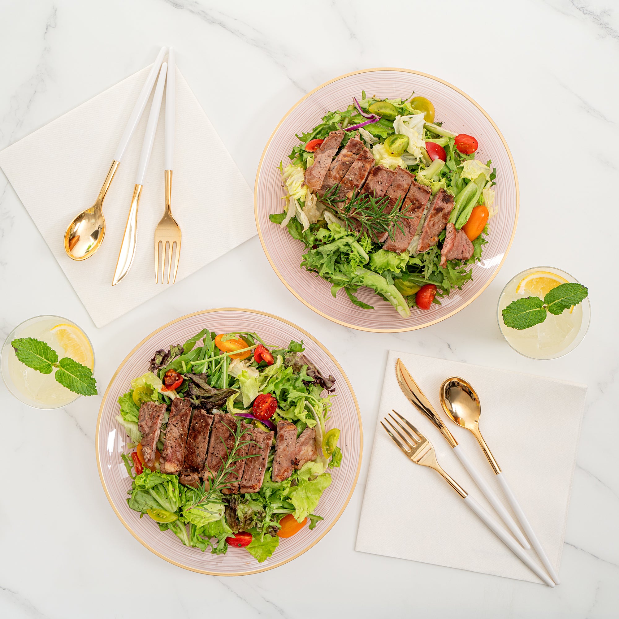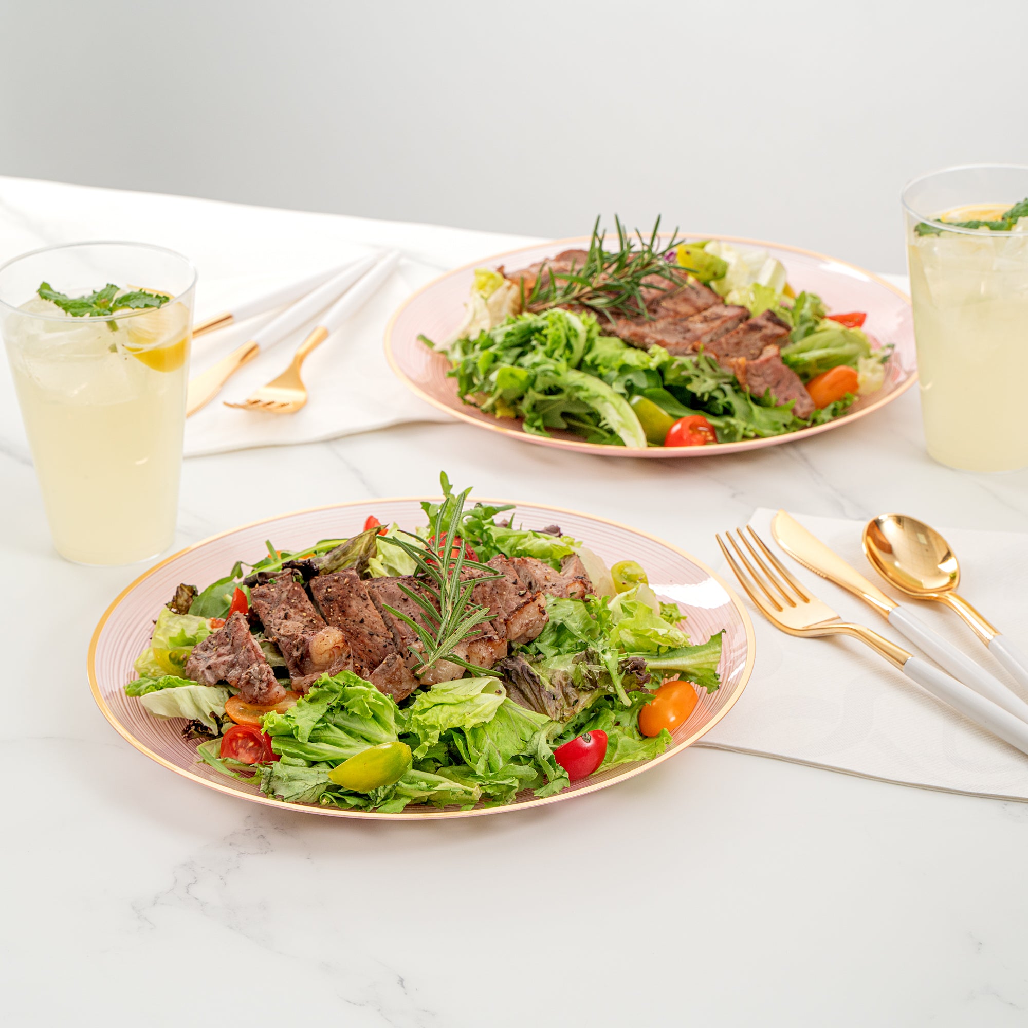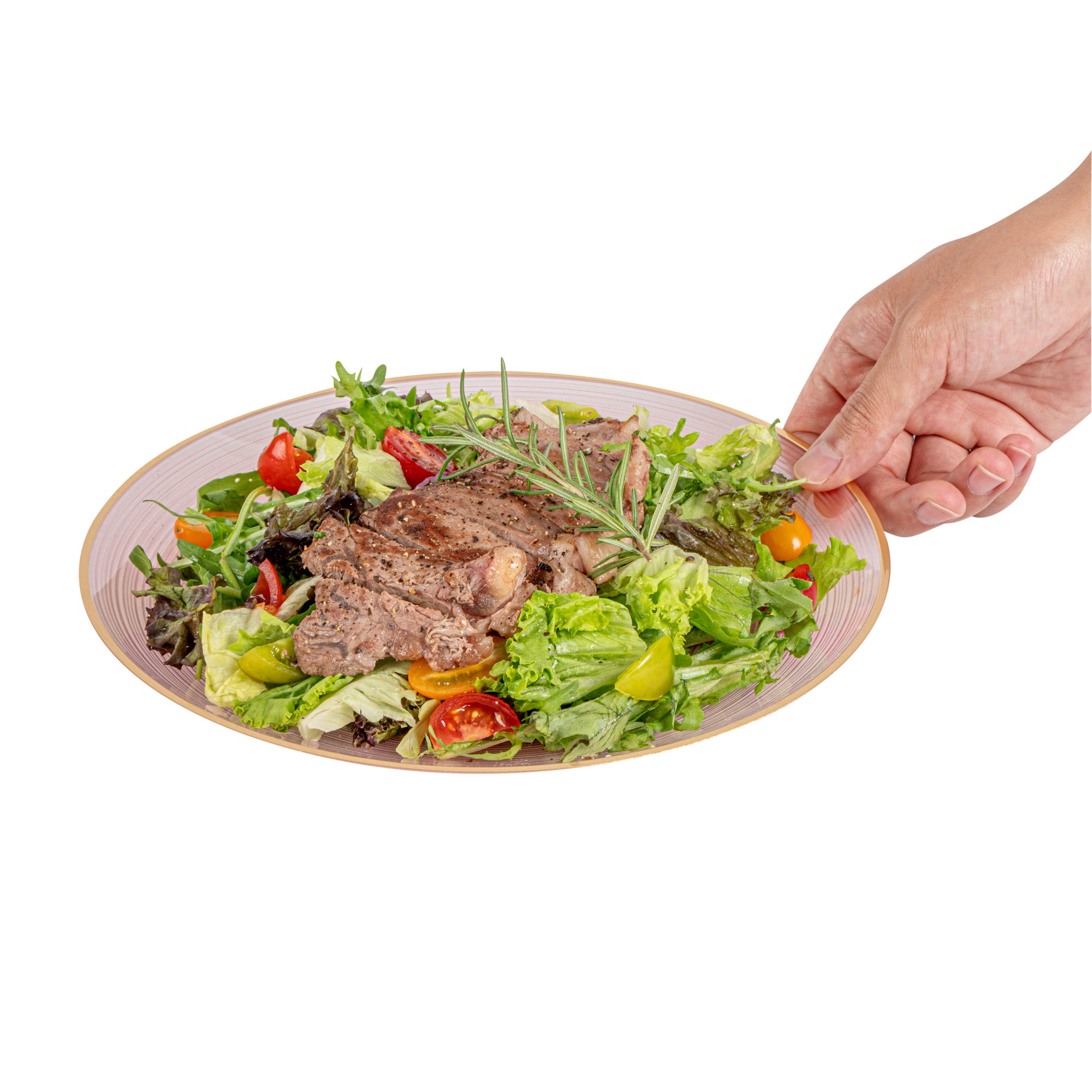 Enhance your event with chic, disposable plastic plates. The Crystal Design Plate Collection offers stunning Moderna Pink Disposable Plastic Plates that seamlessly blend elegance and convenience. These plates feature a rippled design with a gold rim, adding a sophisticated touch to any table setting, ideal for catering events or elegant dining. Crafted from durable plastic, these gold rim plastic plates ensure sturdiness and reliability, perfect for showcasing main courses and large appetizers at weddings and banquets. The translucent pink color provides a unique and stylish appearance, complementing diverse themes. With a 10-inch diameter, these plates offer ample space for your culinary creations. The secure-grip design prevents spills during service, ensuring a smooth dining experience. Embrace effortless cleanups with these disposable plates, saving valuable time and labor costs. Each order includes 100 Moderna Pink Disposable Plastic Plates.