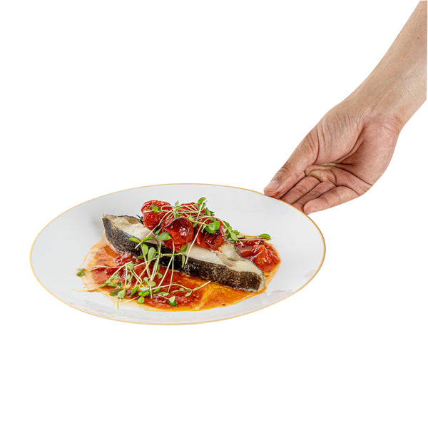 ROUND WHITE PLASTIC GOLD-RIMMED PLATE
