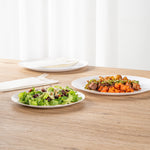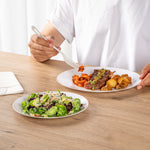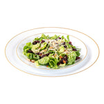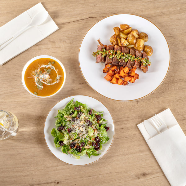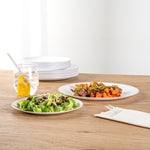 Elevate the sophistication of your dinner party with our Moderna Round White Plastic Gold-Rimmed Plates. Made from high-quality polystyrene plastic, these plates are strong and durable enough to support even the heaviest meals. These gold-rimmed plates come in two different sizes in the set, providing you with versatile options for your dinner presentation needs. The elegant gold rim design of these greaseproof plastic plates adds an enchanting touch to your table, creating an overall aesthetic appeal. These round dinner plates can be used for warm and cold foods, as they withstand temperatures up to 150F. To make post-event clean-up a breeze, these round plastic plates are disposable. These round white plates are also eco-friendly as they are recyclable, reducing your carbon footprint. With their classic white finish, these plastic dinner plates are a perfect choice for enhancing any tablescape and impressing your guests. Each set comes with 2 white plastic dinner plates measuring 7 and 10 inches in diameter, making them ideal for serving lasagna, pasta, and braised chicken. Shipped in a 40 count box.