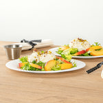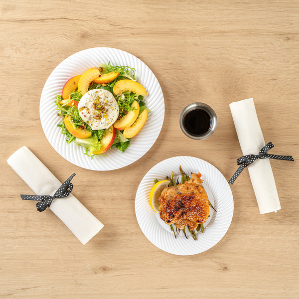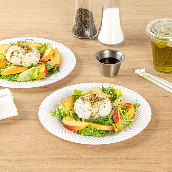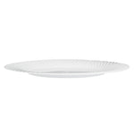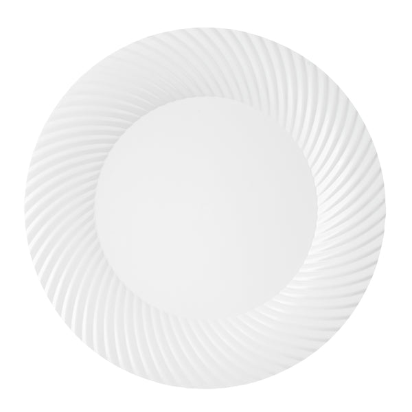 Enhance your table setting with our Moderna Round White Plastic Wave Plates. Made from durable PS plastic, these round dinner plates are sturdy to hold heavy foods. Fashioned with a wave pattern, these unique dinner plates add an elegant touch to your party tablescape. These premium plastic plates are recyclable, minimizing your carbon footprint at your event. Withstanding up to 150F, these white plastic plates allow you to serve warm and cold foods comfortably. These heavy-duty dinner plates are greaseproof to keep your tablescape tidy. To avoid tedious washing after events, these fancy plastic plates are conveniently disposable. Featuring a white finish, these greaseproof plastic plates add an attractive touch to your tableware. Measuring 9 inches in diameter, these white plastic plates are ideal for serving all kinds of starters, entrees, and desserts. Shipped in a 200 count box.