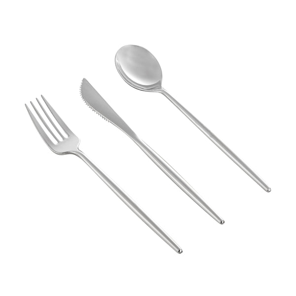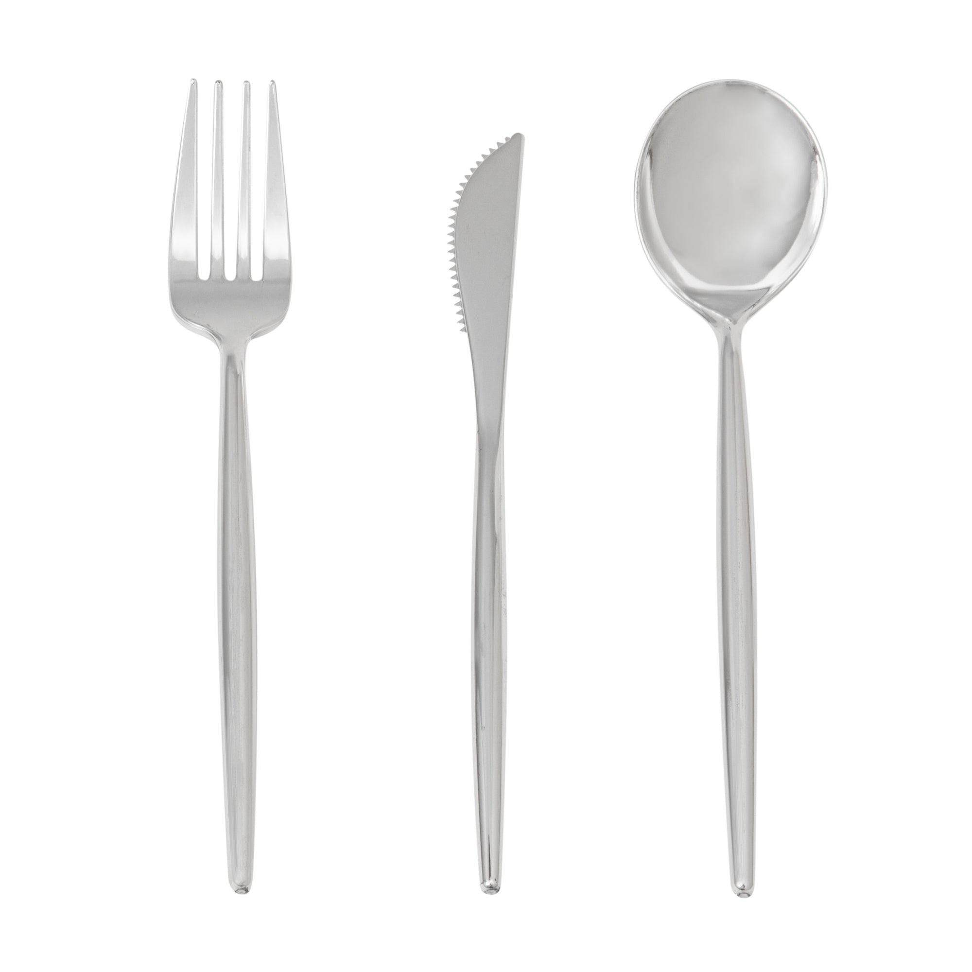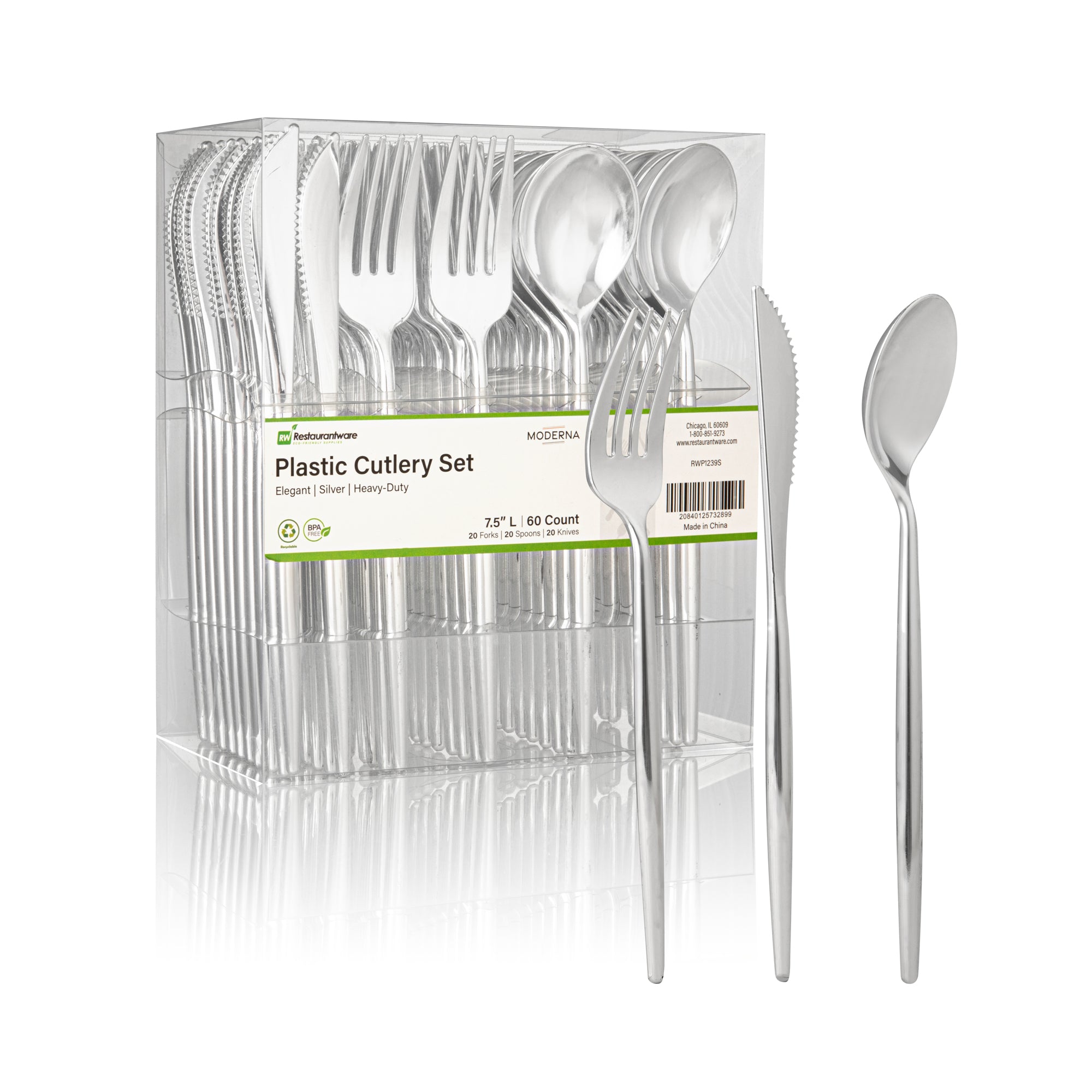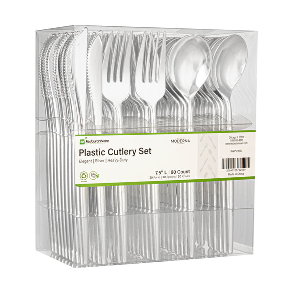 Immerse your table settings in sophistication using our Moderna Silver Plastic Cutlery Sets. Meticulously crafted from premium polystyrene plastic, these recyclable party cutlery sets offers a refined dining experience. The reinforced handle of these heavy duty plastic flatware sets prevents any breakage even when tackling hard foods. The sleek silver finish of these disposable cutlery sets effortlessly enhances your table decor, providing a subtle touch of elegance. With 20 forks, 20 knives, and 20 spoons, these silver plastic cutlery sets are ideal for large-scale events. To streamline cleanup, these plastic flatware sets are disposable. Each utensil in these party cutlery sets measures 7.5 inches long. Shipped in a 60 count box.
