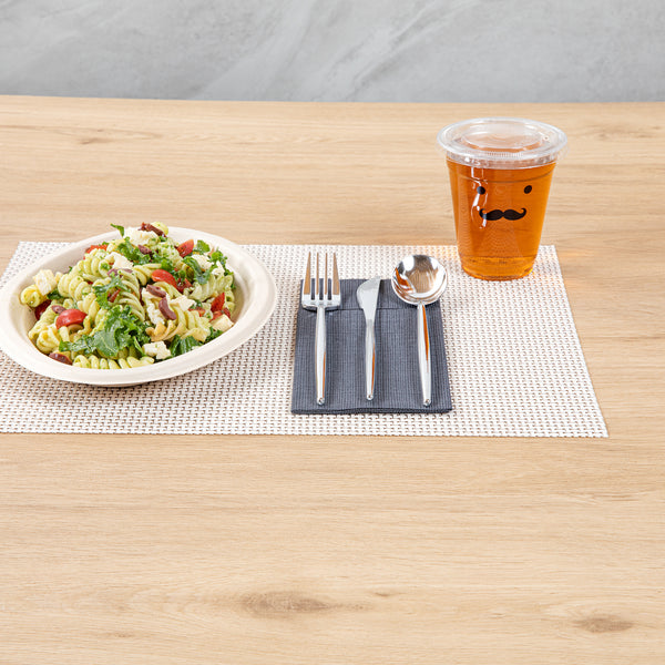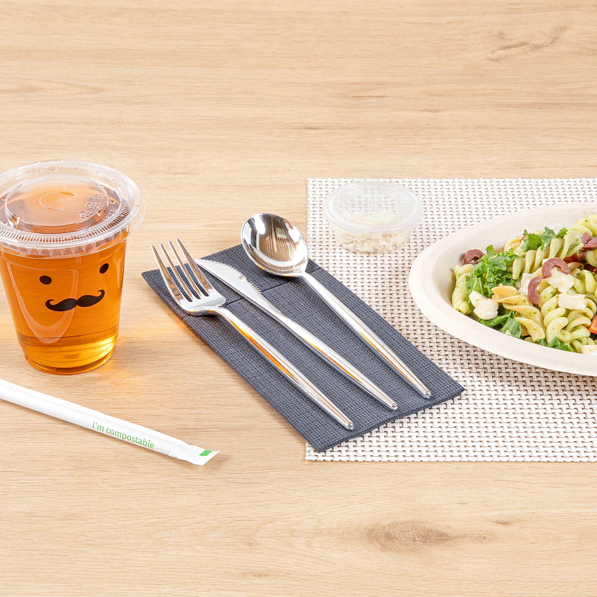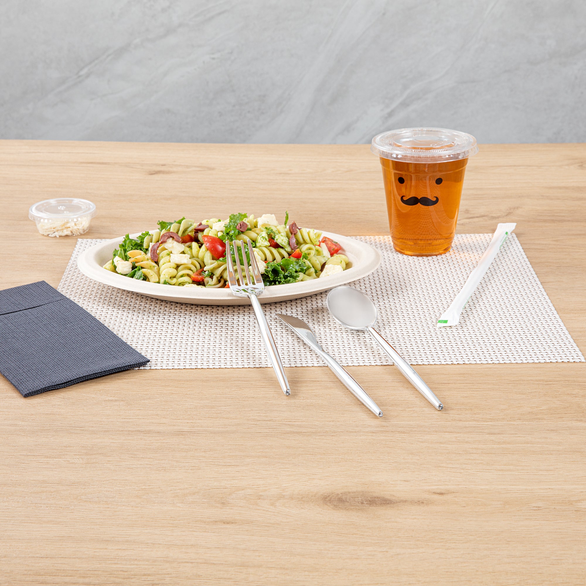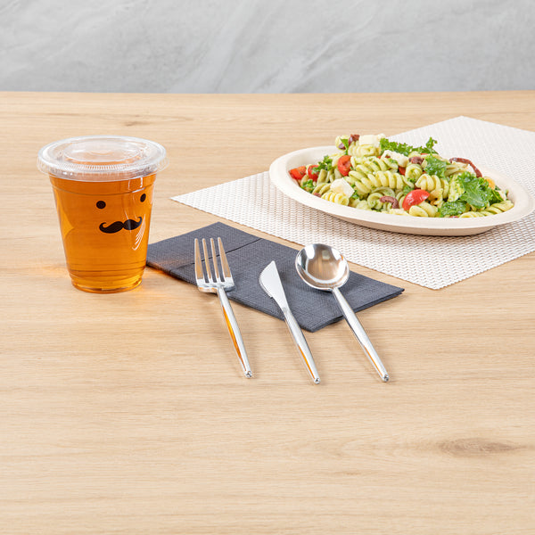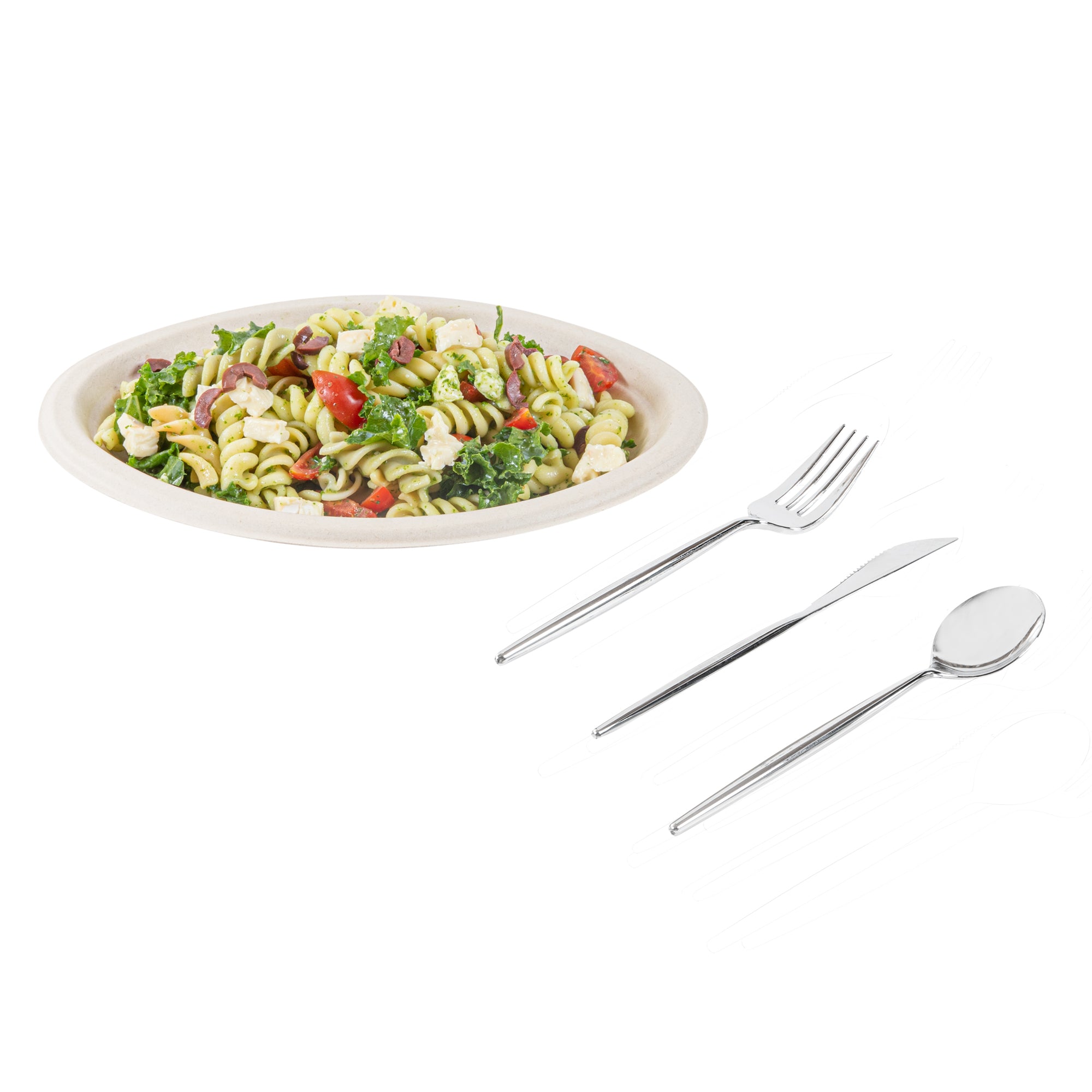 Immerse your table settings in sophistication using our Moderna Silver Plastic Cutlery Sets. Meticulously crafted from premium polystyrene plastic, these recyclable party cutlery sets offers a refined dining experience. The reinforced handle of these heavy duty plastic flatware sets prevents any breakage even when tackling hard foods. The sleek silver finish of these disposable cutlery sets effortlessly enhances your table decor, providing a subtle touch of elegance. With 20 forks, 20 knives, and 20 spoons, these silver plastic cutlery sets are ideal for large-scale events. To streamline cleanup, these plastic flatware sets are disposable. Each utensil in these party cutlery sets measures 7.5 inches long. Shipped in a 60 count box.