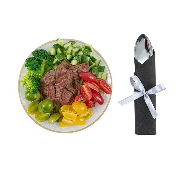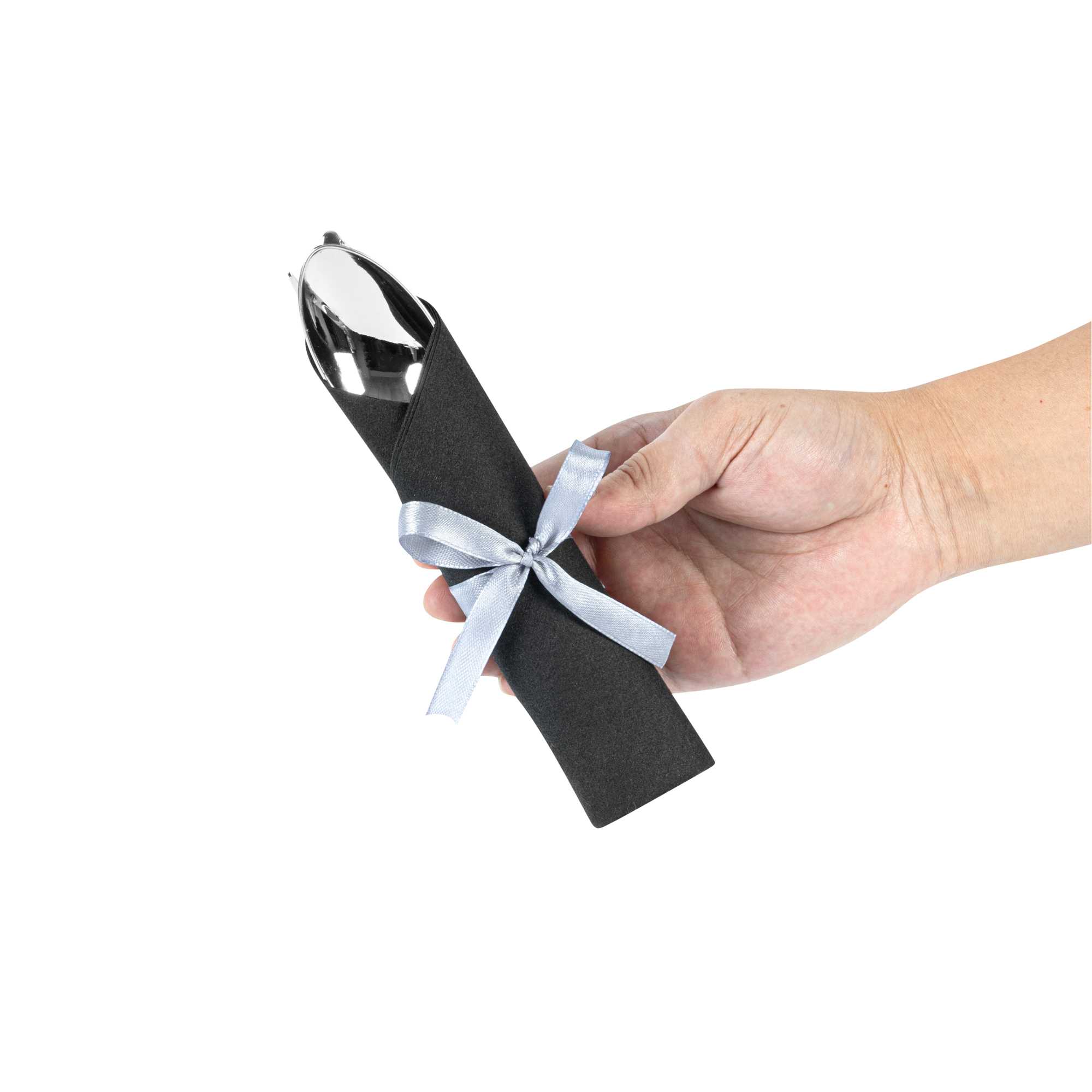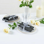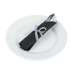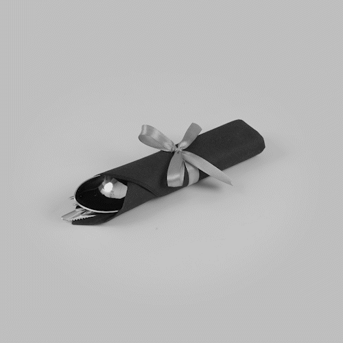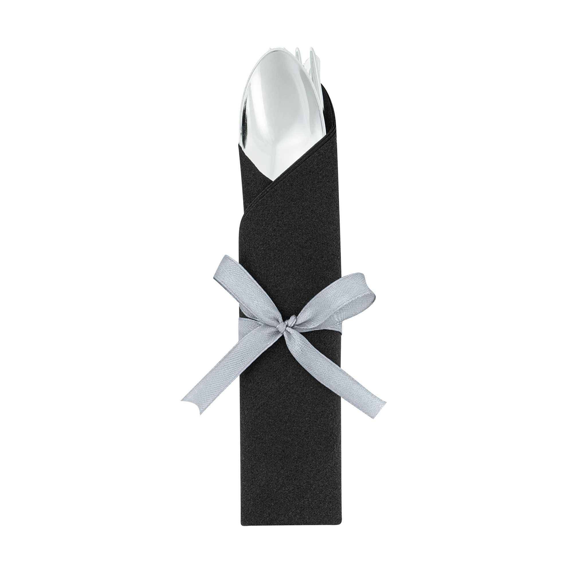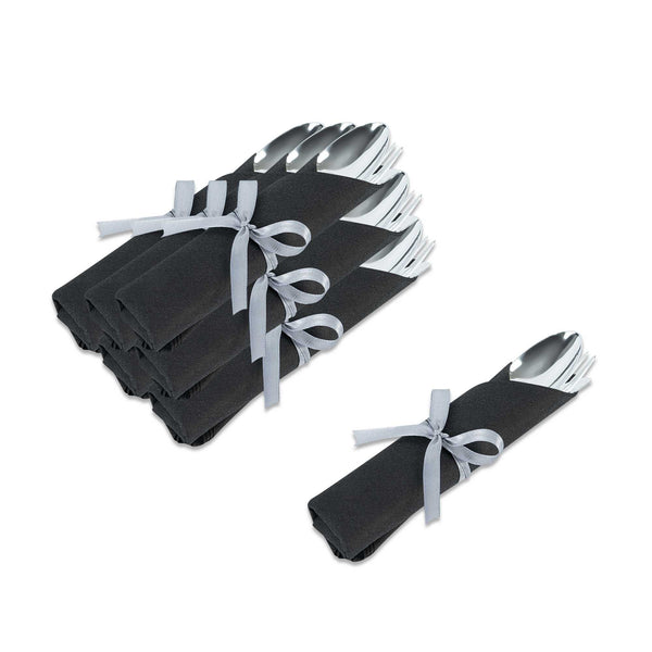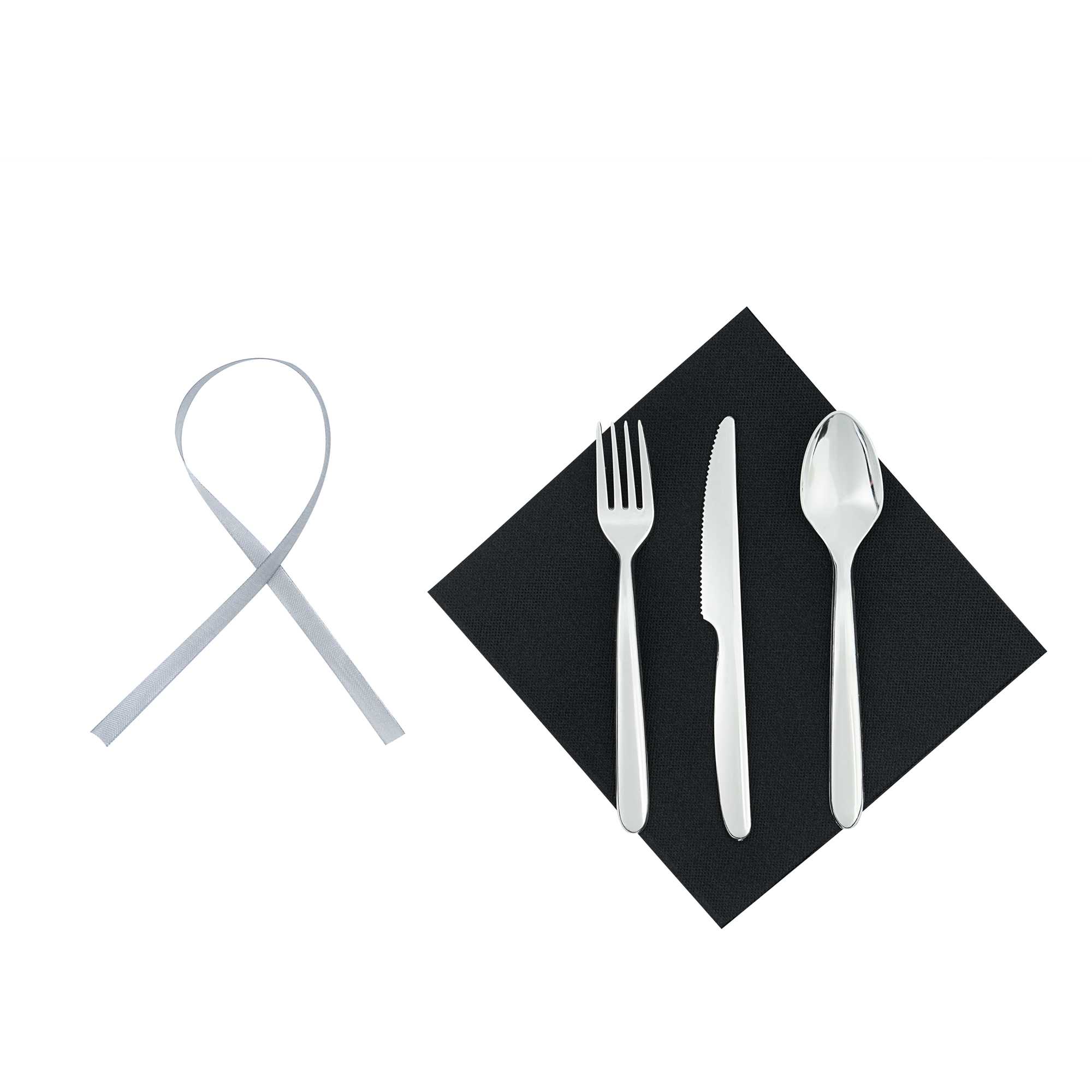 SILVER PLASTIC CUTLERY SET - WITH BLACK NAPKIN, SILVER RIBBO