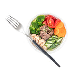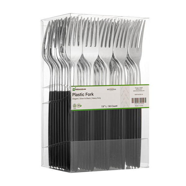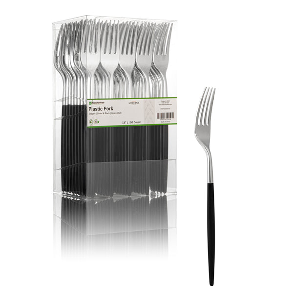 Easily pierce into foods with our Moderna Silver Plastic Forks. Made from durable polystyrene plastic, these plastic forks are durable for poking hard foods. This plastic cutlery doesn't leach unwanted substances into your food. Withstanding 167F, these silver forks handle warm and cold foods effortlessly. These silver forks with black handles are recyclable, minimizing your carbon footprint. For seamless disposal, these fancy plastic silverware are conveniently disposable after large events. The silver and black finish of these fancy plastic utensils adds an elegant touch to your tablescape. Each plastic fork measures 7.5 inches long. Shipped in a 50 count box.