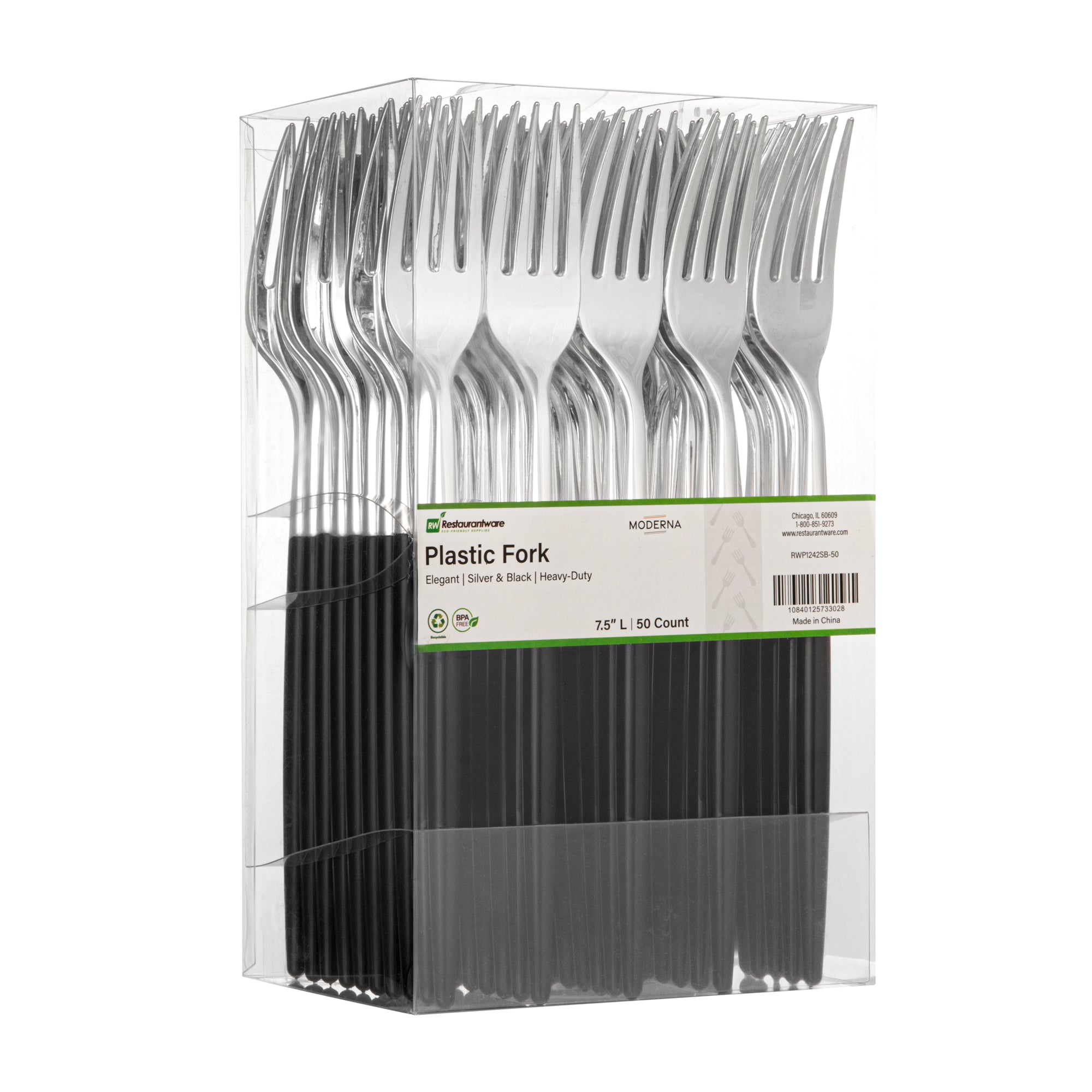 Easily pierce into foods with our Moderna Silver Plastic Forks. Made from durable polystyrene plastic, these plastic forks are durable for poking hard foods. This plastic cutlery doesn't leach unwanted substances into your food. Withstanding 167F, these silver forks handle warm and cold foods effortlessly. These silver forks with black handles are recyclable, minimizing your carbon footprint. For seamless disposal, these fancy plastic silverware are conveniently disposable after large events. The silver and black finish of these fancy plastic utensils adds an elegant touch to your tablescape. Each plastic fork measures 7.5 inches long. Shipped in a 500 count box.